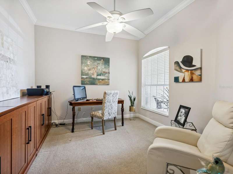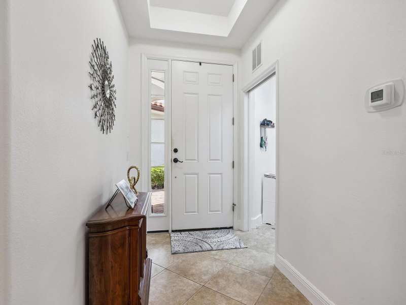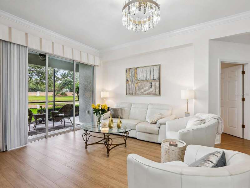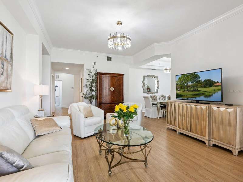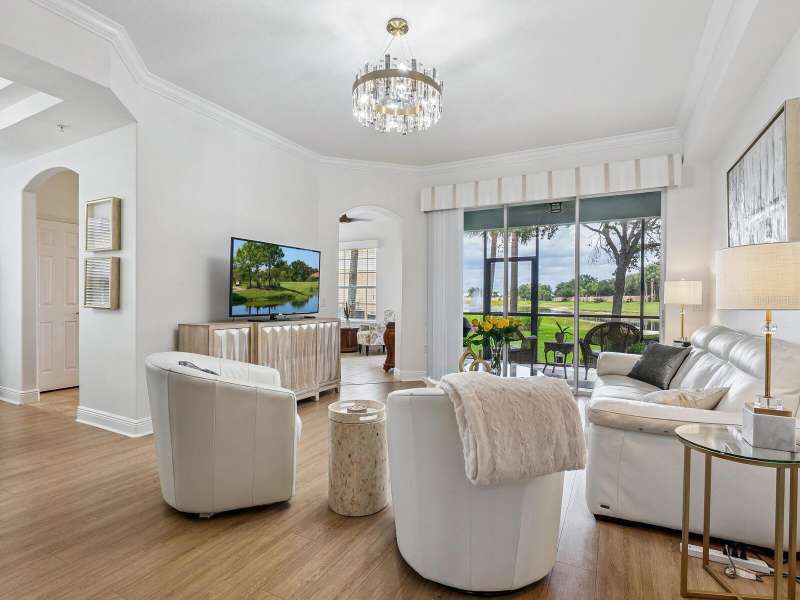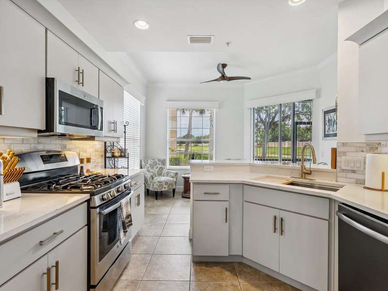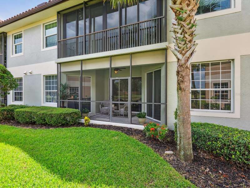 Welcome to this 2 BR, 2 Bath, plus den beautifully updated ground floor END-UNIT condo in Miramar, ideally situated in a premier location with long water and fountain views. From the moment you step inside, you’ll notice the thoughtful updates, elegant finishes, and inviting spaces that make this home truly move-in ready. A host of architectural details include tray ceilings in foyer and dining room, crown molding throughout living area and Owner’s Retreat, rounded corners and freshly painted interior. This stunning unit features new laminate flooring in the living room, dining room and primary bedroom, along with new carpet in the guest bedroom and den. The spacious and newly remodeled kitchen is a true highlight, boasting quartz countertops, soft-close cabinetry with pull-outs, a gas range, stainless steel appliances, designer backsplash, under-cabinet lighting, and upgraded sink and faucet. Pamper yourself in the spa-like primary suite offering a large walk-in closet, dual vanities, comfort-height toilet, separate shower, and a relaxing garden tub. Additional features include a screened porch overlooking the lake, new tankless hot water heater (2023) newer A/C (2019), tile floors in foyer, kitchen, baths, and laundry, and a laundry room with upper cabinets. The garage includes built-in cabinet storage and painted floor. Mature landscaping, tasteful window treatments, exquisite light fixtures, and fire sprinklers throughout complete this charming home in a sought-after location. Enjoy amenities galore at Miramar, including a large, heated pool and spa, spacious clubhouse with a full kitchen, conference room, well-equipped fitness center, outdoor BBQ, and dock with gazebo to capture serene sunsets. Ideally located to I-75, the Sarasota and Tampa Airports, University Town Center Mall, Lakewood Ranch Main Street and Waterside dining and shopping, too many golfing venues to list, and a myriad of renowned Gulf Coast beaches. Whether you are seeking a leisurely day at the beach or a vibrant night out on the town, the possibilities are endless in this coveted Lakewood Ranch community. Paradise awaits!