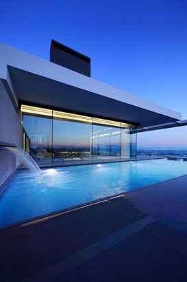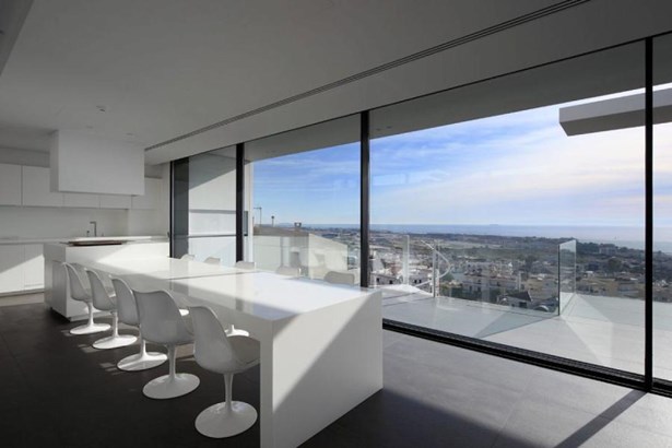 The living room is truly breathtaking, offering stunning views of the city, mountains, and sea. The minimal design of the space enhances the feeling of openness and modernity, making it the perfect spot for relaxation or entertaining guests.