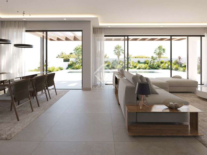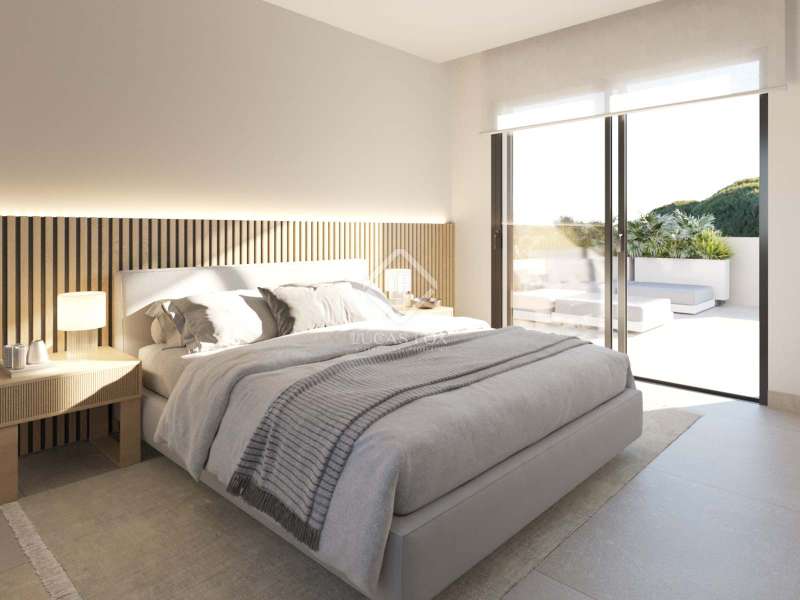 These 5 contemporary villas for sale are located close to the beach of Cala Llenya and 3km from the village of San Carlos. The homes boast an attractive modern design incorporating the highest quality finishes to create a unique, luxurious home. Each villa has a private garden, a private swimming pool and access to a wonderful common garden of 2,500 sqm, a 233 sqm social club (the owners can use the space as a gym, spa, children's' play room, etc) with kitchen and covered terrace. Bathrooms and showers are available for the owners near the padel court and the community pool, which is surrounded by a beach area finished with ceramic pavement. On the same spot each villa has an extra storage space of 20 sqm - the perfect place to drop all the beach items, to store bikes etc, before entering home. The whole community space benefits from a low contamination lighting system designed to ensure the comfort for the homeowners. The Mediterranean garden has been designed to be easily maintained while keeping the authentic Ibizan nature, by using local plants which adapt perfectly to the climate with minimal maintenance. Being walking distance to the beach of Cala Llenya, the perfect setting to enjoy the beautiful natural surroundings without the typical party tourism and at the same surrounded by other nationalities who chose this peaceful part of the island.