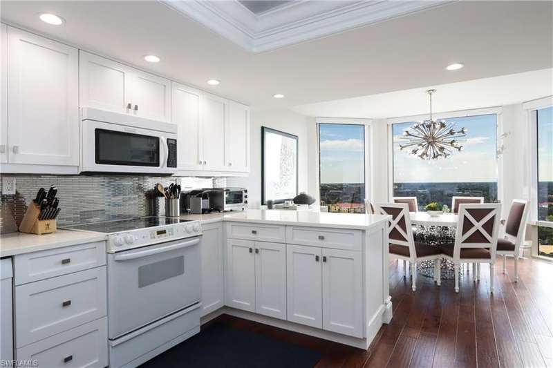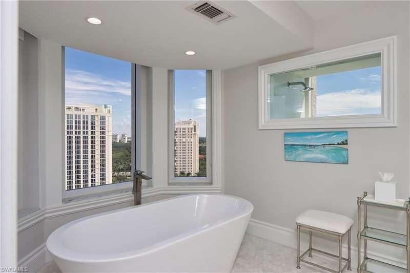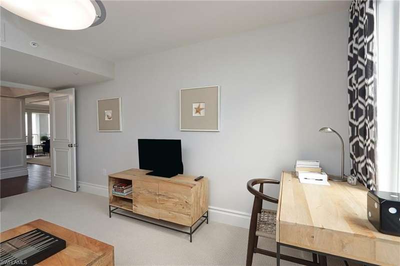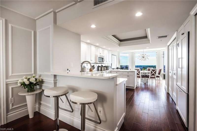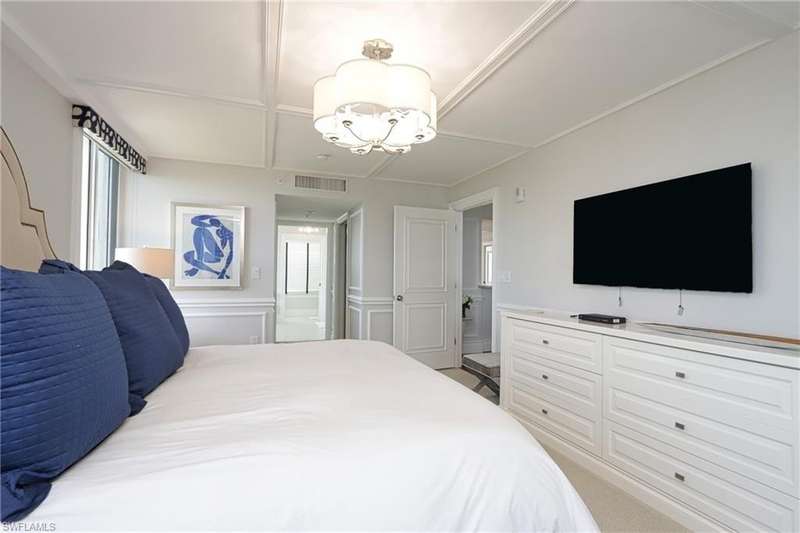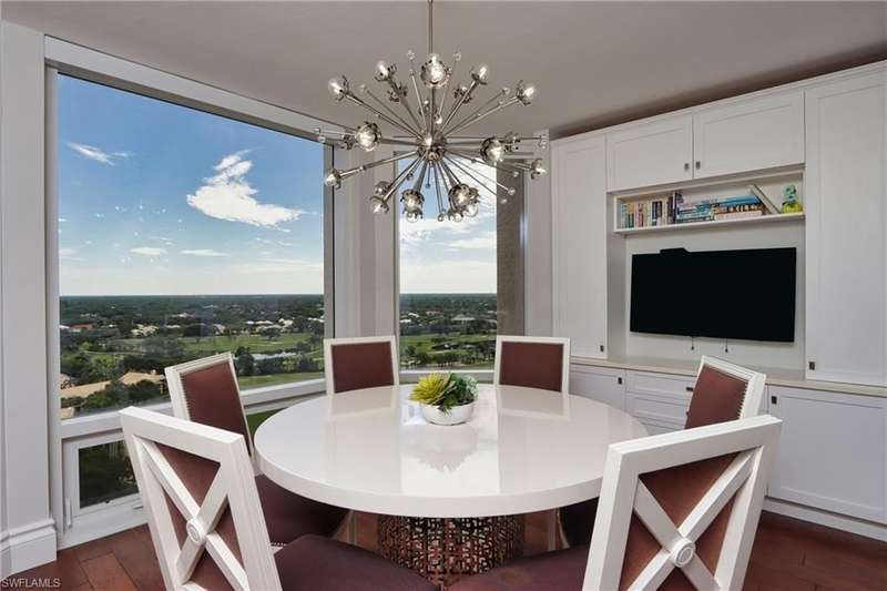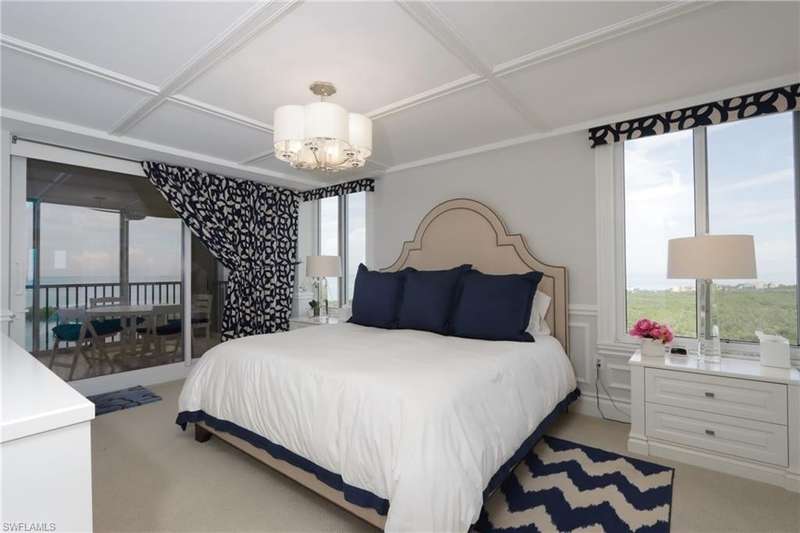 Stunning views of the Gulf, bay and mangroves from this nineteenth floor end unit residence. Desirable "front-to-back" floor plan also offers Pelican Bay city and vista golf course views, especially from the unique dining room space boasting floor to ceiling windows. Totally renovated throughout boasting all luxury modern features and appointments. Professionally designed in a contemporary décor scheme with furnishings provided by Jonathan Adler & Thom Filicia. Sofa, loveseat and two chairs in the living room. The wood dining room table seats six plus there are two bar stools. Furnished with every creature comfort to make a tenant's stay more convenient and enjoyable. St. Laurent amenities include a heated pool and spa, social room, exercise room, guest suites (subject to availability), two tennis courts, gated entry and on-site manager. Enjoy the world class amenities of Pelican Bay including two private casual beachfront restaurants, beach shuttle, beach chair & umbrella set-up service, tennis club (pay per play), community fitness center, walking trails and more. *This residence is available seasonally or annually furnished.
