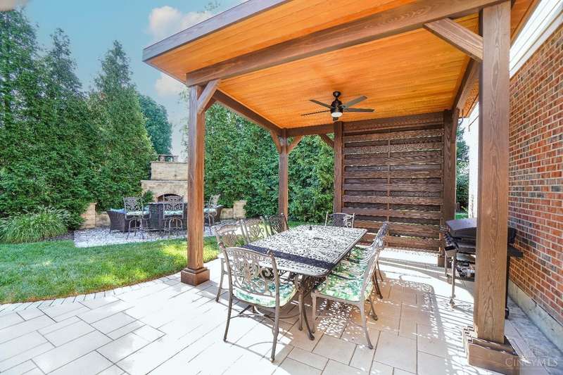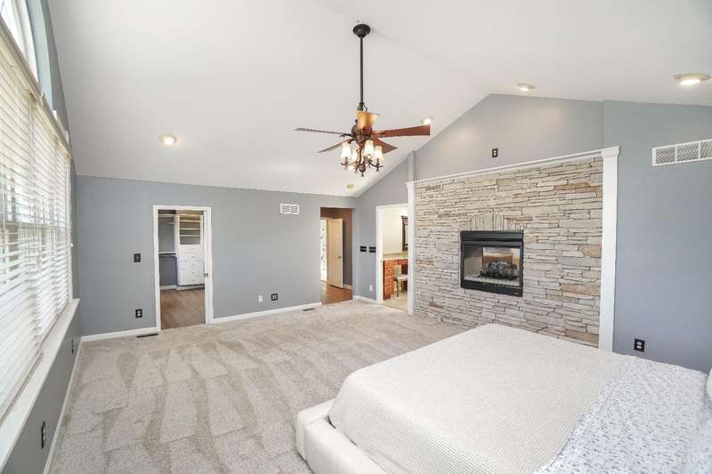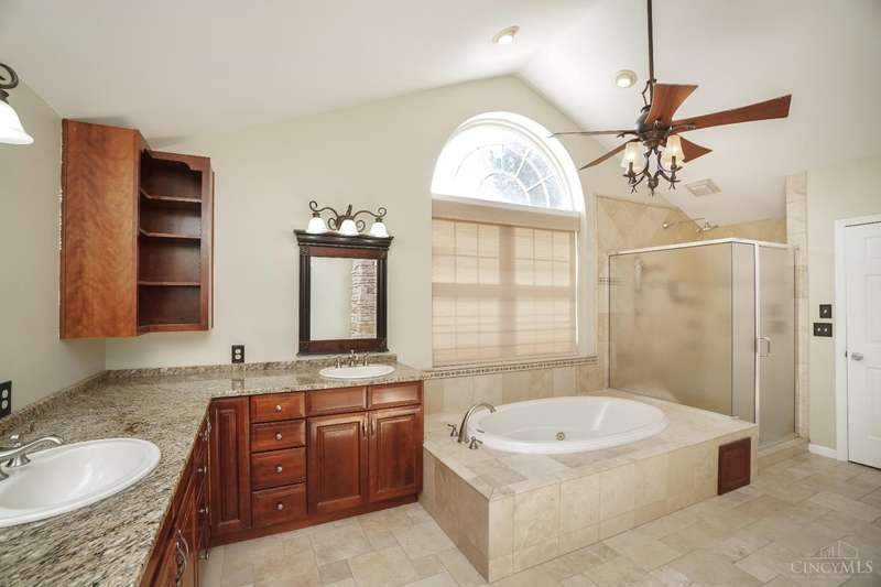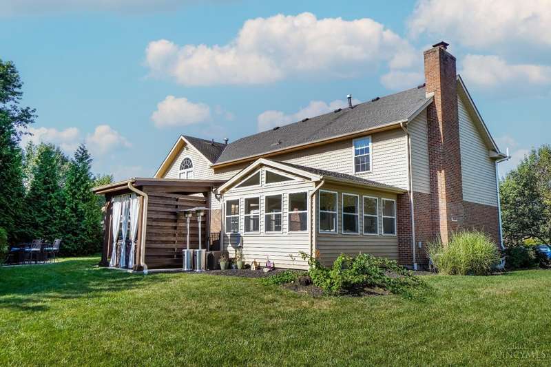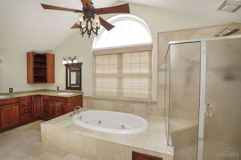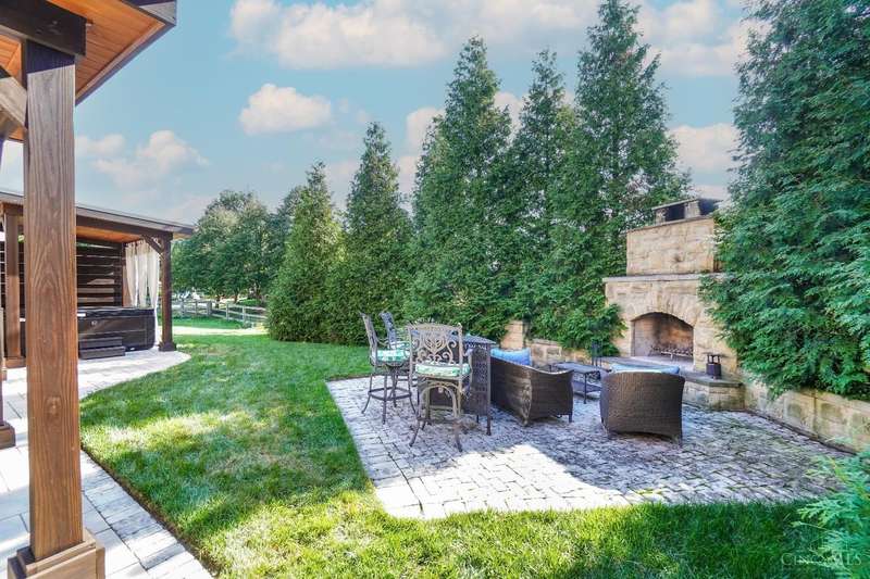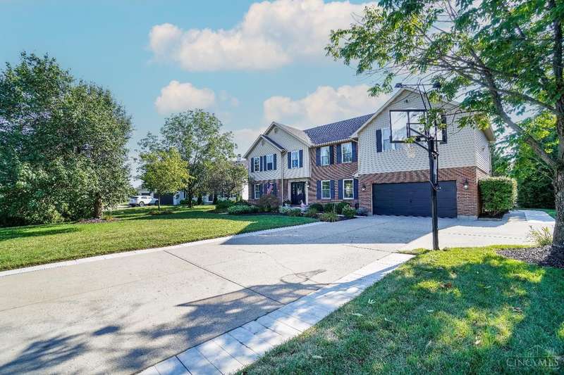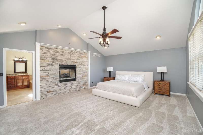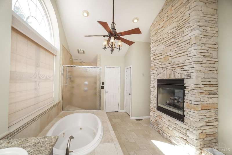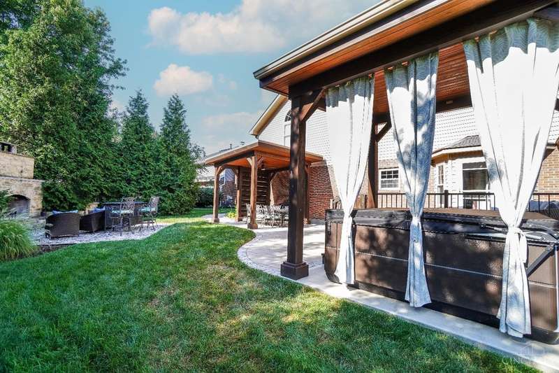 Stunning 4-Bedroom Home with Custom Kitchen & Luxurious Outdoor Living in Mason offers over 3,500 sq ft of finished living space, including 4 spacious bedrooms upstairs & versatile bonus rm/bedroom on lower level. With 4 full baths & 1 half bath, comfort & convenience are built in. The heart of the home is a custom kitchen featuring large granite island, upgraded stainless steel appliances (including ice maker) & striking stone accent wall. Open-concept family rm is filled with natural light, while the living rm showcases built-in bookcases & woodburning fireplace. Retreat to the expansive primary suite with vaulted ceiling, see-through gas fireplace between bedroom & bath, 2 walk-in closets, private sitting rm & spa-like bath with jetted tub, granite counters, double sinks & custom cabinetry. Two more 2nd-floor baths also offer double vanities. The backyard oasis features a covered patio, covered hot tub & stone fireplace set on stone flooring perfect for entertaining year-round.