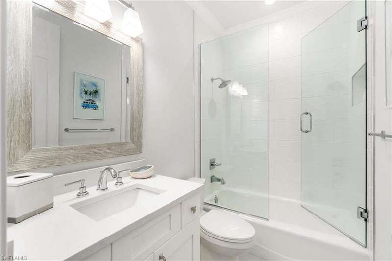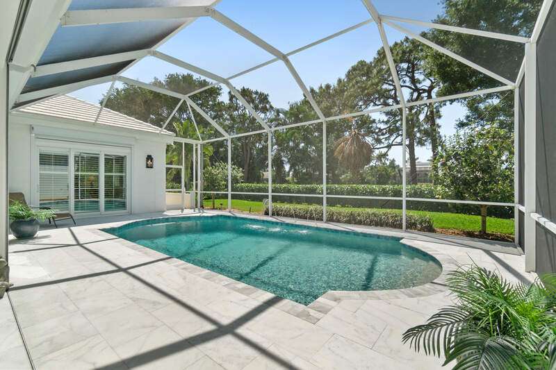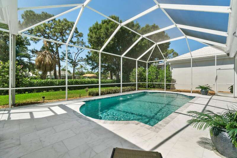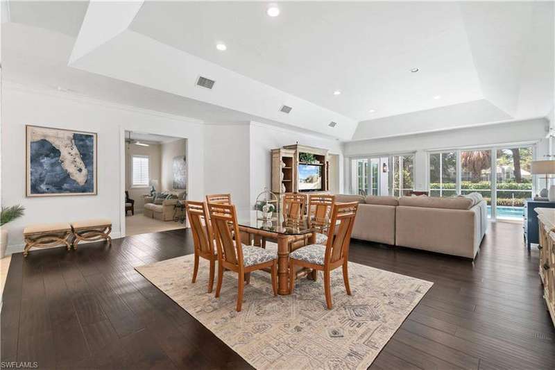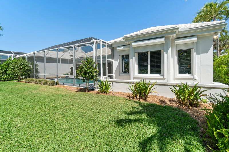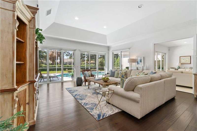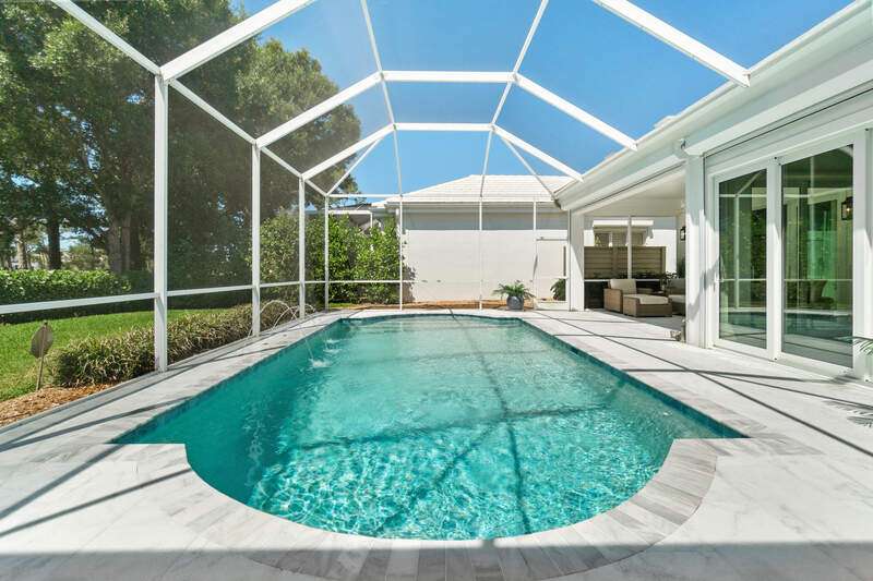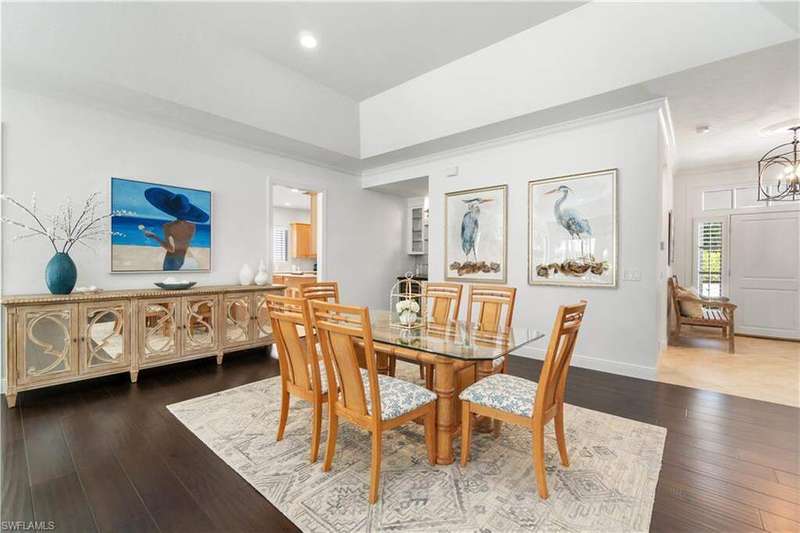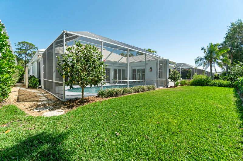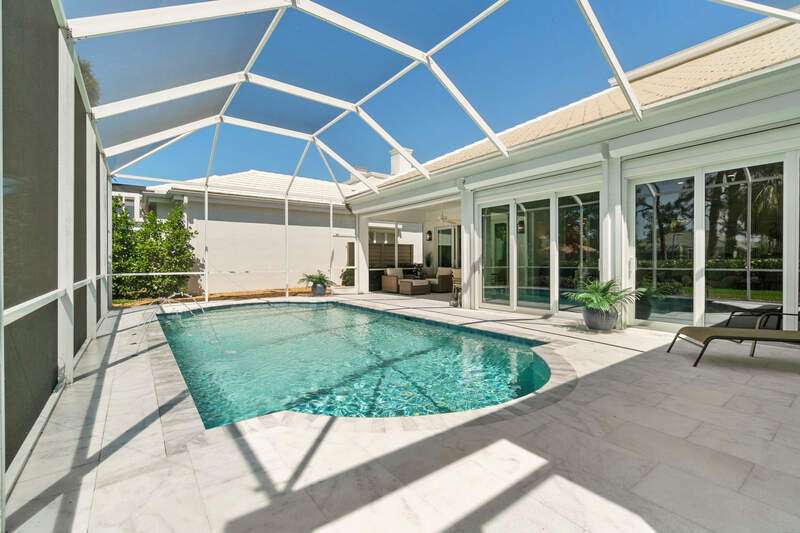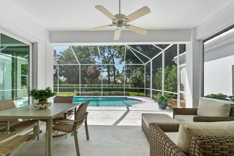 Beautifully renovated coastal contemporary home with spectacular golf course views located in North Naples' coveted "Audubon Golf & Country Club". Enjoy the sought-after Southern exposure, providing breathtaking sunsets and optimal sunlight over the pool. This beautiful residence showcases a fabulous open floor plan with 4 bedrooms, 3.5 bathrooms, a light & bright interior, soaring high ceilings, & beautiful new engineered hardwood floors and sleek ceramic tile. Notable upgrades include a new roof (2021), electric hurricane shutters, hurricane impact windows (front of home), new sliding glass doors, a hurricane rated garage door, and a brand-new HVAC (2025). Step outside to the expansive screened-in lanai, where a resurfaced saltwater heated pool awaits, complete with new pool tile and travertine decking (2024). Surrounded by lush landscaping, this outdoor retreat provides multiple lounging areas and stunning golf course vistas - offering the perfect space to relax in privacy. Inside, the kitchen boasts light cabinetry, white countertops, and premium Bosch appliances, including a new induction cooktop (2023). A separate wet bar with a built-in beverage cooler adds convenience for entertaining. The generous primary suite is a private retreat featuring a spa-like bathroom with dual vanities, a spacious walk-in shower, and a freestanding soaking tub for ultimate relaxation. Audubon's prime location is just 5 minutes from Mercato and world-class beaches, and the community offers a gated/guarded entrance, an 18-hole championship golf course, tennis, pickleball, a Bayside boardwalk, and a newly renovated clubhouse with dining and a second beautiful poolside club and cafe.