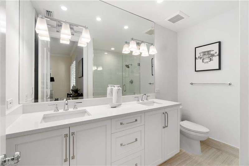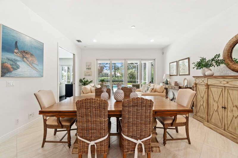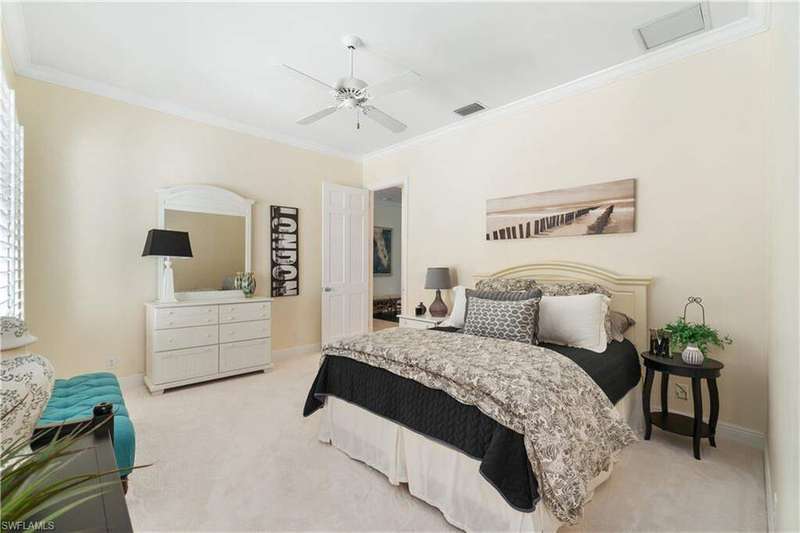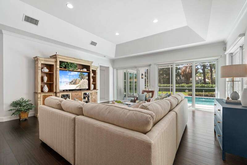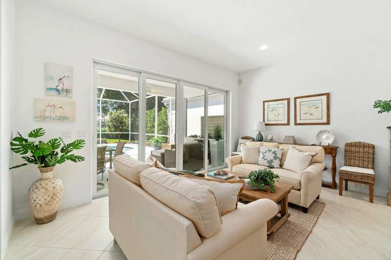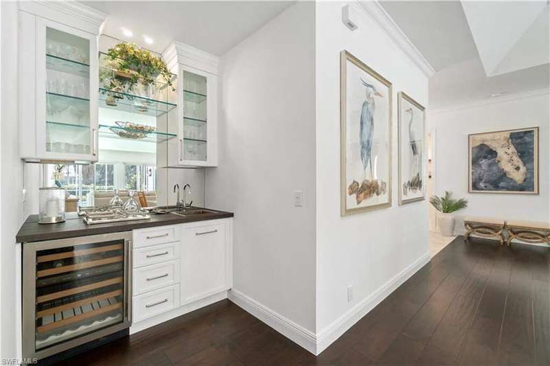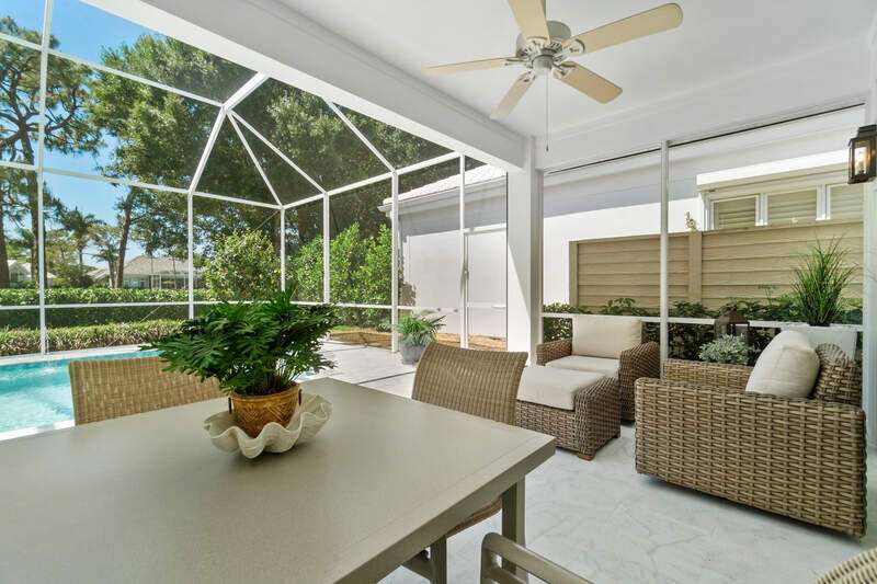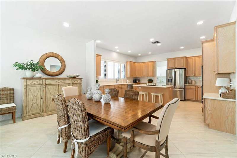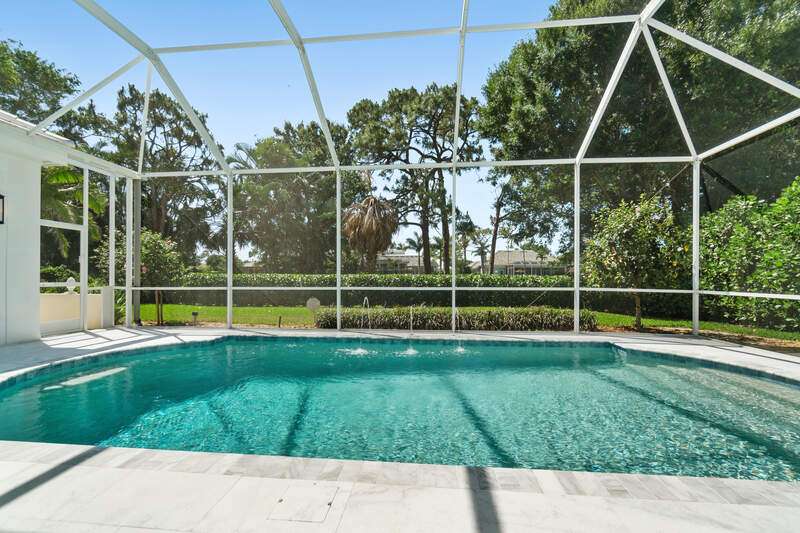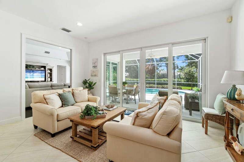 Beautifully renovated coastal contemporary home with spectacular golf course views located in North Naples' coveted "Audubon Golf & Country Club". Enjoy the sought-after Southern exposure, providing breathtaking sunsets and optimal sunlight over the pool. This beautiful residence showcases a fabulous open floor plan with 4 bedrooms, 3.5 bathrooms, a light & bright interior, soaring high ceilings, & beautiful new engineered hardwood floors and sleek ceramic tile. Notable upgrades include a new roof (2021), electric hurricane shutters, hurricane impact windows (front of home), new sliding glass doors, a hurricane rated garage door, and a brand-new HVAC (2025). Step outside to the expansive screened-in lanai, where a resurfaced saltwater heated pool awaits, complete with new pool tile and travertine decking (2024). Surrounded by lush landscaping, this outdoor retreat provides multiple lounging areas and stunning golf course vistas - offering the perfect space to relax in privacy. Inside, the kitchen boasts light cabinetry, white countertops, and premium Bosch appliances, including a new induction cooktop (2023). A separate wet bar with a built-in beverage cooler adds convenience for entertaining. The generous primary suite is a private retreat featuring a spa-like bathroom with dual vanities, a spacious walk-in shower, and a freestanding soaking tub for ultimate relaxation. Audubon's prime location is just 5 minutes from Mercato and world-class beaches, and the community offers a gated/guarded entrance, an 18-hole championship golf course, tennis, pickleball, a Bayside boardwalk, and a newly renovated clubhouse with dining and a second beautiful poolside club and cafe.