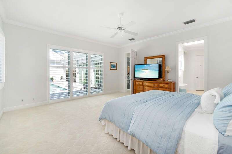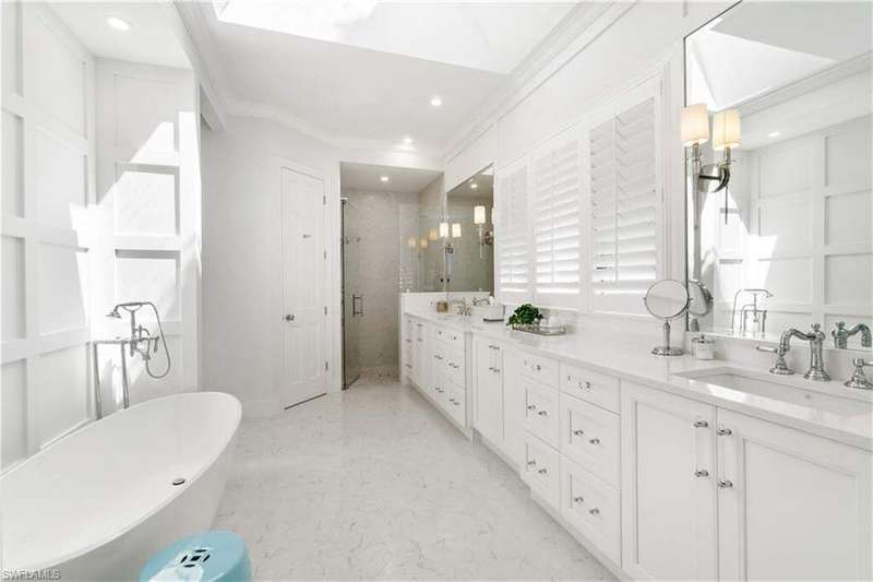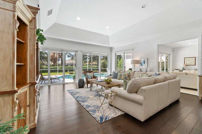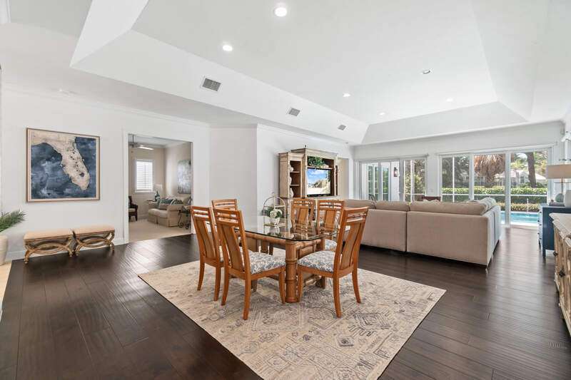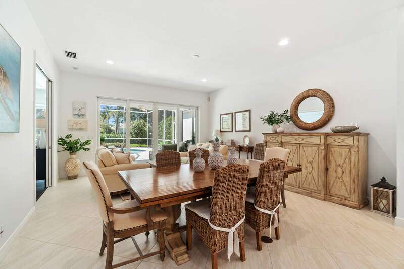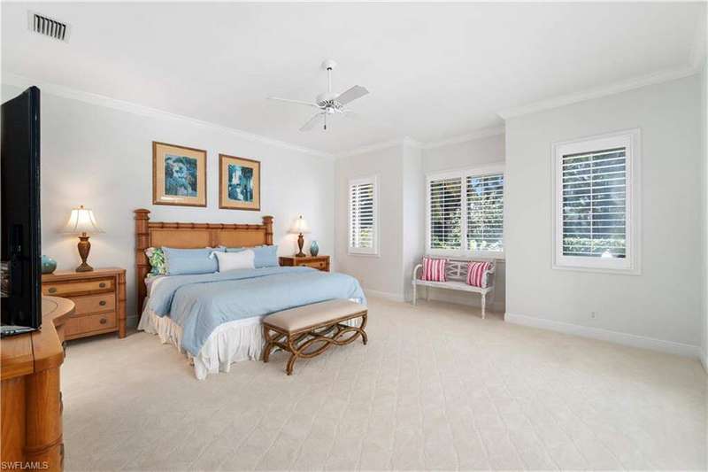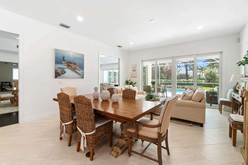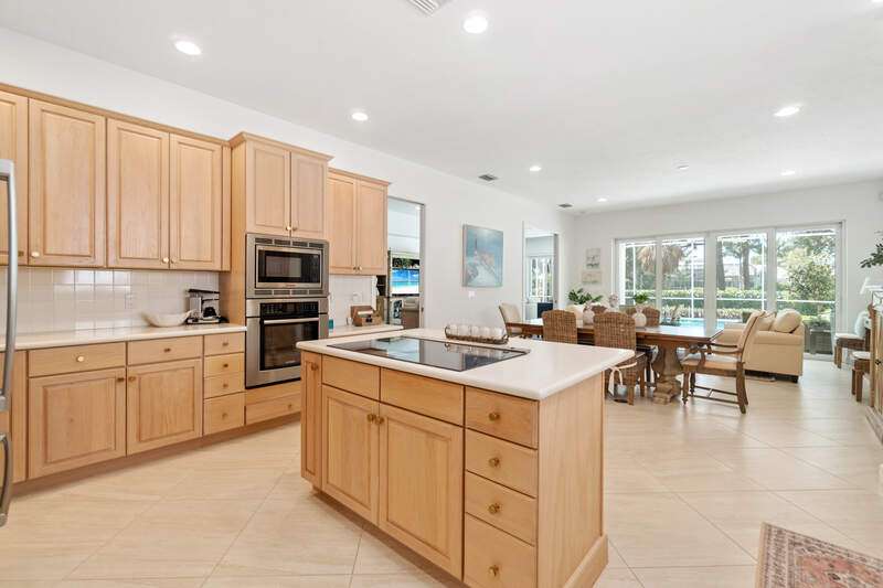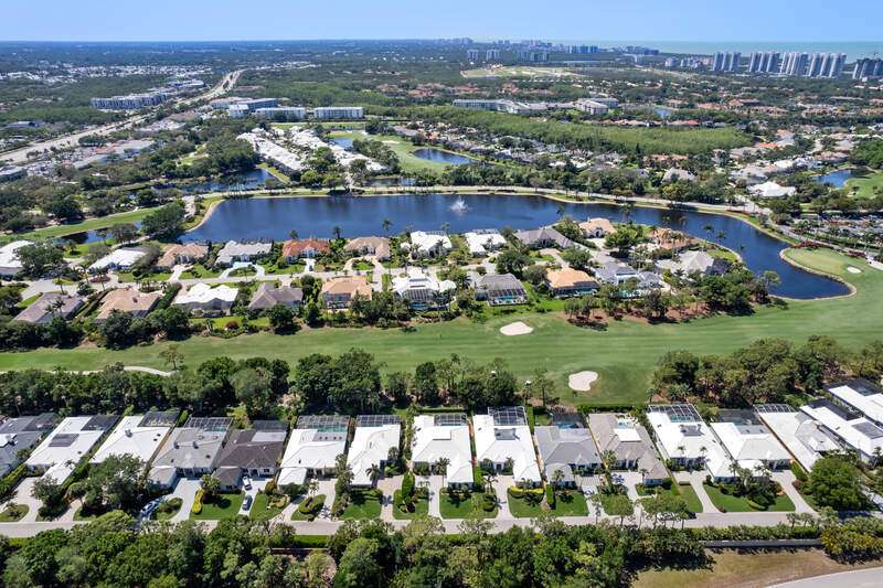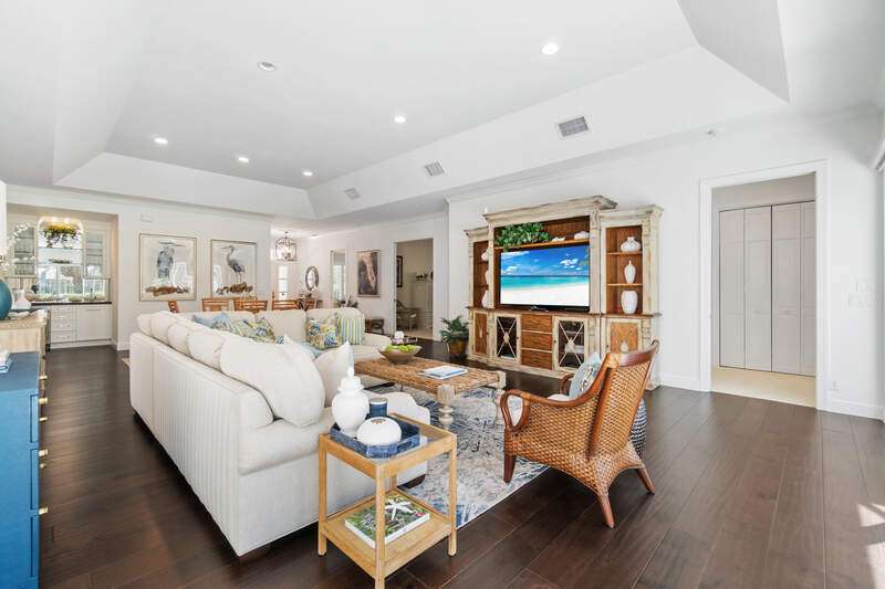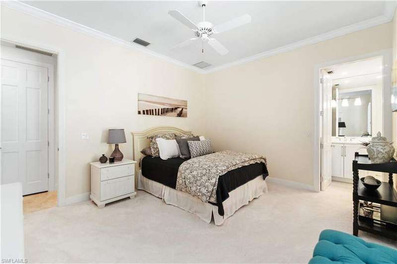 Beautifully renovated coastal contemporary home with spectacular golf course views located in North Naples' coveted "Audubon Golf & Country Club". Enjoy the sought-after Southern exposure, providing breathtaking sunsets and optimal sunlight over the pool. This beautiful residence showcases a fabulous open floor plan with 4 bedrooms, 3.5 bathrooms, a light & bright interior, soaring high ceilings, & beautiful new engineered hardwood floors and sleek ceramic tile. Notable upgrades include a new roof (2021), electric hurricane shutters, hurricane impact windows (front of home), new sliding glass doors, a hurricane rated garage door, and a brand-new HVAC (2025). Step outside to the expansive screened-in lanai, where a resurfaced saltwater heated pool awaits, complete with new pool tile and travertine decking (2024). Surrounded by lush landscaping, this outdoor retreat provides multiple lounging areas and stunning golf course vistas - offering the perfect space to relax in privacy. Inside, the kitchen boasts light cabinetry, white countertops, and premium Bosch appliances, including a new induction cooktop (2023). A separate wet bar with a built-in beverage cooler adds convenience for entertaining. The generous primary suite is a private retreat featuring a spa-like bathroom with dual vanities, a spacious walk-in shower, and a freestanding soaking tub for ultimate relaxation. Audubon's prime location is just 5 minutes from Mercato and world-class beaches, and the community offers a gated/guarded entrance, an 18-hole championship golf course, tennis, pickleball, a Bayside boardwalk, and a newly renovated clubhouse with dining and a second beautiful poolside club and cafe.