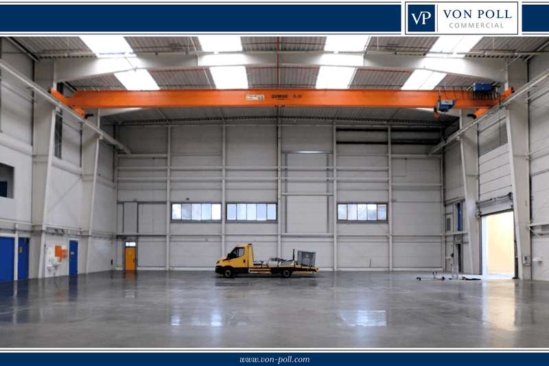 The production of goods and merchandise is an essential part of our economy. To be successful in an increasingly competitive market, it is essential to work efficiently and productively. A modern industrial hall can make an important contribution to this by creating optimal working conditions and facilitating production. Around 6,900 m² of warehouse space is available to let in the property on offer. The property was built in 2007 and was renovated and converted in 2020/21. The warehouse space extends over several building sections (3 modules), which are connected internally. The building structure is designed to enable efficient production and storage. Access from the outside is via ground-level roller shutters and, in the office building, via a glazed entrance door. The approx. 10 m high production halls can be heated and are each equipped with a 6.5 t crane runway. The floor load is approx. 5 tons. Ground-level access roads (roller shutters) are installed to provide access to the halls. Truck access is possible through the roller shutters. The halls are heated by separate gas heating systems. Each section of the hall can be heated independently so that the temperature can be individually adjusted. The property is completely fenced in and has generous outdoor storage areas as well as 88 parking spaces. The property therefore offers sufficient space for the storage of goods as well as the production of goods. The rental price is exclusive of ancillary costs and VAT. The office space is priced at € 7.00/m² plus ancillary costs and VAT. An energy performance certificate is currently being prepared and will be presented for viewing.