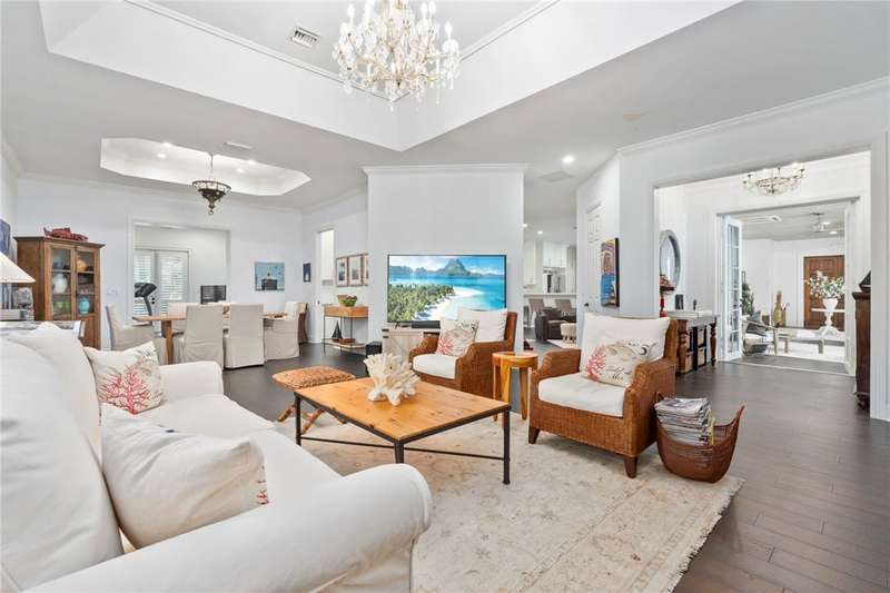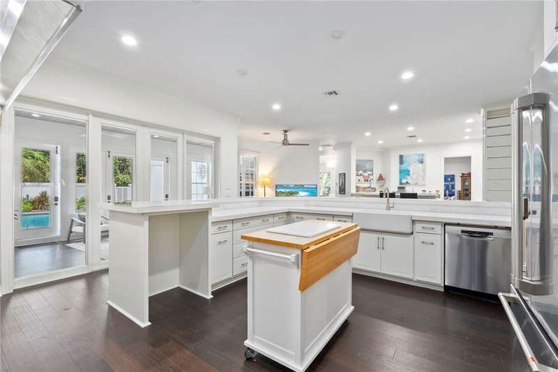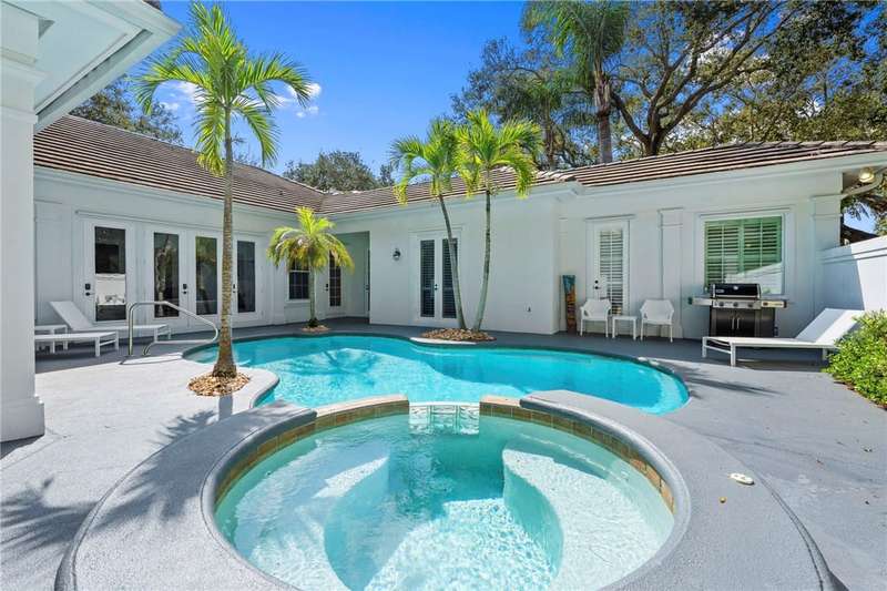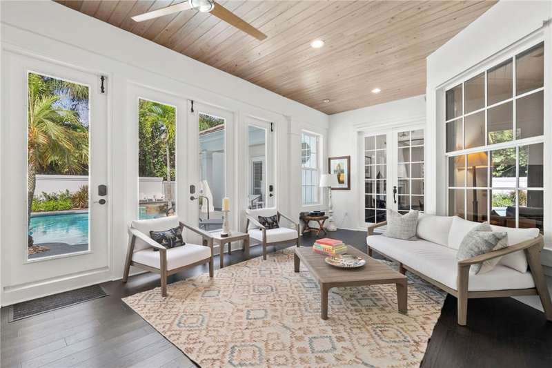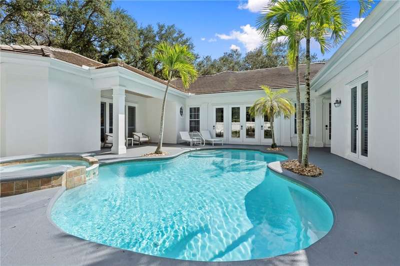 Rare opportunity to own this oceanside gem! Single-story concrete block home. 4 bedrooms + den. Separate large cabana guest suite w/ den & kitchenette. Beautifully renovated throughout. Spacious chefs kitchen w/ large bar & wine closet.3 separate areas perfect for entertaining! Large courtyard w/ heated/cooled pool. Recent updates: new kitchen, hardwood floors, electrical, lighting, a/c, paint, custom plantation shutters, appliances, resurfaced pool. A/C 2-car garage. Not in flood zone! Deeded beach access, clubhouse, clay tennis courts, 24 hr guard gate. Sizes are approx/subj to error.