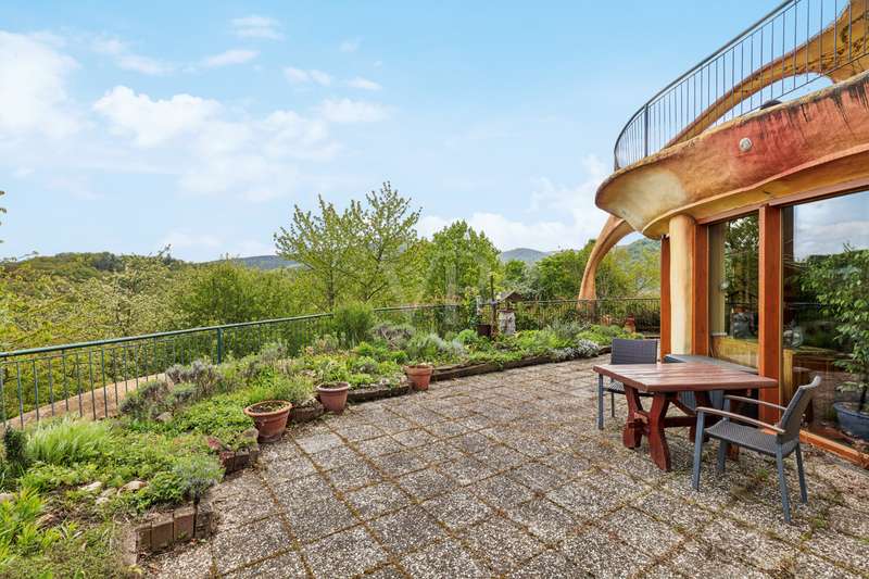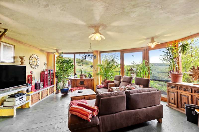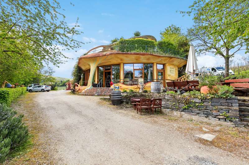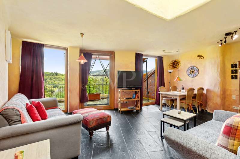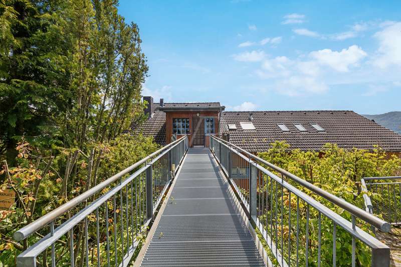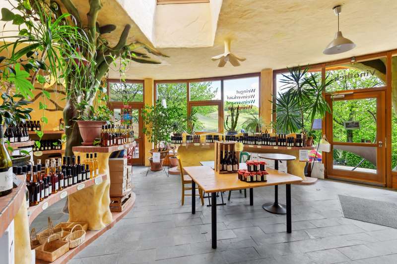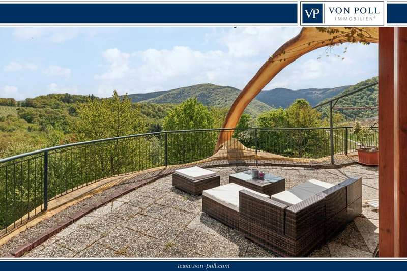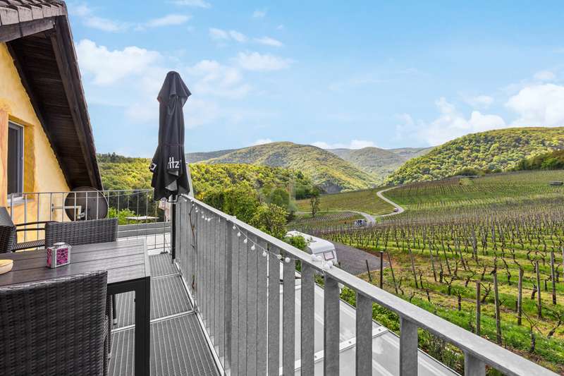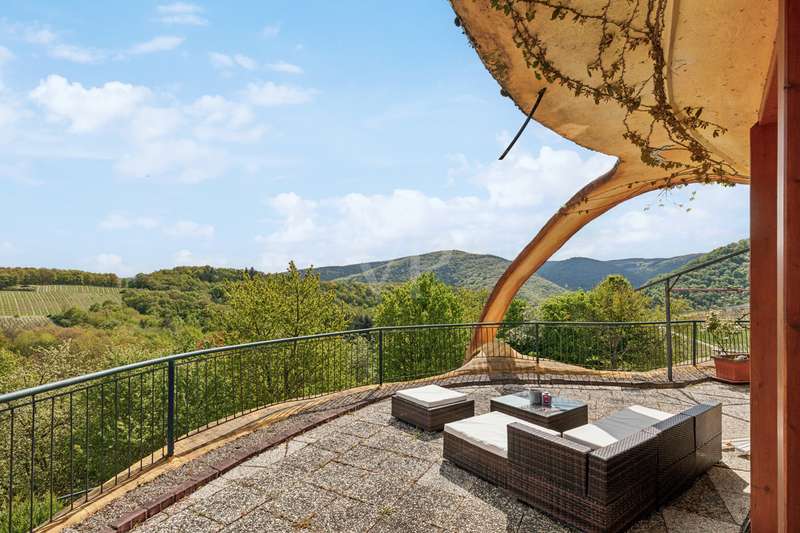 The country house, built in 1977, is located in the middle of approx. 12,632 m² of beautiful vineyards directly on the romantic red wine hiking trail. The Ahr has formed a very deep valley here. The very special rock formation "Bunte Kuh" and "Kaiserstuhl" have always been the motifs of numerous paintings of the Ahr valley. With a living space of approx. 413 m², this property offers sufficient space for owners, holidaymakers and guests. A further approx. 960 m² of space is available for the restaurant and production. The house was originally built as a family business and farmhouse with a pub and is still run as such today. The architecture of the house was inspired by the Spanish architect Antonio Gaudi and the Austrian architect and artist Hundertwasser, which is reflected in the organic shapes and cheerful colors. The house has a total of 15 rooms, including 10 bedrooms and 6 bathrooms, as well as balconies and terraces that offer wonderful views of the surrounding countryside. In 1999, the former winegrower's house was extensively extended and modernized to give it its current, unique appearance. Space was created for today's main apartment and the wine shop, and the terrace and vacation apartments were redesigned. The pellet central heating provides pleasant warmth and comfort. On the first floor of the house there is a granny apartment of approx. 71m². The restaurant and a spacious outdoor terrace offer plenty of space for visitors. An appropriately equipped catering kitchen is available. The owner's apartment extends over two floors. The unusual architecture is clearly showcased here. Warm, natural colors and large windows convey a very special feeling of living here. On the upper floor of the house there are also three cheerfully designed vacation apartments, each measuring approx. 35m². The property features extensive greenery on the courtyard, façade, terrace and roof to minimize the impact on nature. The natural surroundings and the special architectural features make this country house a unique property for nature lovers and individualists. If you have always dreamed of owning your own wine and vineyard, don't hesitate to arrange a viewing today.