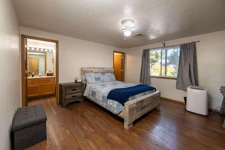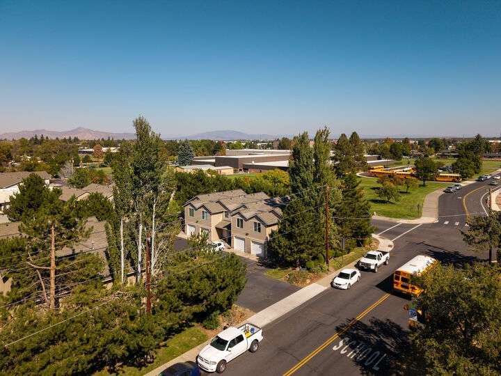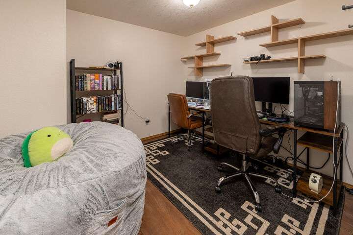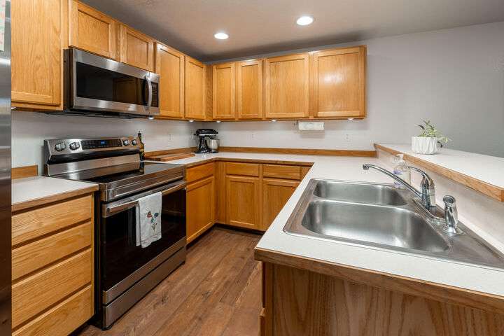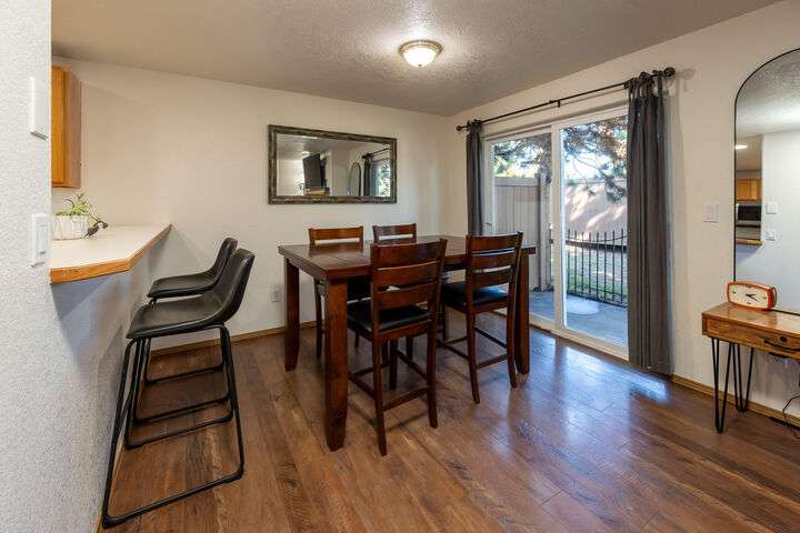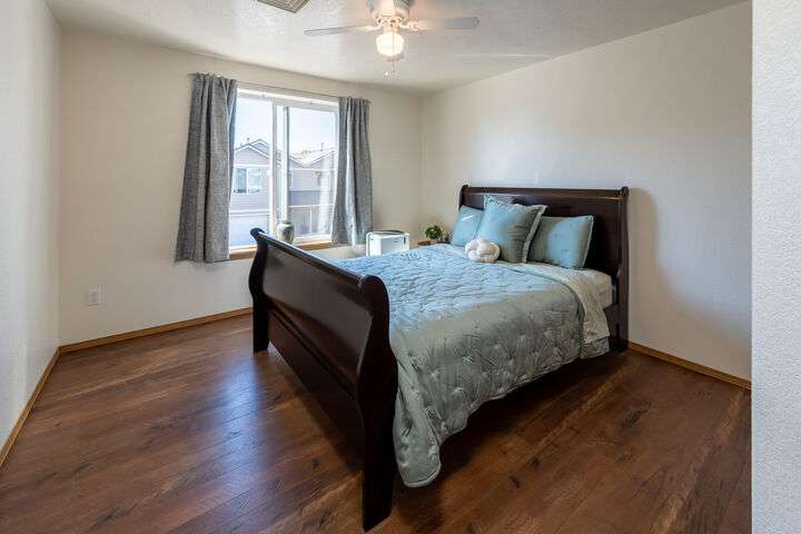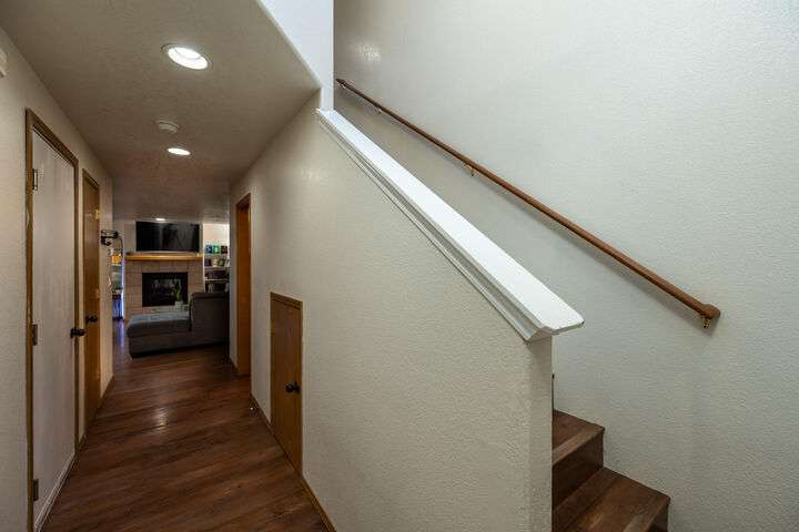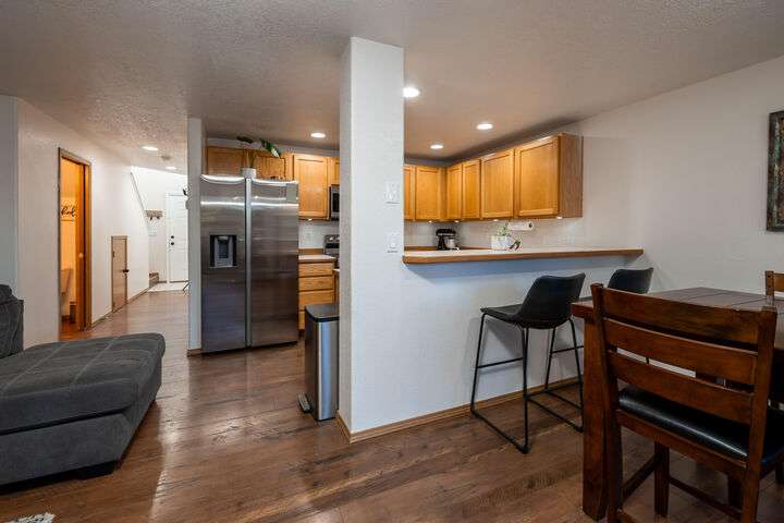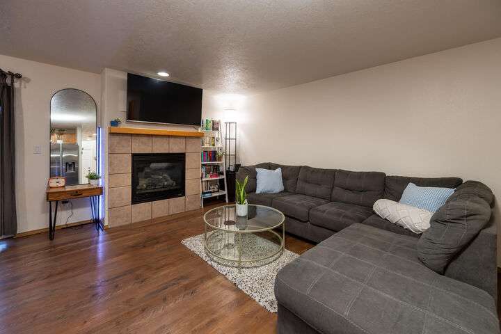 Highly upgraded end unit condo w/a great room layout & fantastic parking. Upon entering through the covered front porch, you are greeted w/brand new LVP flooring & paint throughout. The kitchen has new appliances, expansive countertops, breakfast bar, & flows into the gas fireplace accented great room w/living & adjoining dining areas that lead to the back patio through a slider. Down the hall is a powder room & access to the large single car garage w/opener. Upstairs you'll find a massive primary suite w/walk in closet, AC unit, & ceiling fan. On the opposite side of the home is the spacious guest bedroom w/window AC unit & room for a king bed. Directly adjacent is the upstairs guest bathroom w/tub/shower combination. In between both bedrooms you'll find an office that can flex as a bonus or bedroom. Both the washer/dryer are upstairs in the hallway. Outside you have a very private back deck, across the street is Baker Park, & two blocks west you have direct access to the Dry Canyon!