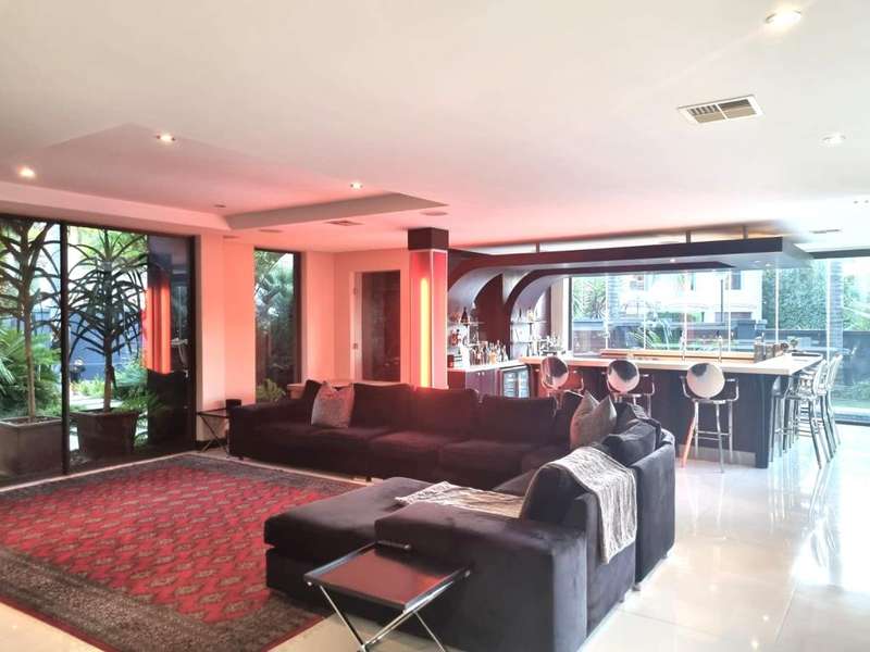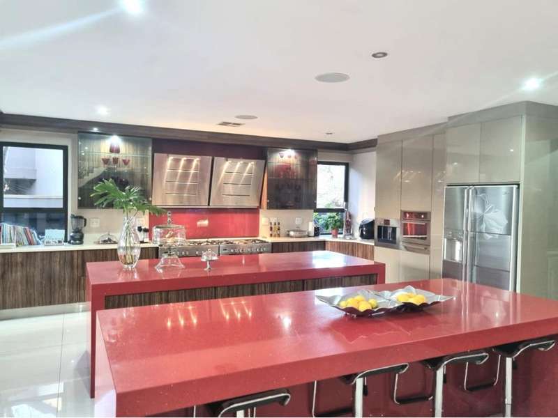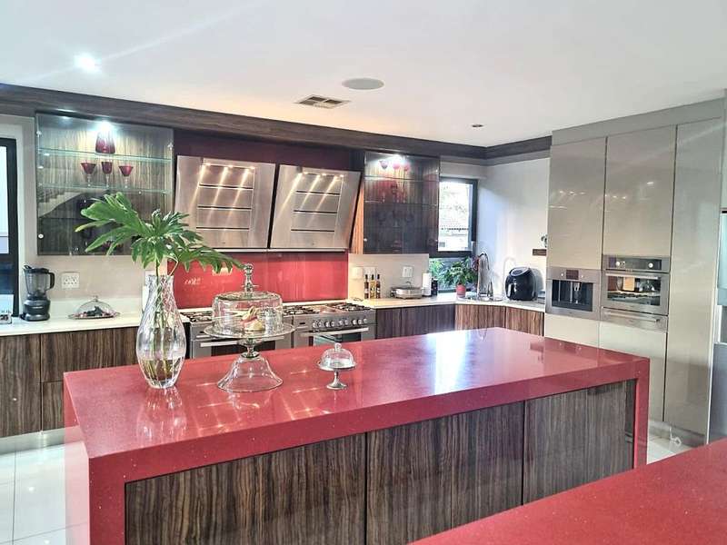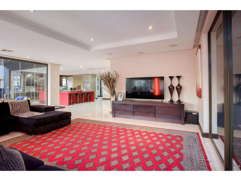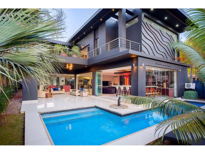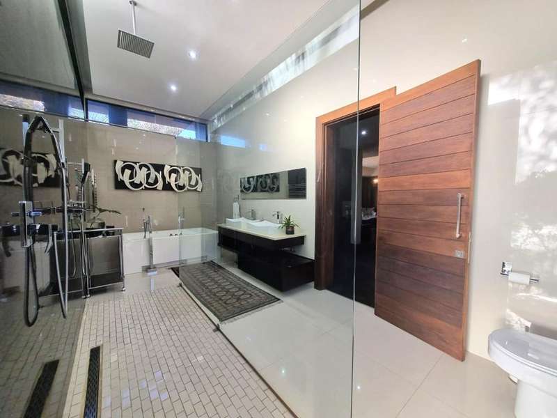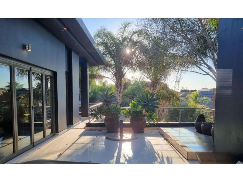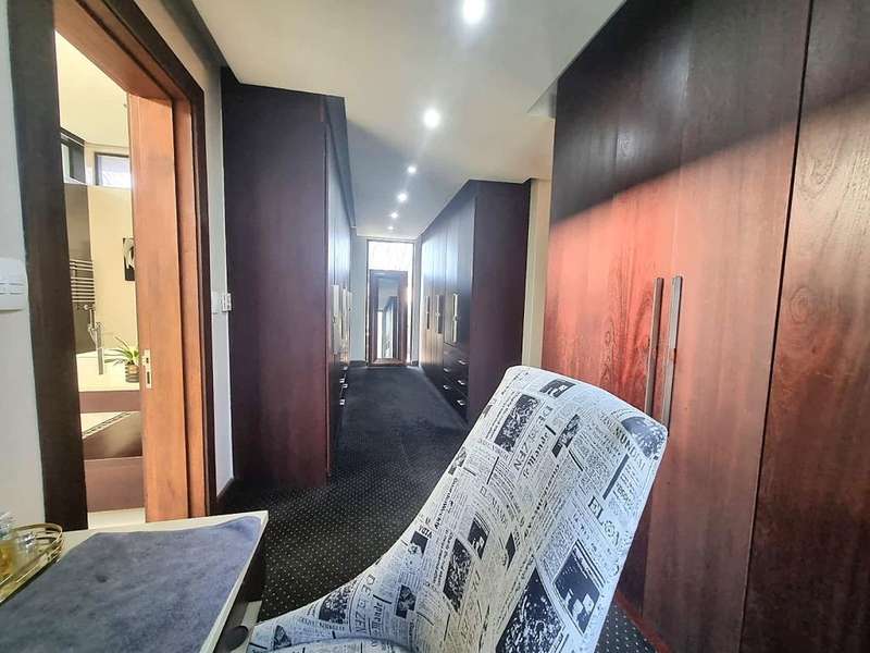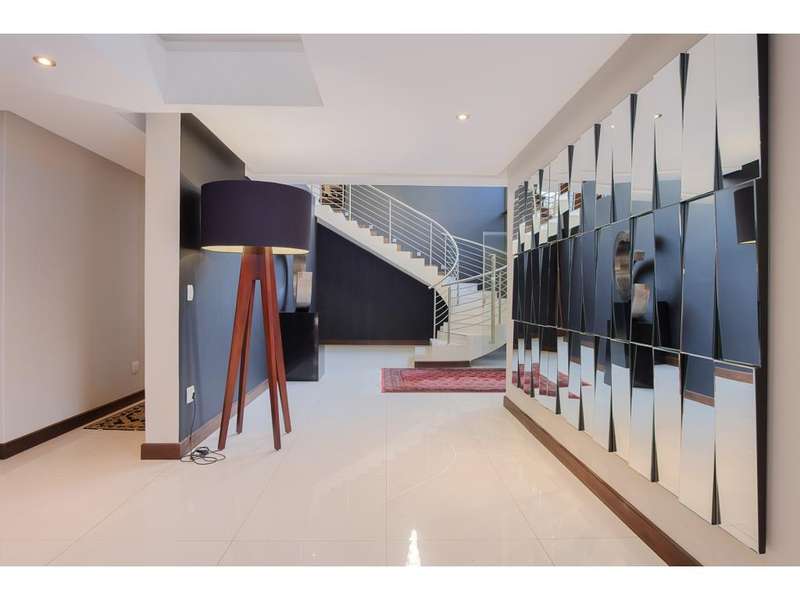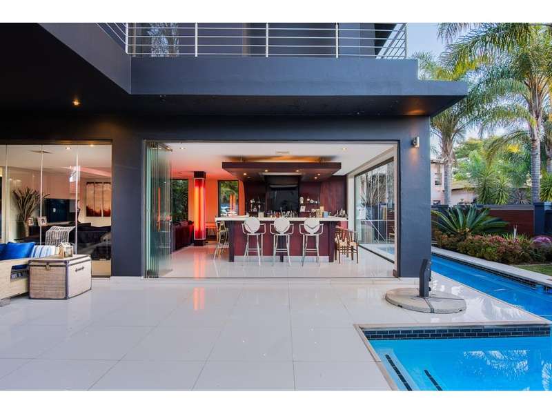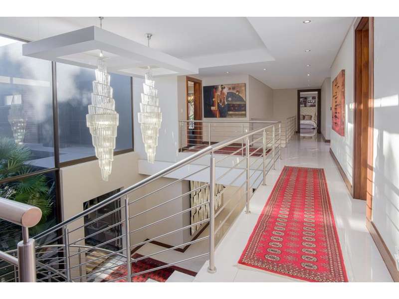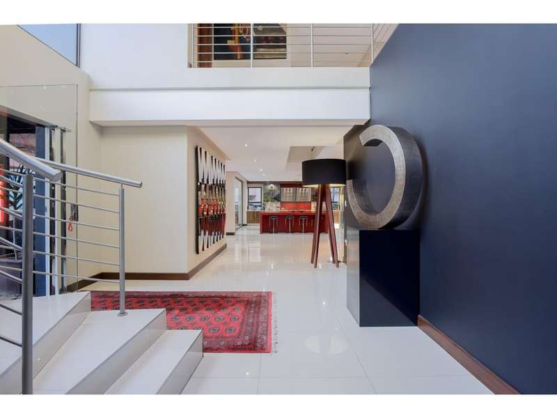 Located in a quiet cul-de-sac in Midstream Estate Proper, this modern, immaculate, luxury family home offers the exeptional: The double volume entrance features two beautul chandeliers, and a sweeping staircase to the living quarters upstairs. Downstairs you will find the ultimate in entertainment areas: * this open plan area (279m2) consists of * a generous formal lounge area, * a 14 seater dining area with fireplace. * a stunning hi-end kitchen, * enormous TV lounge area and * 12 seater bar area with 2 built-in kegs. This entire frontage of living area is closed in with glass fold-away glass doors. Opening these glass sliders extends the entire living area onto the exspansive patio, the swimmingpool and garden. * Next to the bar is a temprature controlled walk-in wine celler. * The gourmet kitchen includes: ~ 2 x freestanding Elba stainless steel stoves with Gas burners, electric ovens and warming drawers. One of the stoves include a fish-burner. ~ Two state of the art AEG extractors above the stoves. ~1 x Conventional eyelevel oven with warmer. ~1 x Coffee grinder and coffee machine. ~ Beautiful white granite tops, complimented by light high gloss cabentry. Ample storage. ~ Two extra large waterfall red quartz islands, adds work space, storage and seating for 6. ~ A sparate scullary and laundry with space for all your electronic equiptment. ~ Walk-in pantry, ~ Veggie prep basin close to stoves. * There is a study on the ground floor, * as well as a guest W/C * Direct access from the house to the 4 car garage. * a Seperate laundry. * servants quarters or flatlet with private entrance. * A garage accommodating 4 vehicles side-by-side. Upstairs is: * 4/5 x large bedrooms. (Main bed = 78m2) * 4 x bathrooms (3 is ensuite). All the bathrooms are full bathrooms with walk-in showers, towel warmers, underfloor heating and heating/cooling air controll, double vanities and spa- baths in some, and multiple shower heads in the main bathroom shower. ~ Walk-in/walk-through cupboards in all the rooms. ~ wooden flooring in 3 bedrooms and main bedroom has carpeting. ~ Main bedroom features aluminium framed glass sliders, openening onto a private patio. * A dedicated soundproof home theater/cinema room. Even the roof in this area has been soundproofed. Can also serve as an additional bedroom.