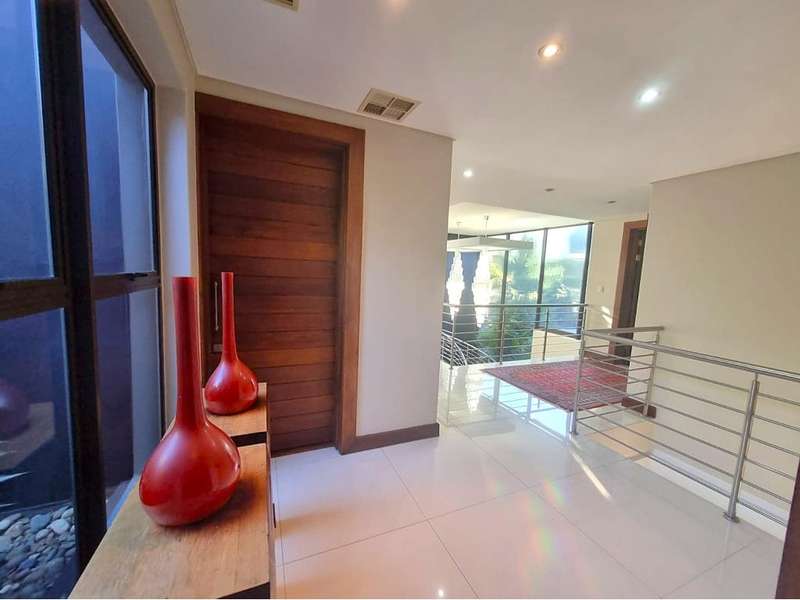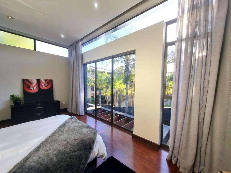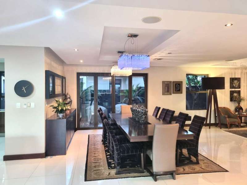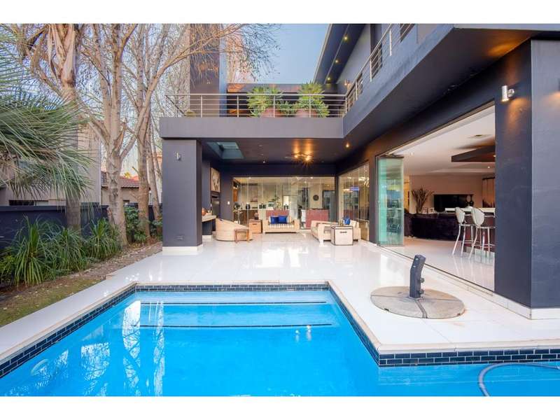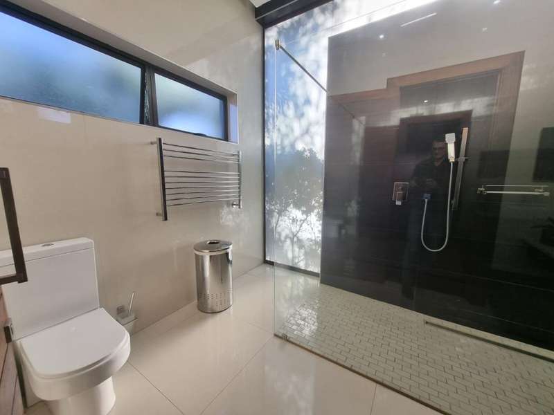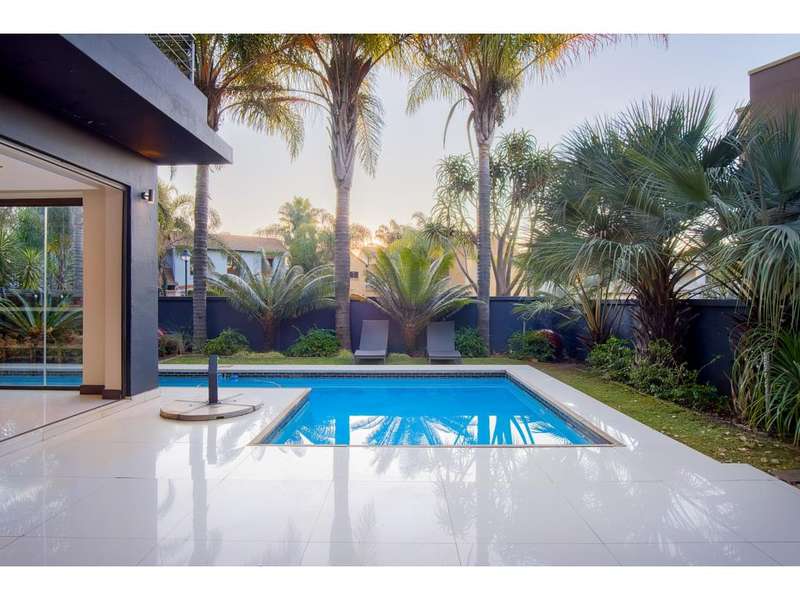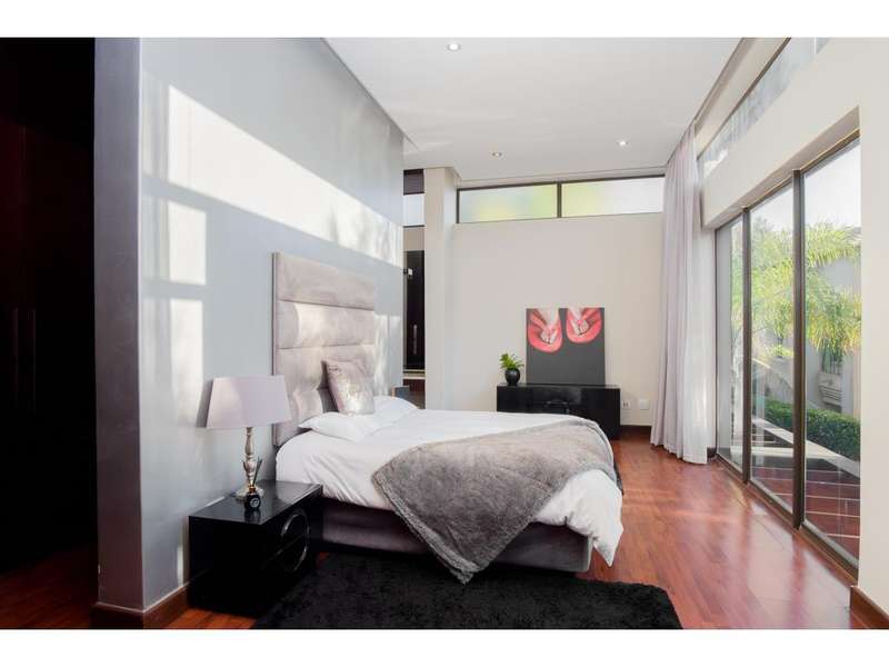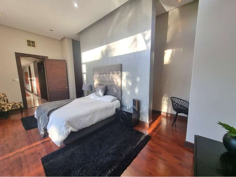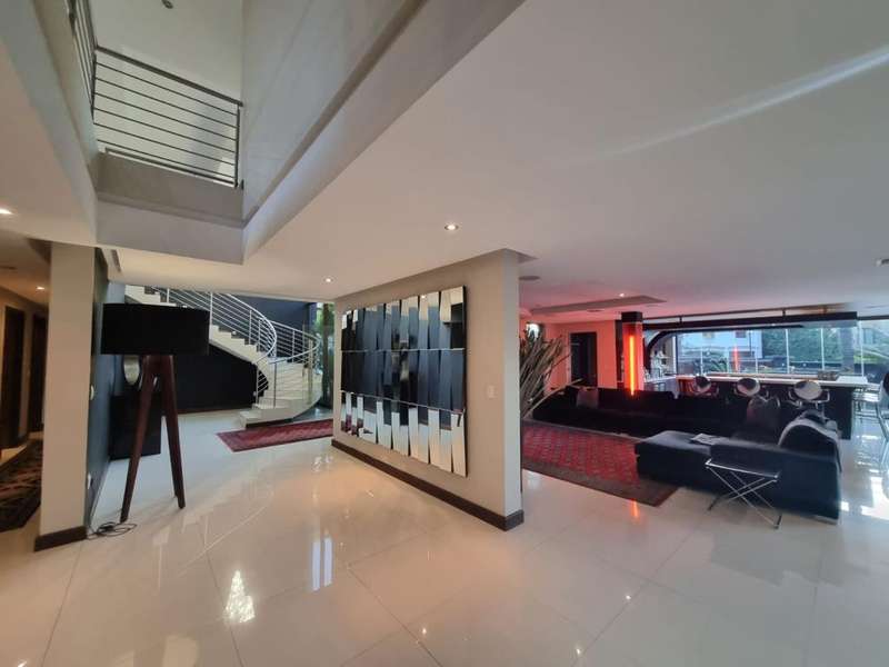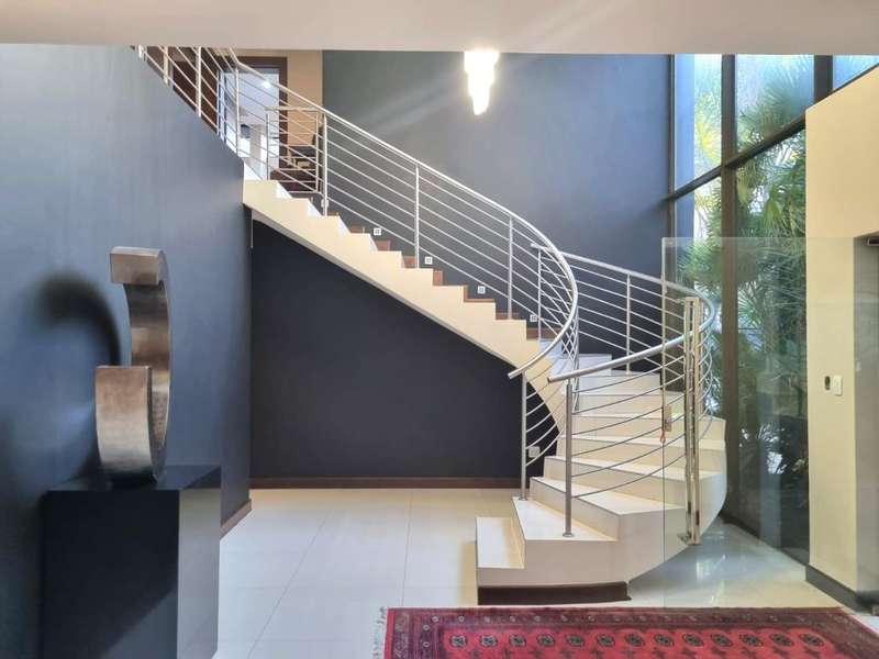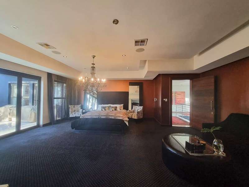 Located in a quiet cul-de-sac in Midstream Estate Proper, this modern, immaculate, luxury family home offers the exeptional: The double volume entrance features two beautul chandeliers, and a sweeping staircase to the living quarters upstairs. Downstairs you will find the ultimate in entertainment areas: * this open plan area (279m2) consists of * a generous formal lounge area, * a 14 seater dining area with fireplace. * a stunning hi-end kitchen, * enormous TV lounge area and * 12 seater bar area with 2 built-in kegs. This entire frontage of living area is closed in with glass fold-away glass doors. Opening these glass sliders extends the entire living area onto the exspansive patio, the swimmingpool and garden. * Next to the bar is a temprature controlled walk-in wine celler. * The gourmet kitchen includes: ~ 2 x freestanding Elba stainless steel stoves with Gas burners, electric ovens and warming drawers. One of the stoves include a fish-burner. ~ Two state of the art AEG extractors above the stoves. ~1 x Conventional eyelevel oven with warmer. ~1 x Coffee grinder and coffee machine. ~ Beautiful white granite tops, complimented by light high gloss cabentry. Ample storage. ~ Two extra large waterfall red quartz islands, adds work space, storage and seating for 6. ~ A sparate scullary and laundry with space for all your electronic equiptment. ~ Walk-in pantry, ~ Veggie prep basin close to stoves. * There is a study on the ground floor, * as well as a guest W/C * Direct access from the house to the 4 car garage. * a Seperate laundry. * servants quarters or flatlet with private entrance. * A garage accommodating 4 vehicles side-by-side. Upstairs is: * 4/5 x large bedrooms. (Main bed = 78m2) * 4 x bathrooms (3 is ensuite). All the bathrooms are full bathrooms with walk-in showers, towel warmers, underfloor heating and heating/cooling air controll, double vanities and spa- baths in some, and multiple shower heads in the main bathroom shower. ~ Walk-in/walk-through cupboards in all the rooms. ~ wooden flooring in 3 bedrooms and main bedroom has carpeting. ~ Main bedroom features aluminium framed glass sliders, openening onto a private patio. * A dedicated soundproof home theater/cinema room. Even the roof in this area has been soundproofed. Can also serve as an additional bedroom.