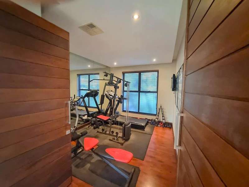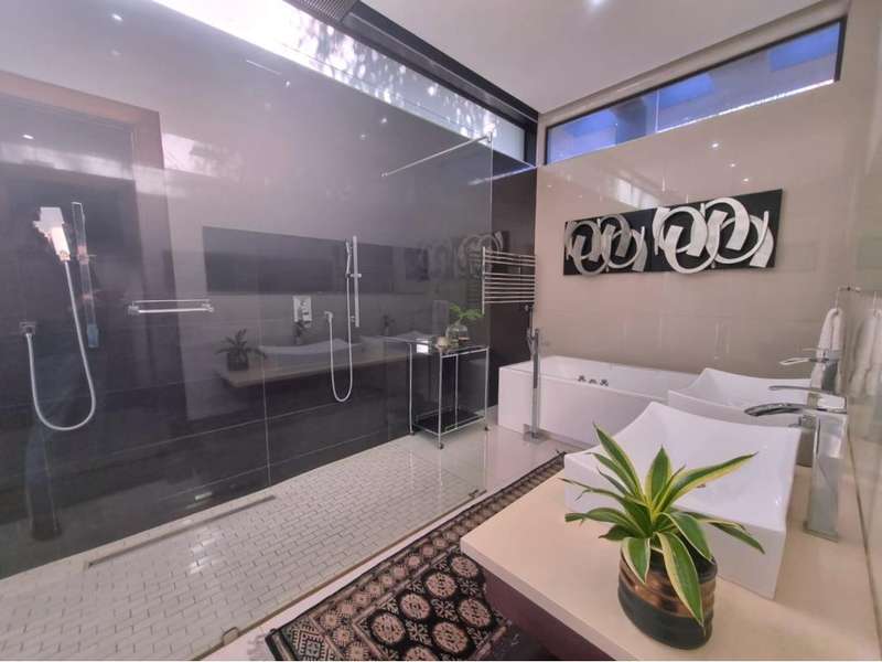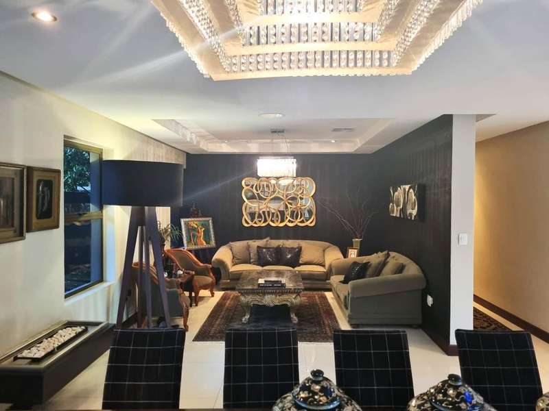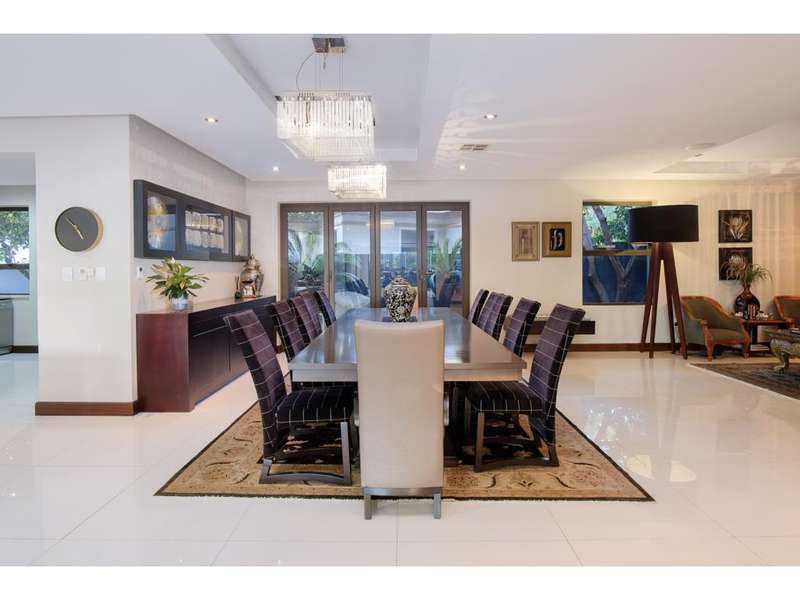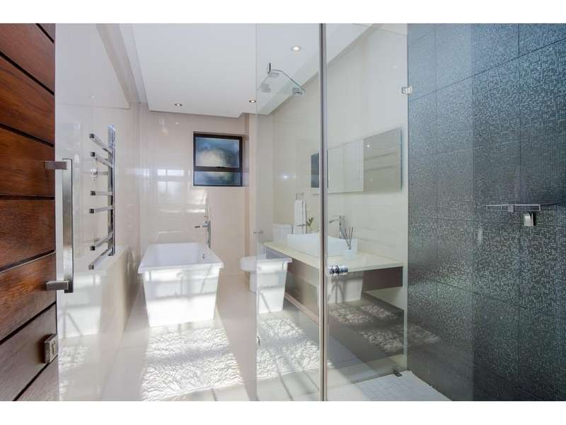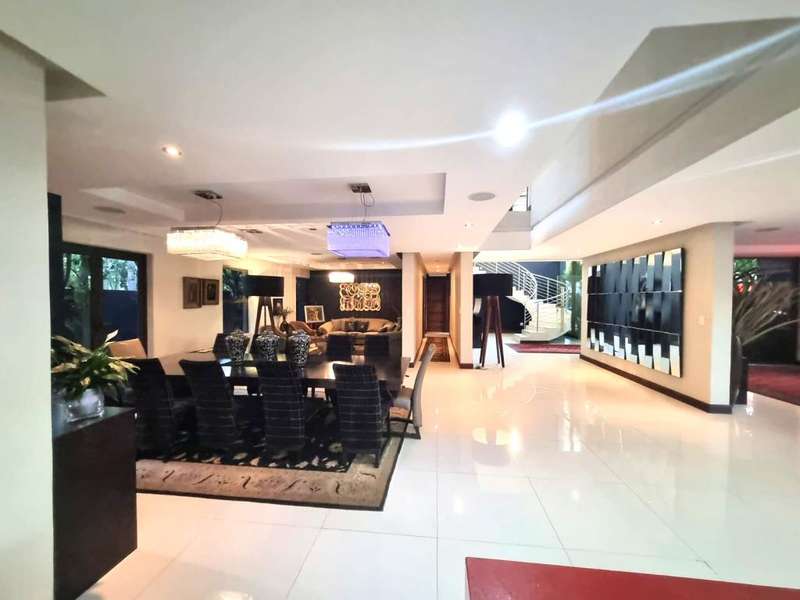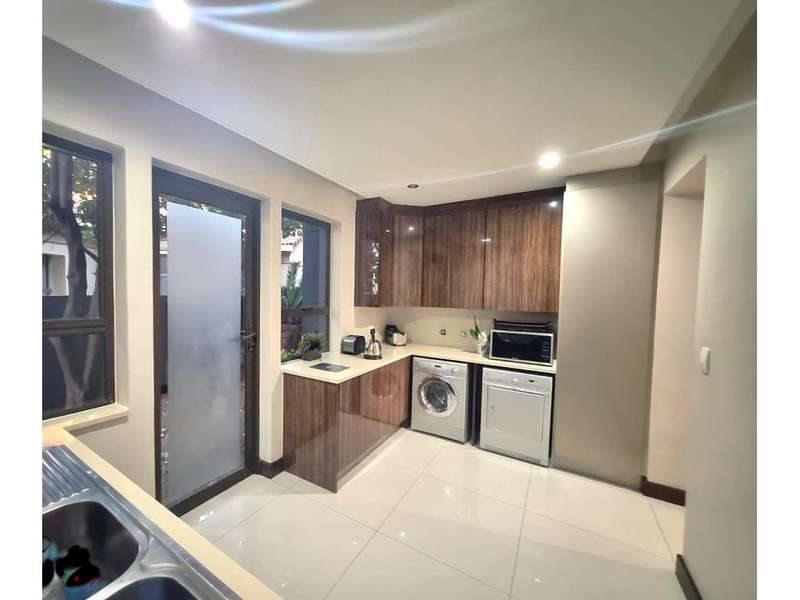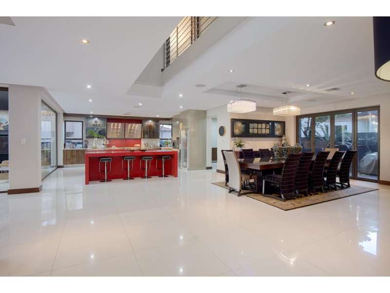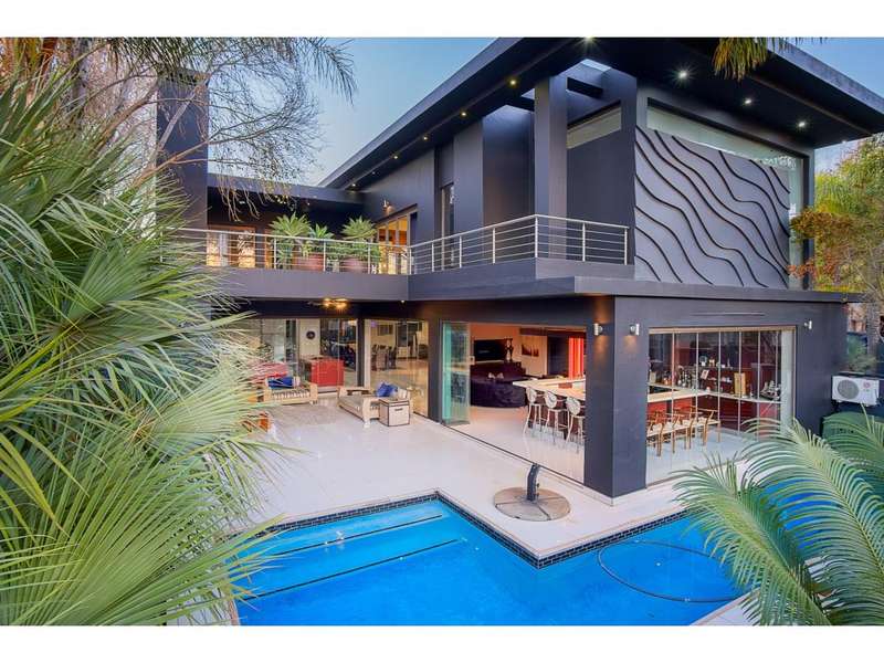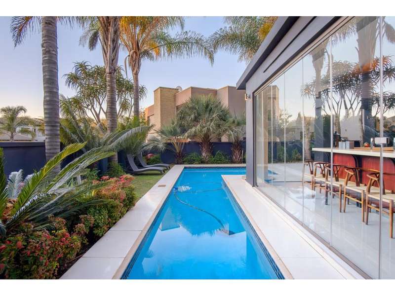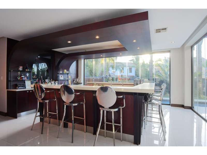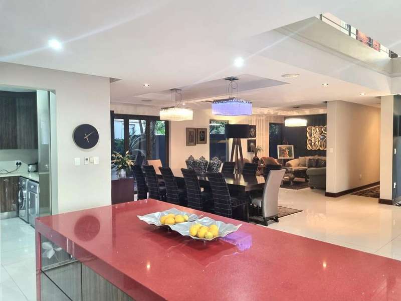Located in a quiet cul-de-sac in Midstream Estate Proper, this modern, immaculate, luxury family home offers the exeptional: The double volume entrance features two beautul chandeliers, and a sweeping staircase to the living quarters upstairs. Downstairs you will find the ultimate in entertainment areas: * this open plan area (279m2) consists of * a generous formal lounge area, * a 14 seater dining area with fireplace. * a stunning hi-end kitchen, * enormous TV lounge area and * 12 seater bar area with 2 built-in kegs. This entire frontage of living area is closed in with glass fold-away glass doors. Opening these glass sliders extends the entire living area onto the exspansive patio, the swimmingpool and garden. * Next to the bar is a temprature controlled walk-in wine celler. * The gourmet kitchen includes: ~ 2 x freestanding Elba stainless steel stoves with Gas burners, electric ovens and warming drawers. One of the stoves include a fish-burner. ~ Two state of the art AEG extractors above the stoves. ~1 x Conventional eyelevel oven with warmer. ~1 x Coffee grinder and coffee machine. ~ Beautiful white granite tops, complimented by light high gloss cabentry. Ample storage. ~ Two extra large waterfall red quartz islands, adds work space, storage and seating for 6. ~ A sparate scullary and laundry with space for all your electronic equiptment. ~ Walk-in pantry, ~ Veggie prep basin close to stoves. * There is a study on the ground floor, * as well as a guest W/C * Direct access from the house to the 4 car garage. * a Seperate laundry. * servants quarters or flatlet with private entrance. * A garage accommodating 4 vehicles side-by-side. Upstairs is: * 4/5 x large bedrooms. (Main bed = 78m2) * 4 x bathrooms (3 is ensuite). All the bathrooms are full bathrooms with walk-in showers, towel warmers, underfloor heating and heating/cooling air controll, double vanities and spa- baths in some, and multiple shower heads in the main bathroom shower. ~ Walk-in/walk-through cupboards in all the rooms. ~ wooden flooring in 3 bedrooms and main bedroom has carpeting. ~ Main bedroom features aluminium framed glass sliders, openening onto a private patio. * A dedicated soundproof home theater/cinema room. Even the roof in this area has been soundproofed. Can also serve as an additional bedroom.