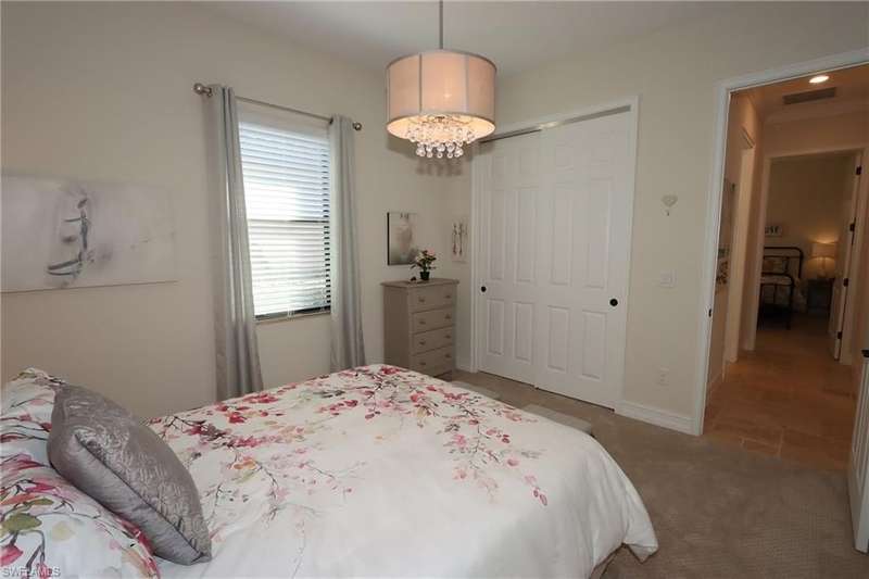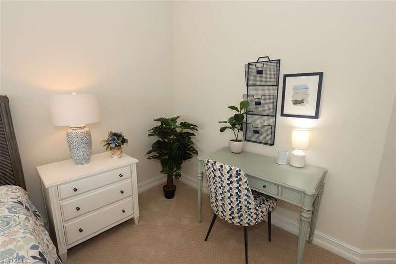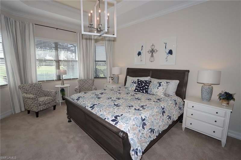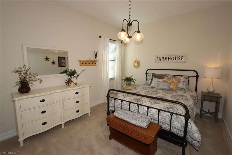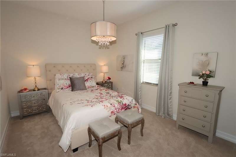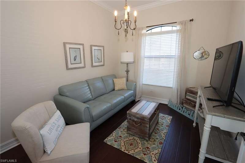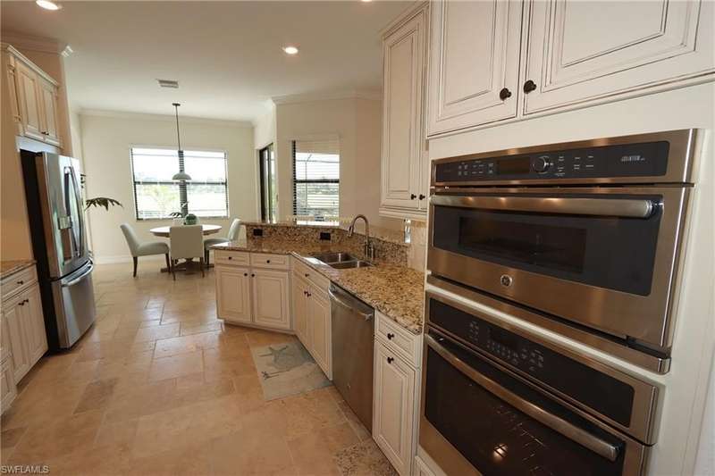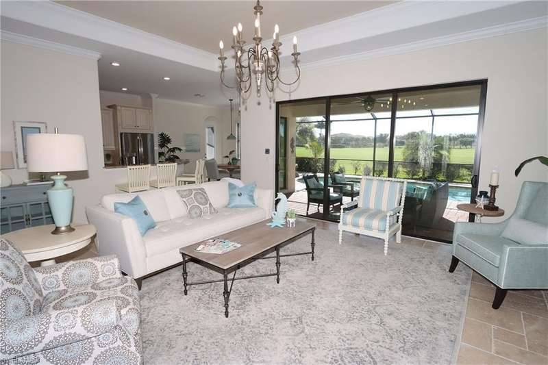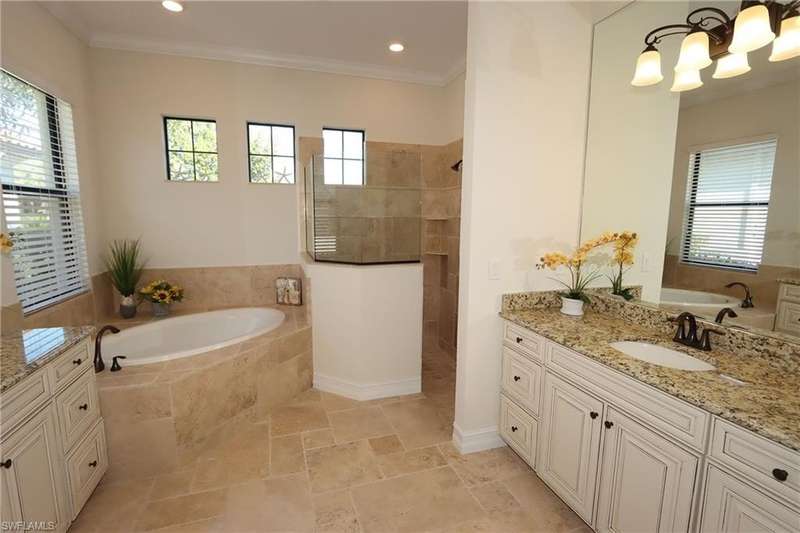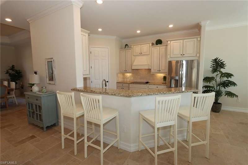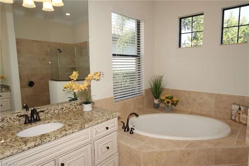 Beautiful open floor plan home with social membership and golf course view. The home features 4 bedrooms, 2 and 1/2 baths and a 3 car garage. The owner has made this the perfect get away with ping pong table and corn hole boards for guest enjoyment. The open kitchen is light and bright with upgraded cabinets, stainless steel appliances, and granite countertops. Other upgrades include: premium light fixtures, crown molding, custom paint, and travertine flooring. The Master bedroom features a King size bed, walk in closet, ensuite bathroom with walk-in shower and soaking tub. Guest bedrooms with queen beds, share a guest bathroom. Den features sofa and flat screen Tv. The large screened in lanai has a heated pool and spa, an outdoor kitchen, paver deck, and a wide open view of the golf course. This home shows like a model. Bonita National is a gated community with outstanding amenities including a resort style pool, restaurant and outdoor tiki bar, fitness center, spa, tennis courts, and 18 hole golf course. Located close to the airport, shopping, dining, and beaches.