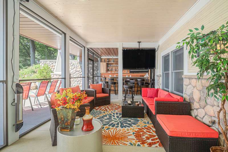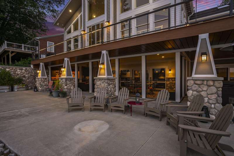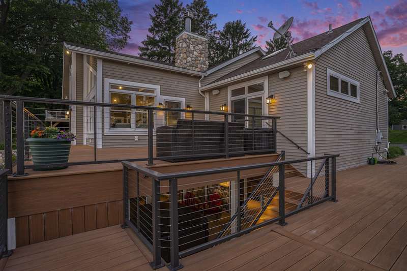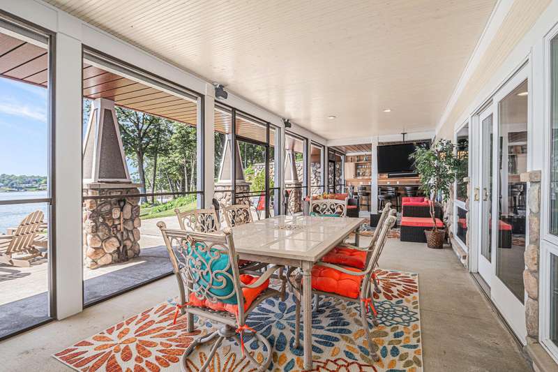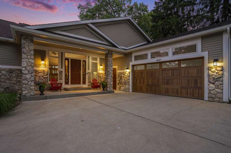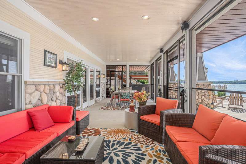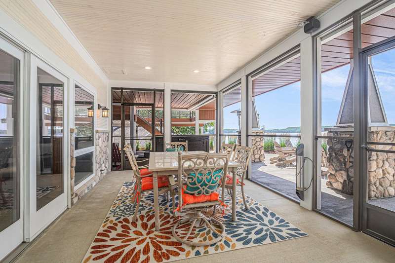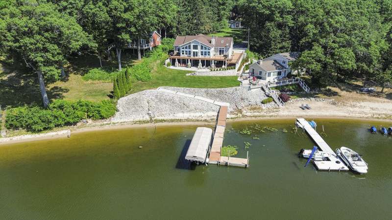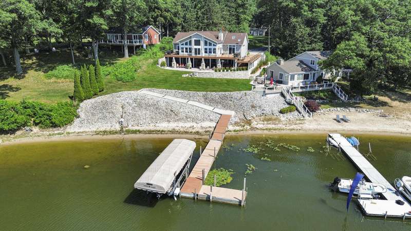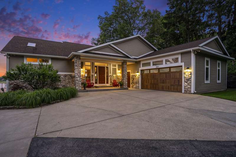 Entertain friends and family at this SPECTACULAR elevated waterfront home on 1.13 acres overlooking Mona Lake w/access to Lake Michigan. Enjoy amazing lake views from every room of this 4,350 sf lake house w/stone accents. The living room is highlighted by a stone fireplace w/built-in cabinetry, connected to a sunroom w/2-story windows, vaulted ceiling and access to over 2300sf of outdoor living space. The kitchen offers quartz counters, double oven, large dining room w/access to the office/bedroom, full bath, & laundry. The Master suite has a walk-in closet, whirlpool tub and access to the deck. Downstairs is a partial kitchen, stone fireplace, great room w/pool table, 2 bedrooms, full custom bath and storage. There is an additional screened in patio w/full built-in-bar and eating area. Outside the home you'll enjoy the additional 3-stall garage, hot tub, and concrete ramp to the floating dock. Mona Lake boat club is located directly across the lake.