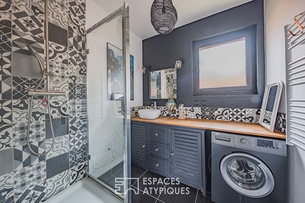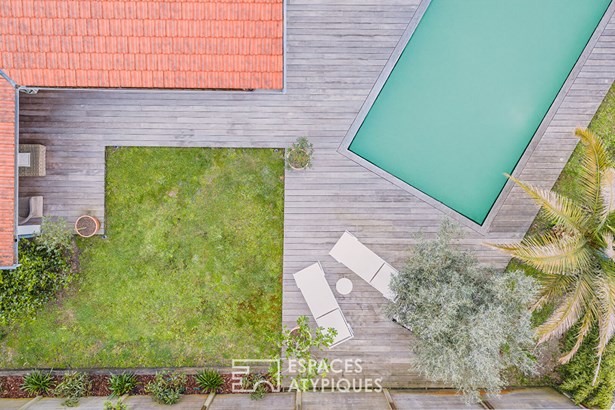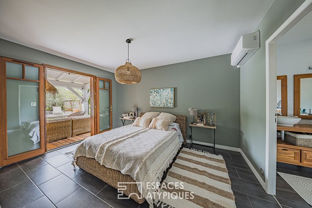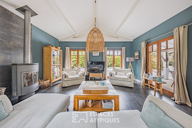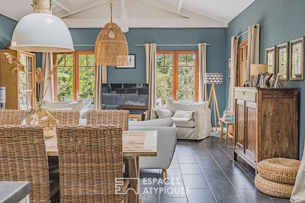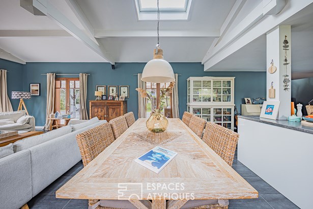 Inside, the welcome is given by a pleasant hall which offers a beautiful perspective on the 63 sqm of the living room and its superb fully equipped open kitchen, whose central island proudly imposes itself. The living room and its cathedral ceiling are bathed in light thanks to its triple exposure and its skylight. The atmosphere is peaceful and bright, extending naturally to the outside through numerous openings.