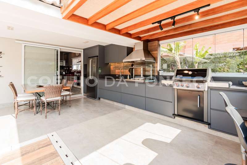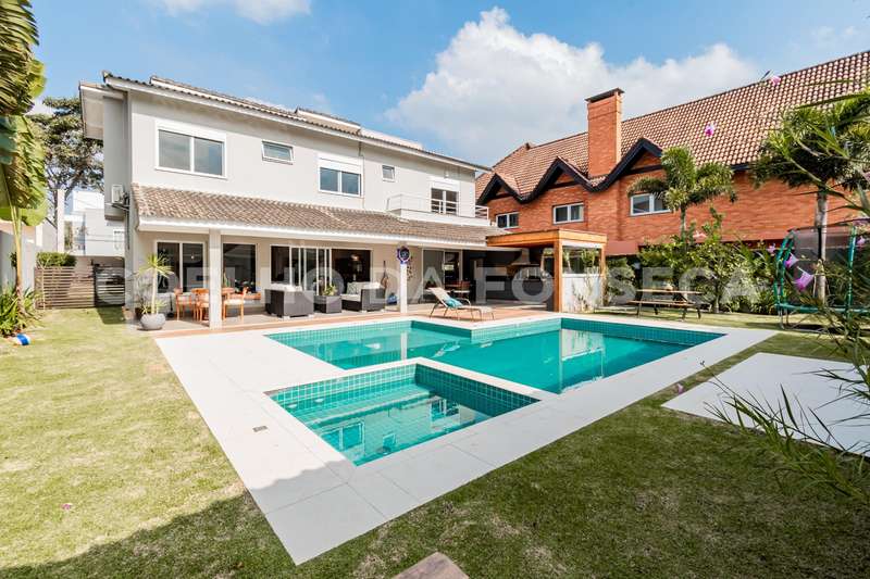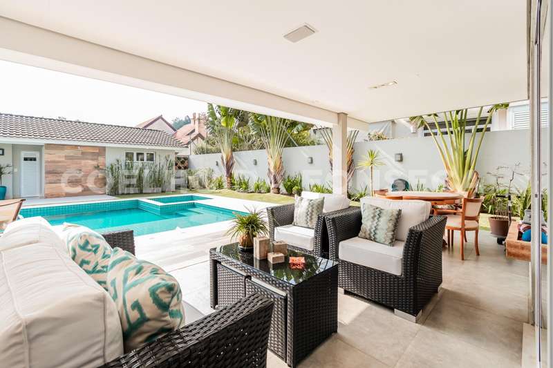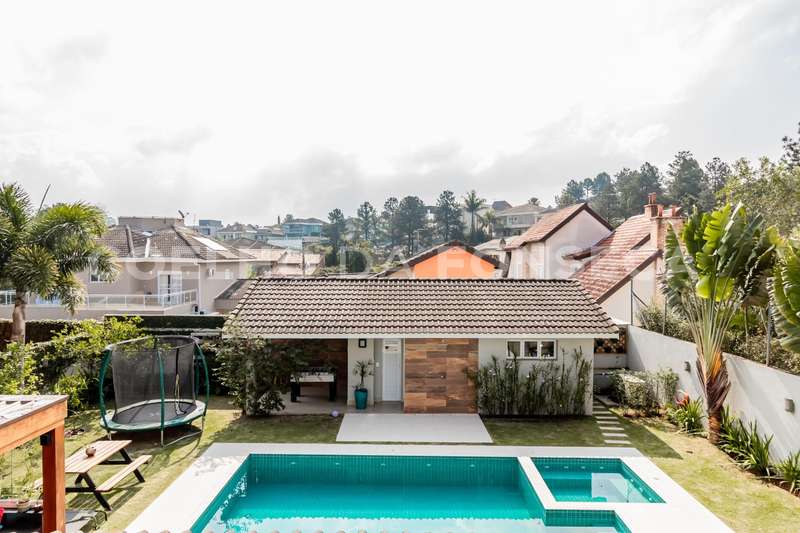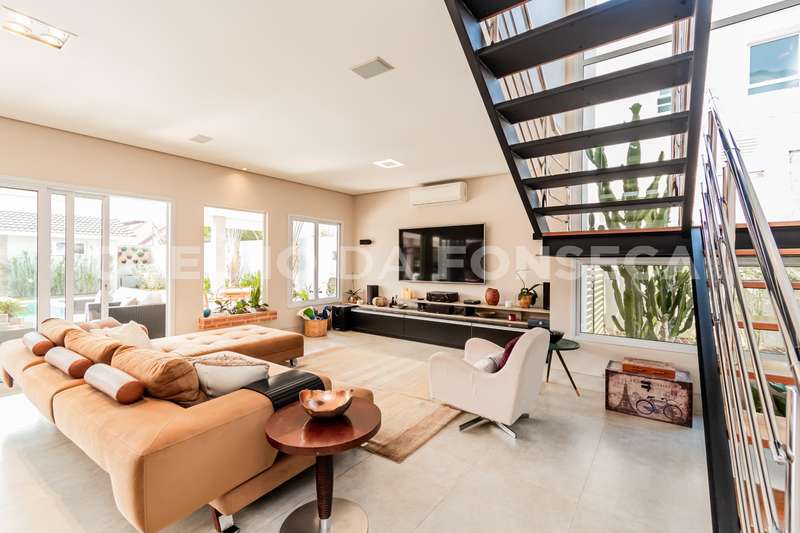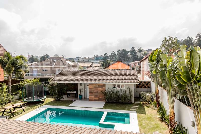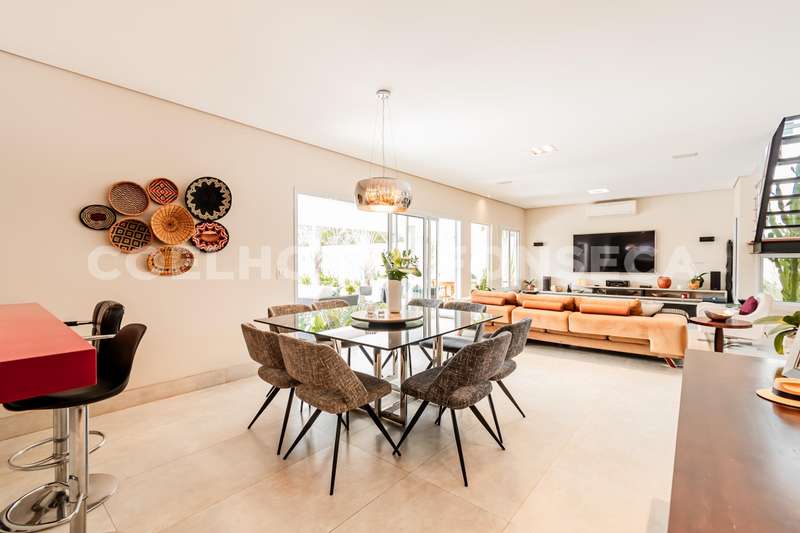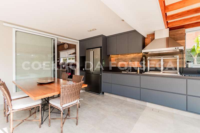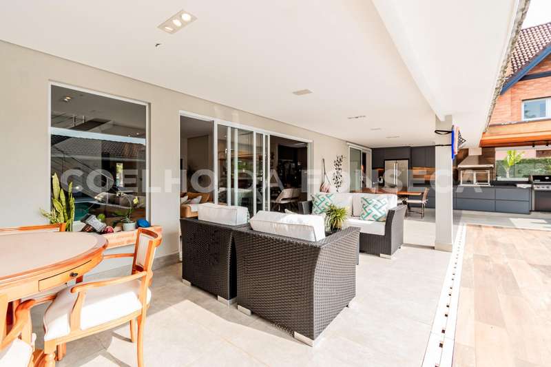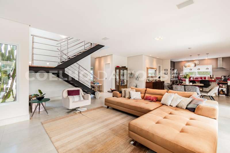 Casa em Condomínio no bairro Aldeia da Serra com 440m² área construída, 4 dormitório(s), 4 suíte(s), 3 vaga(s), 7 banheiro(s), piscina, escritório, sauna, mobiliado (a), ar condicionado, dep. de empregados, varanda, aquecedor solar, pé direito duplo.