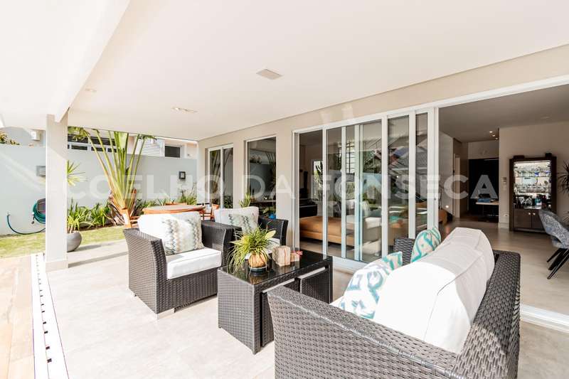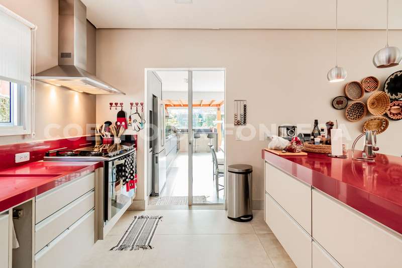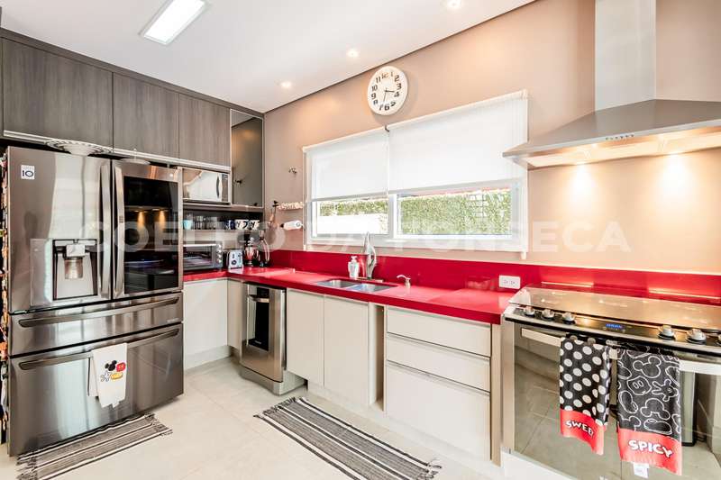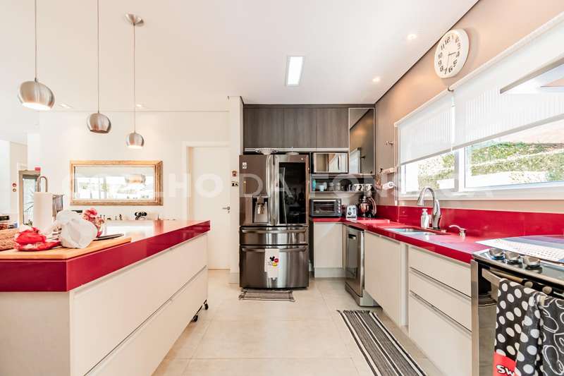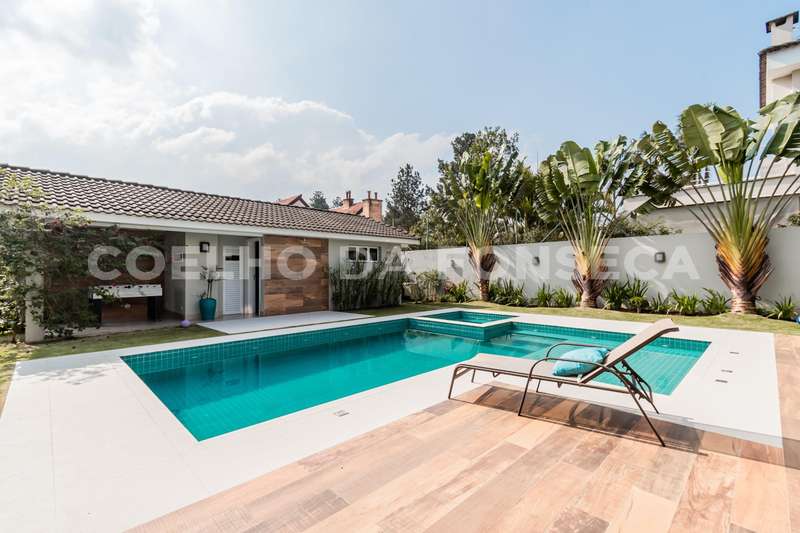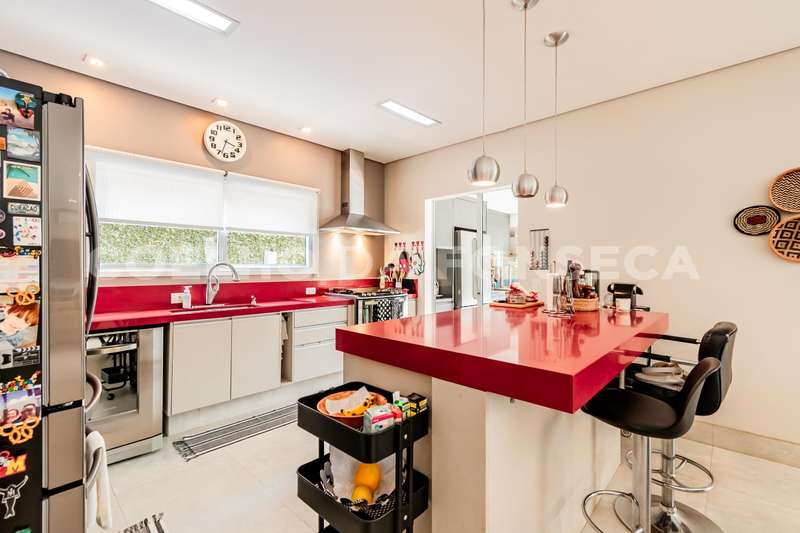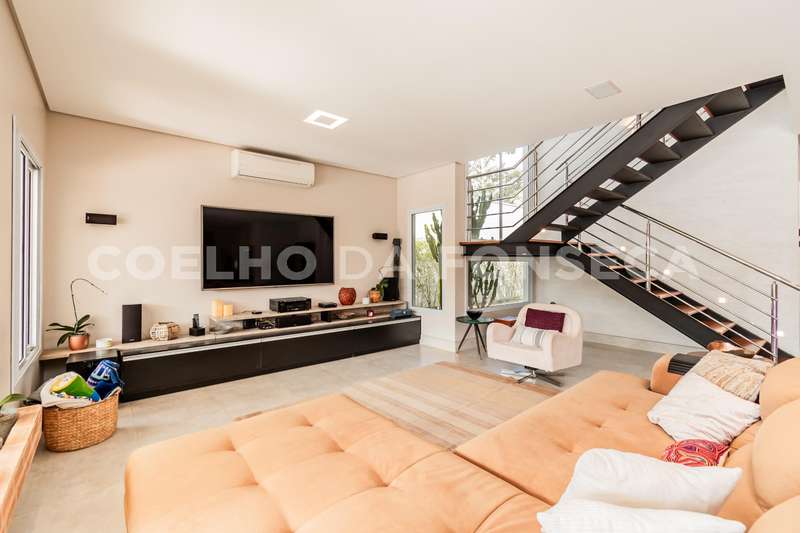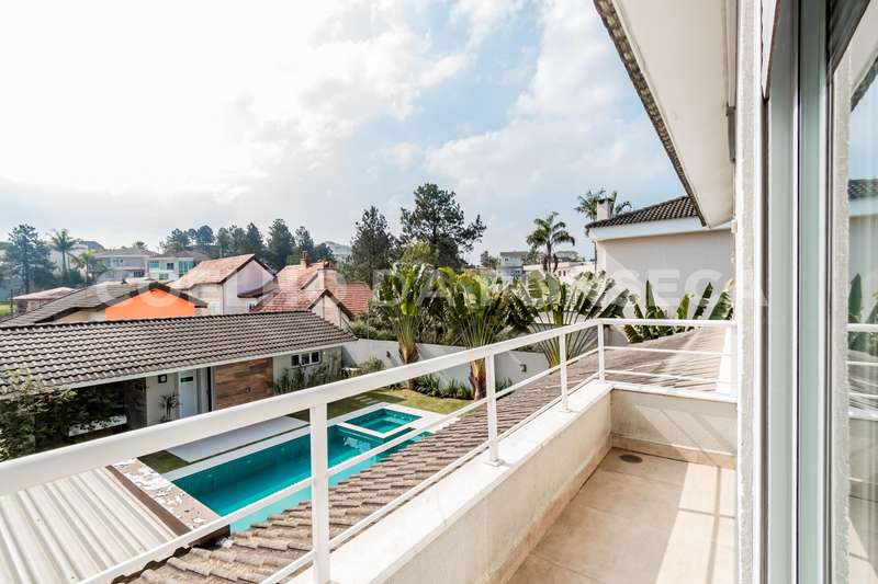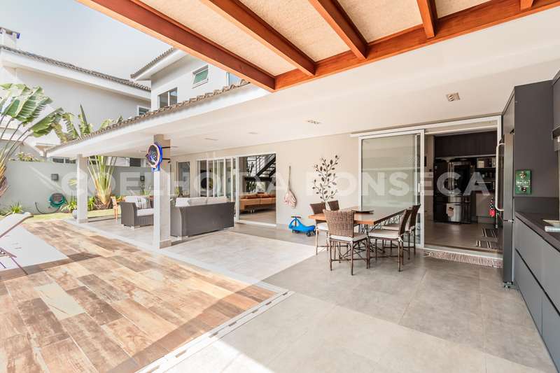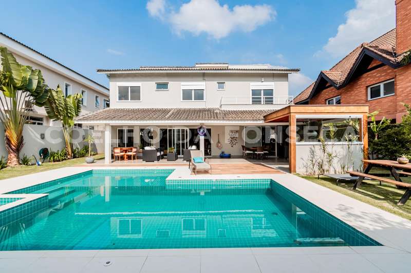 Casa em Condomínio no bairro Aldeia da Serra com 440m² área construída, 4 dormitório(s), 4 suíte(s), 3 vaga(s), 7 banheiro(s), piscina, escritório, sauna, mobiliado (a), ar condicionado, dep. de empregados, varanda, aquecedor solar, pé direito duplo.