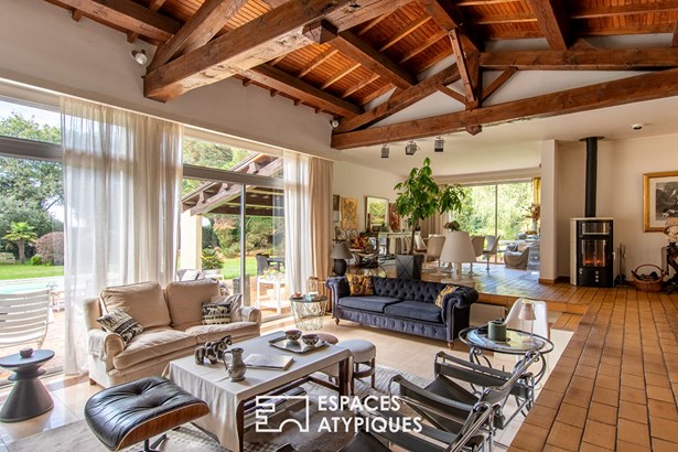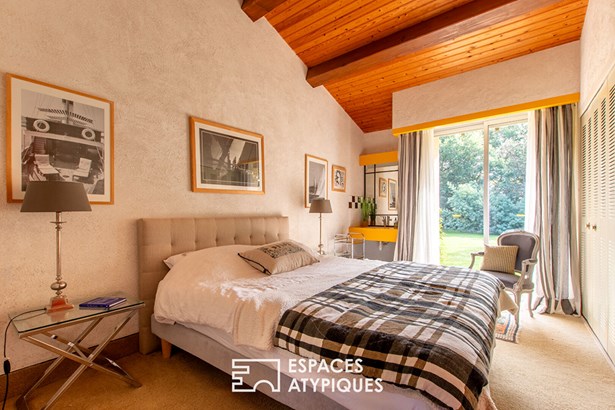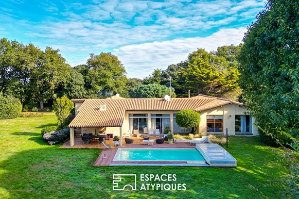 Built in the middle of a one-hectare wooded park in Le Sables d'Olonne, this single-story architect-designed villa from the 1970s exudes calm and Californian spirit. With its 213 sqm of living space, it offers a unique living environment, ideal for welcoming family and friends in a warm and intimate atmosphere.