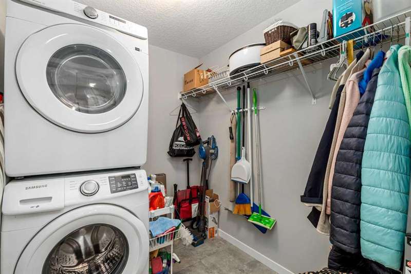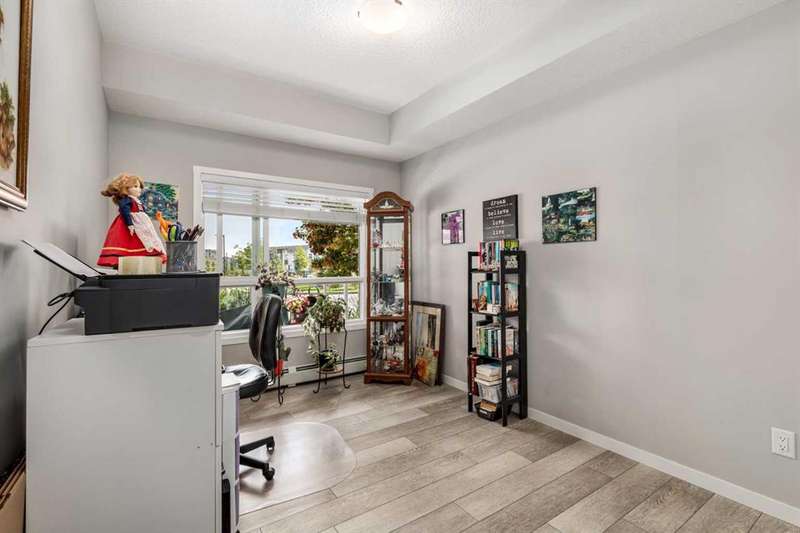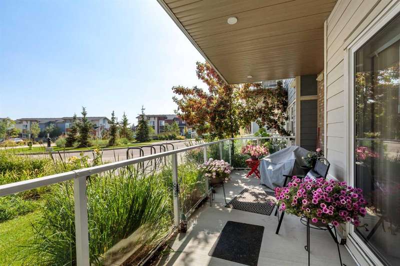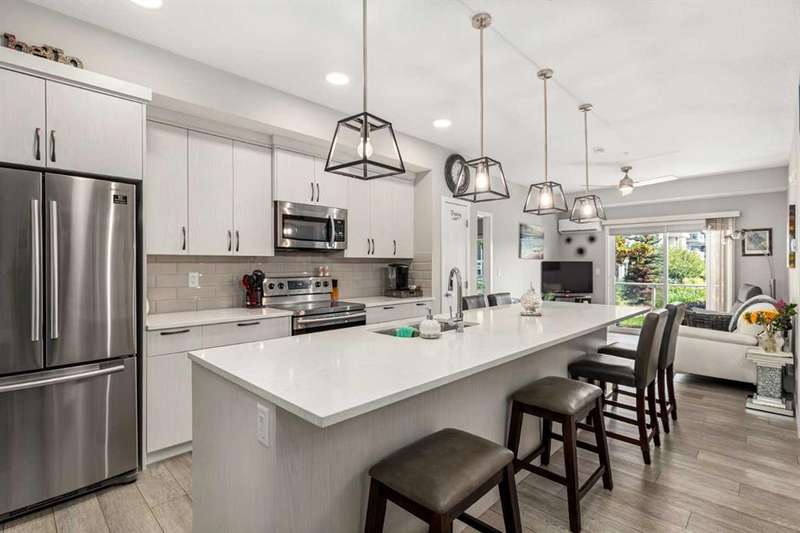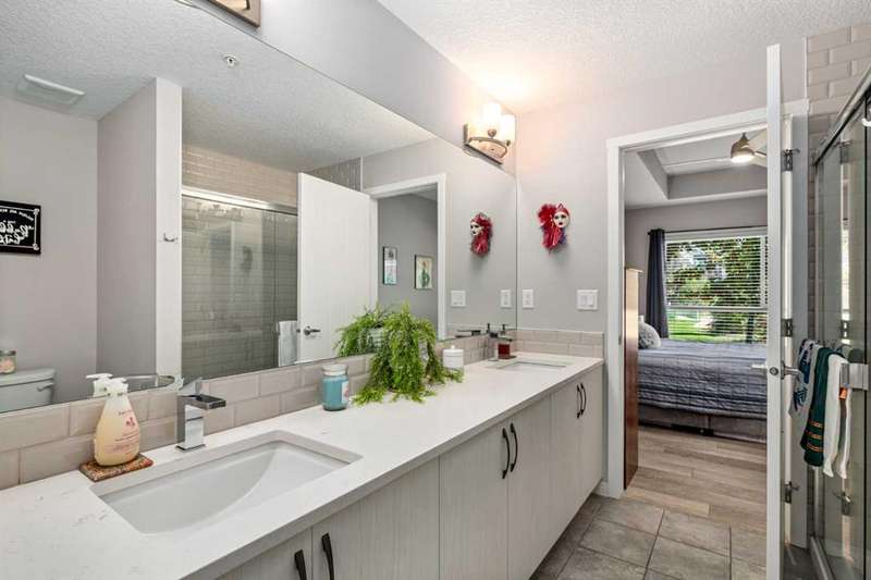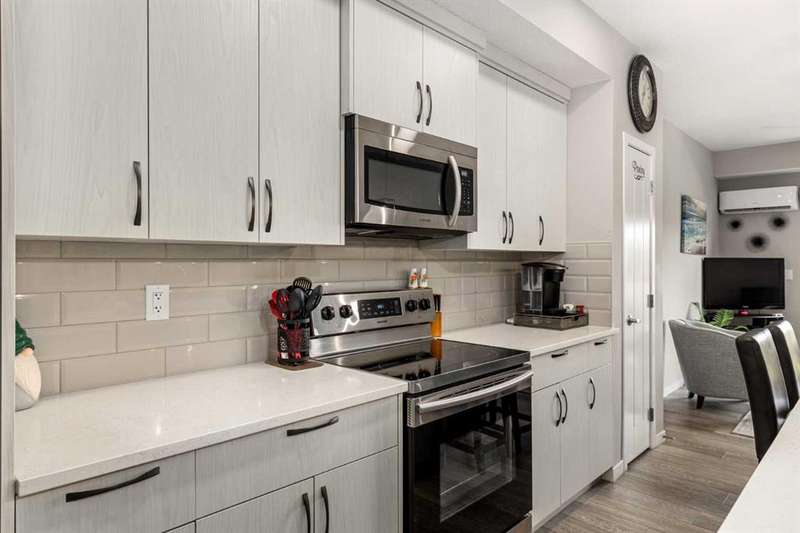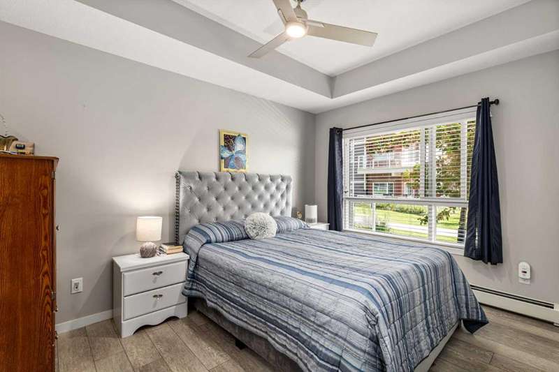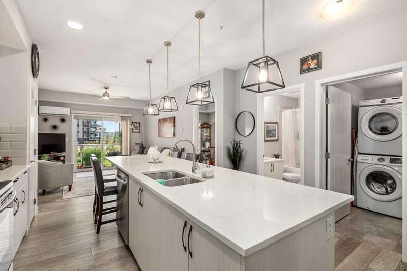 Harvest Hills Beauty - TWO Bedroom, TWO Bathroom Condo ready for its new owners. Tons of upgrades such as Upgraded Backsplash, Tiled Shower, LVP throughout, SOFT close drawers, Ceiling FANS x 2, AND Air Conditioning. Immaculate suite and convenient Ground floor level for easy access out - No Hauling your groceries up the Elevator! Best Location in the complex with an East Facing Patio to enjoy your morning coffee. 9 Foot Ceilings and Huge Windows which offers lots of Natural Light. Island can seat 12 people for your Thanksgiving Party this year - Stainless Steel Appliance package and Winter White Cabinets add to the AMBIENCE in this space. The Bedrooms are situated on opposite sides of the suite, ensuring both privacy and convenience. Additional features include ductless AC - providing year round Comfort and a separate storage Locker (just a few steps down the Hall). PETS are welcomed here with board approval, allowing 2 dogs or 2 cats, each with a maximum weight of 35 kg. The HEATED Parkade offer a titled Parking stall, and secure bike storage, ensuring both safety and accessibility. MOVE IN CONDITION - PROMISE!
