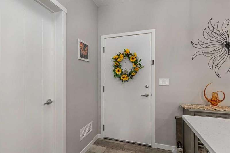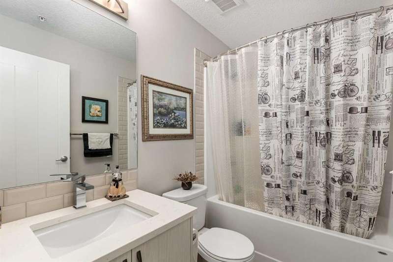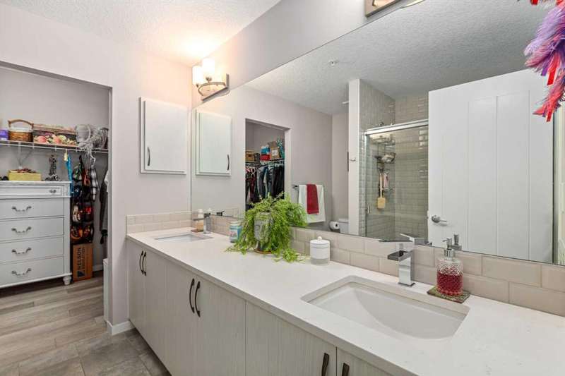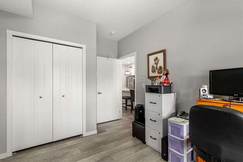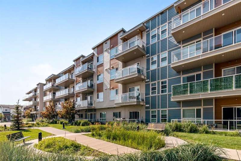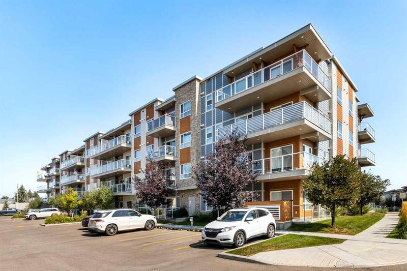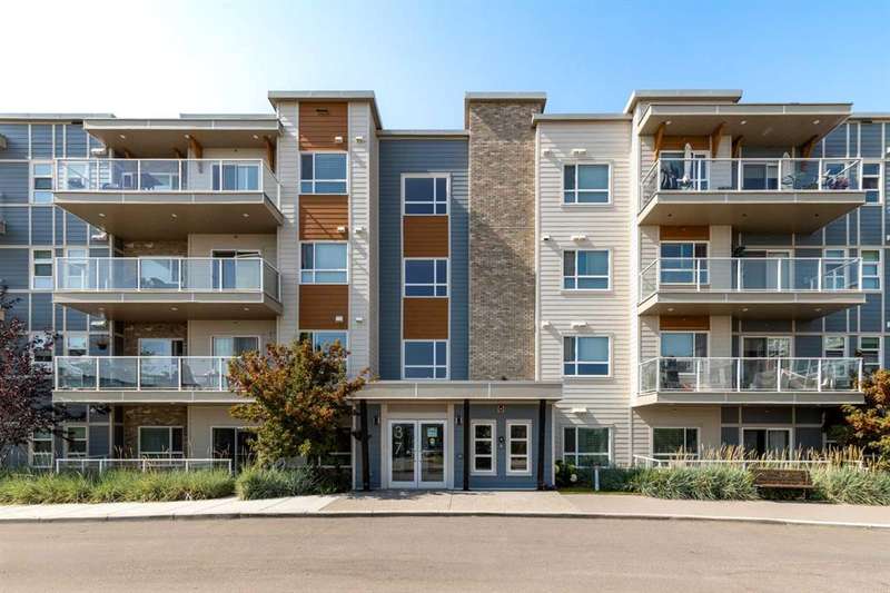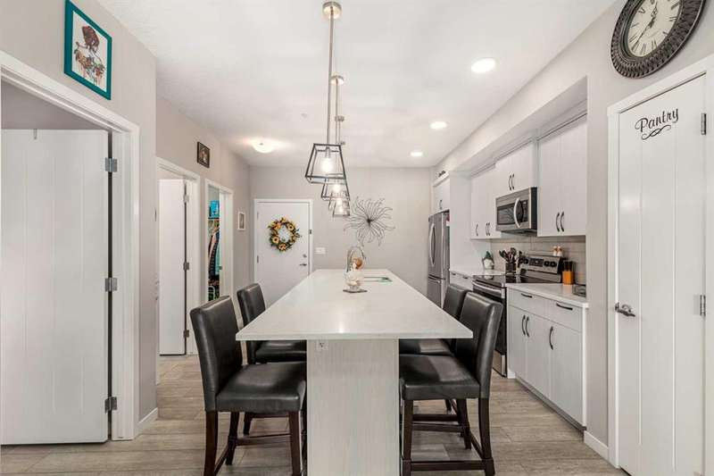 Harvest Hills Beauty - TWO Bedroom, TWO Bathroom Condo ready for its new owners. Tons of upgrades such as Upgraded Backsplash, Tiled Shower, LVP throughout, SOFT close drawers, Ceiling FANS x 2, AND Air Conditioning. Immaculate suite and convenient Ground floor level for easy access out - No Hauling your groceries up the Elevator! Best Location in the complex with an East Facing Patio to enjoy your morning coffee. 9 Foot Ceilings and Huge Windows which offers lots of Natural Light. Island can seat 12 people for your Thanksgiving Party this year - Stainless Steel Appliance package and Winter White Cabinets add to the AMBIENCE in this space. The Bedrooms are situated on opposite sides of the suite, ensuring both privacy and convenience. Additional features include ductless AC - providing year round Comfort and a separate storage Locker (just a few steps down the Hall). PETS are welcomed here with board approval, allowing 2 dogs or 2 cats, each with a maximum weight of 35 kg. The HEATED Parkade offer a titled Parking stall, and secure bike storage, ensuring both safety and accessibility. MOVE IN CONDITION - PROMISE!