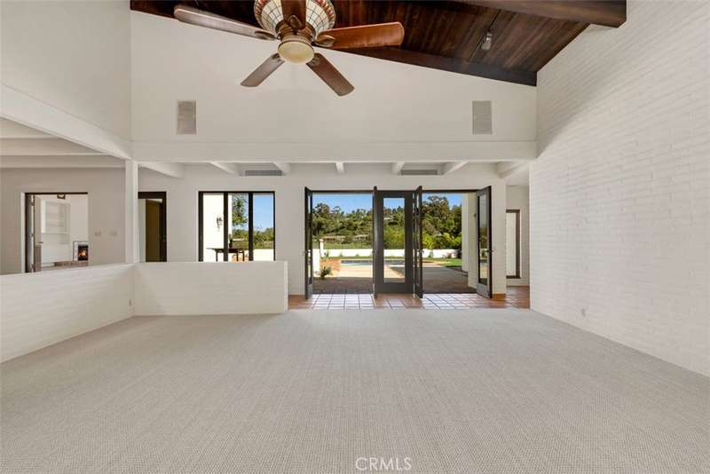 Inside, the expansive living room impresses with soaring wood-beamed ceilings, a dramatic brick fireplace wall, and wall-to-wall windows framing captivating golf course and pool views. The formal dining room and full wet bar flow seamlessly into the family room with a second fireplace and French doors opening to a raised patio for outdoor dining.