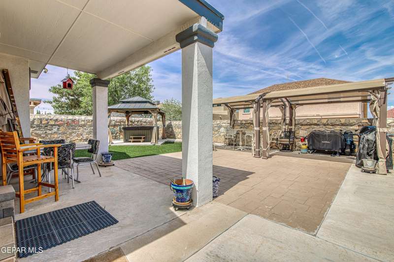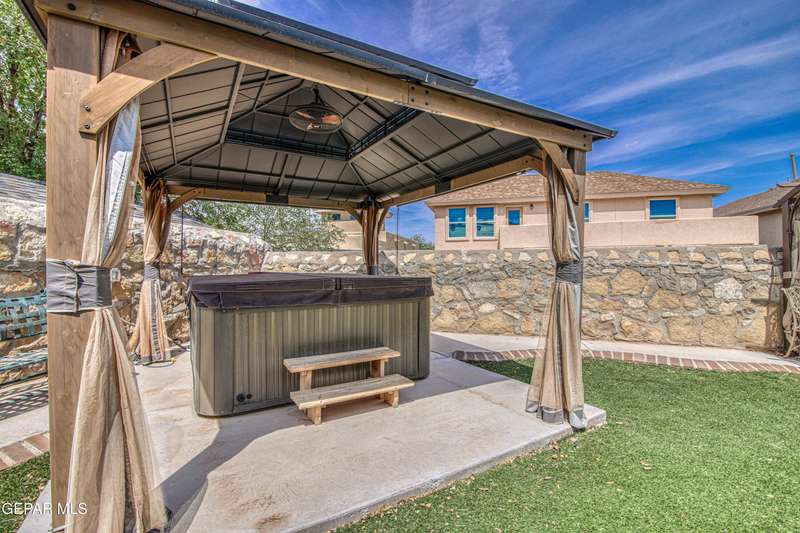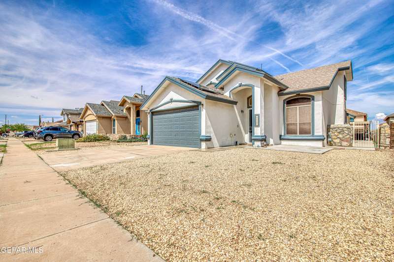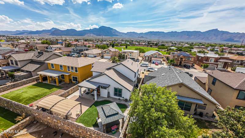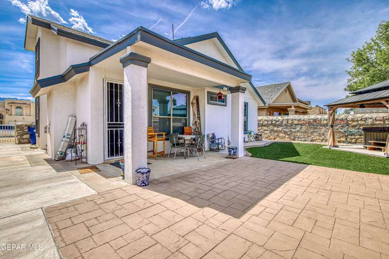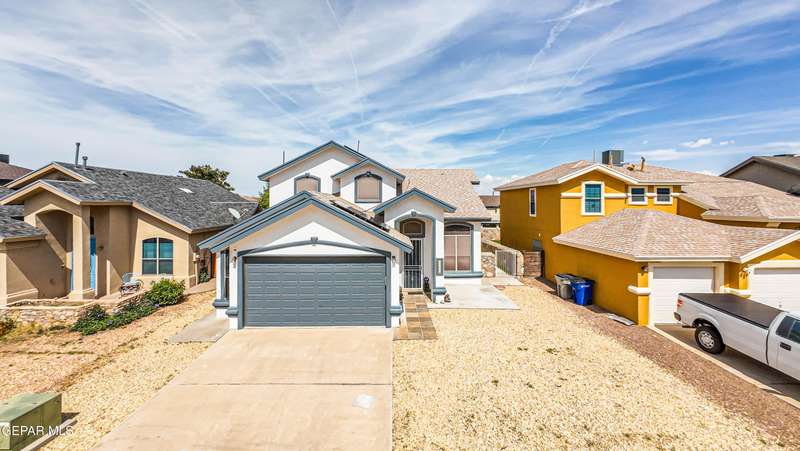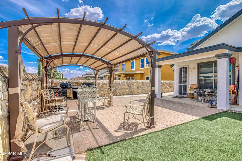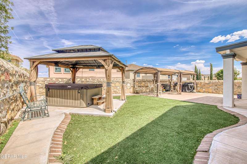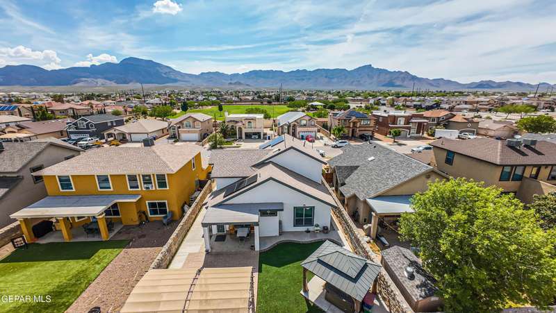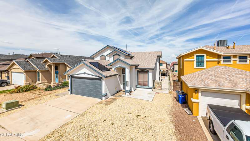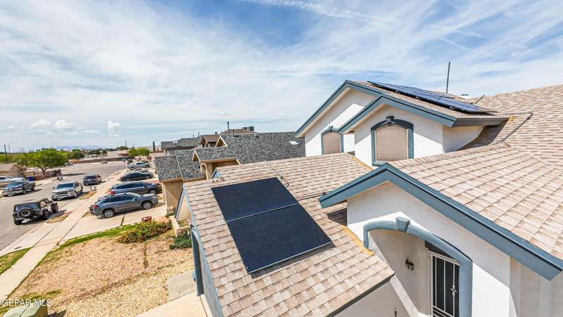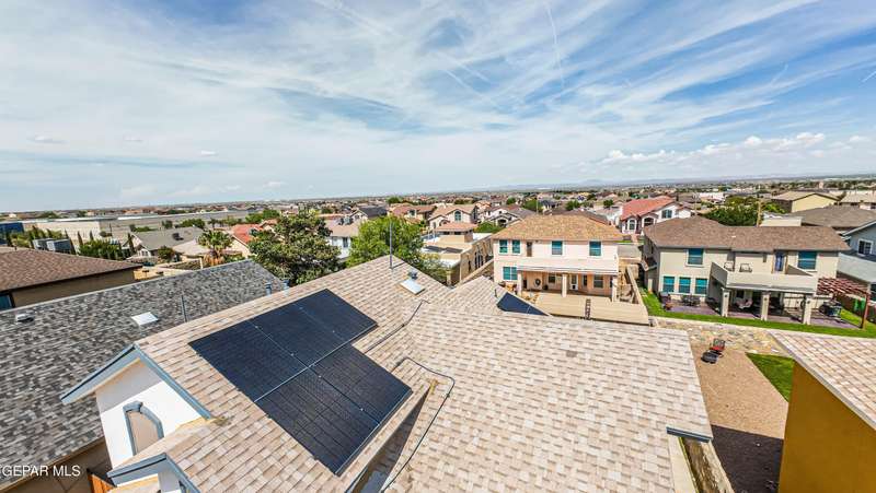 WELCOME HOME! This stunning, move-in ready residence perfectly combines comfort, style, and efficiency. Step inside to a bright, open floor plan with soaring ceilings and seamless flow between the kitchen, dining, and living areas. The beautifully upgraded kitchen features stainless steel appliances, including a double oven and a 2023 LG French door refrigerator, all less than two years old. Upstairs, a spacious loft offers endless possibilities for a home office, playroom, or media space. Enjoy huge energy savings with owned solar panels installed in 2023, seller pays only about $35 per month for electricity. Outside, relax or entertain year-round under the generous covered patio, complete with a hot tub for unwinding after a long day. Ideally located near top-rated schools, shopping, dining, and just minutes from Fort Bliss, this home truly has it all. Don't miss your chance to make this exceptional property yours, schedule your showing today!
