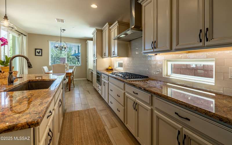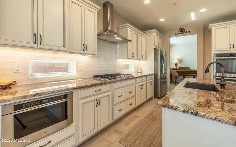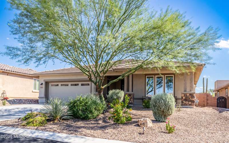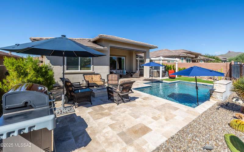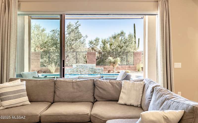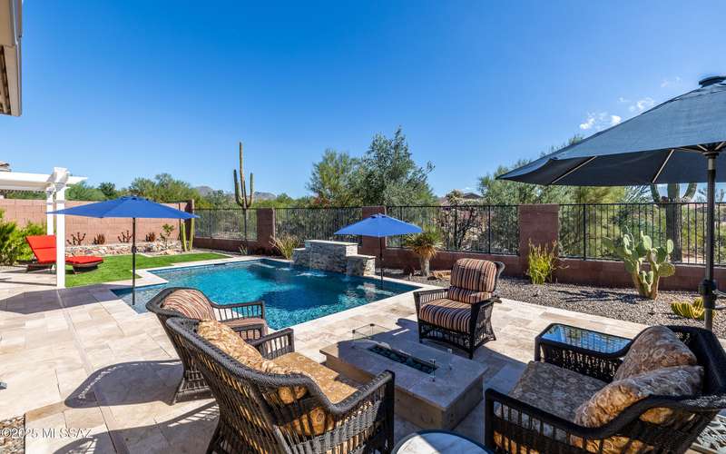 Welcome to resort style living. This residence promises to redefine your concept of luxury living, offering an exquisite blend of comfort and style with an oasis style outdoor paradise and an elegant gourmet kitchen experience. The home showcases bold style in an engaging living design w/plentiful amenities. Beautiful sparkling pool w/mesmerizing waterfall features, separate bubbling & therapeutic hottub/spa under a private ramada plus abundant patio & porch seating areas. Backing to natural desert habitat w/mountain views and seasonal sunrises are yours to enjoy. The kitchen is one of the most spectacular designs in Dove Mountain. Spacious kitchen dining, and if desired a large formal dining room (or billiards room or extra gathering area). Double door den/office, too! A great home!