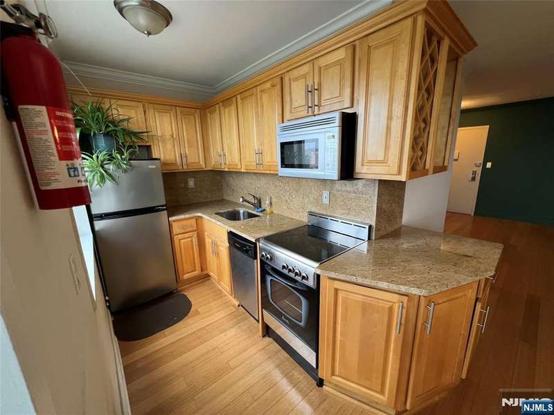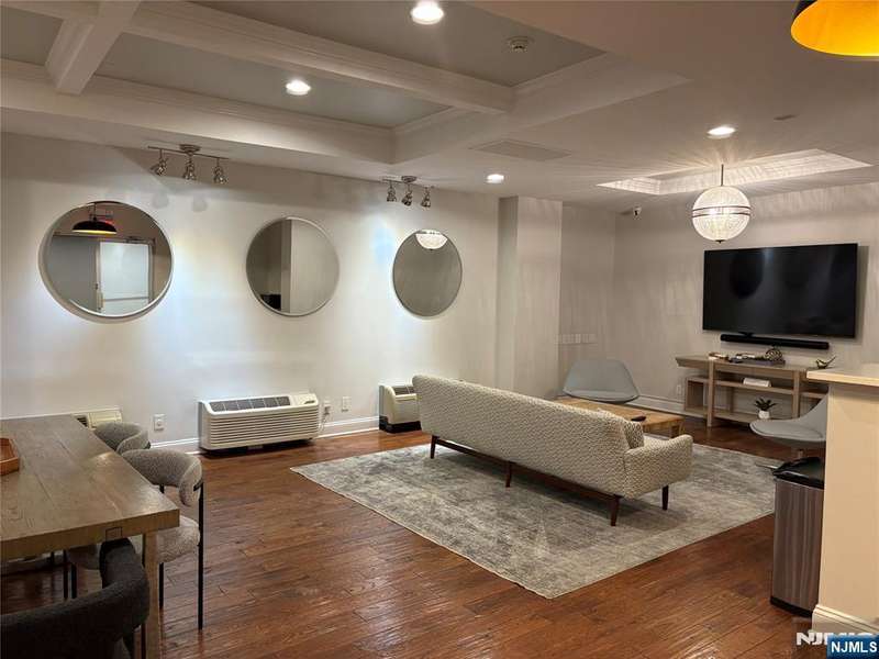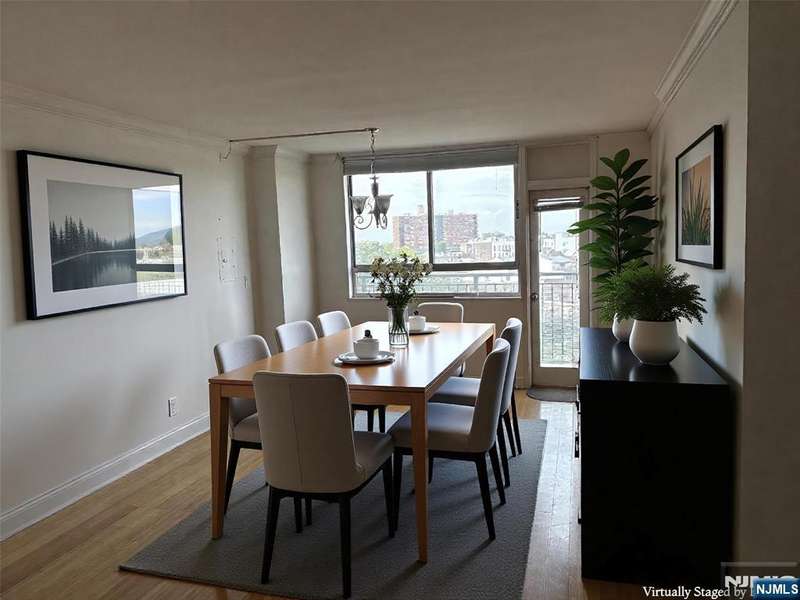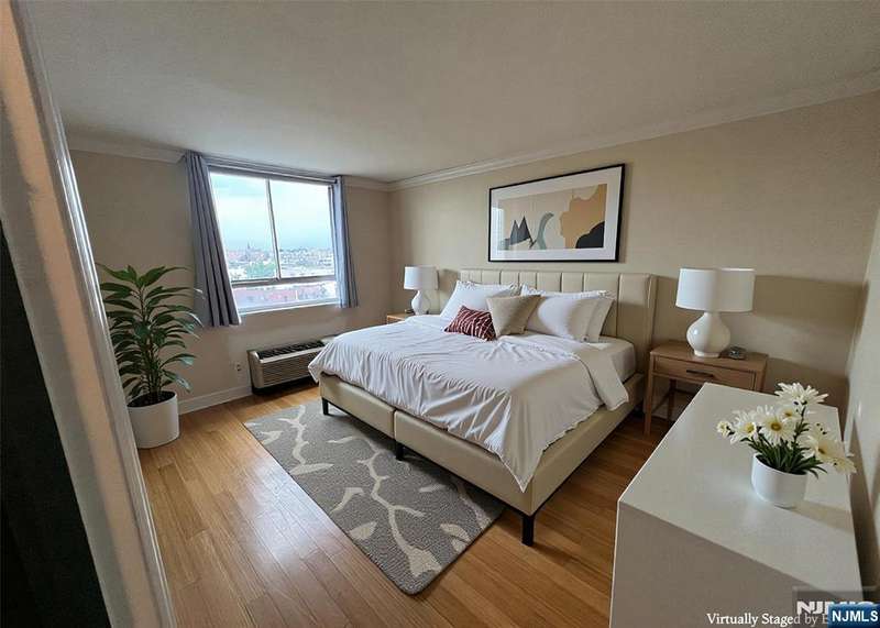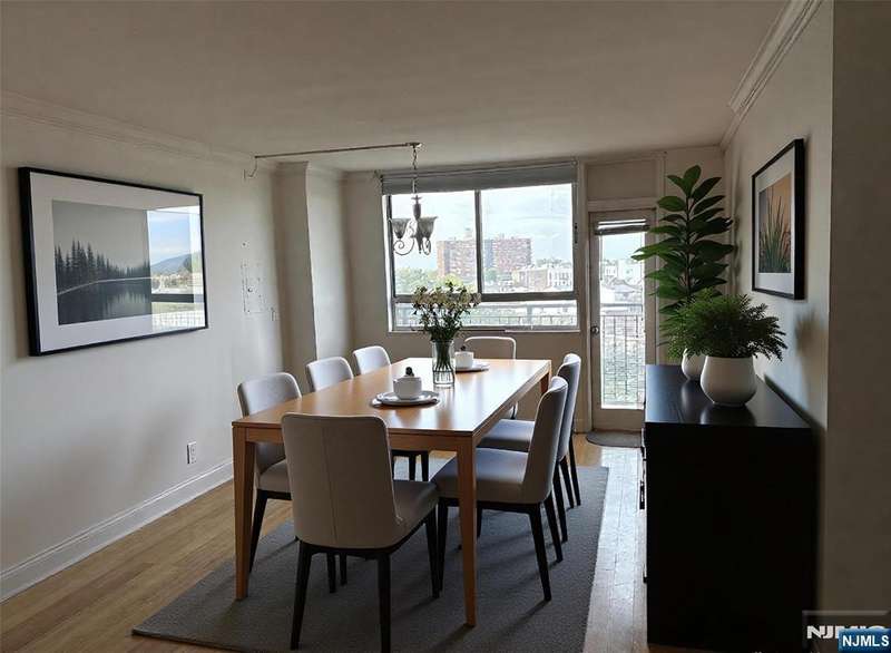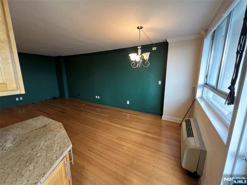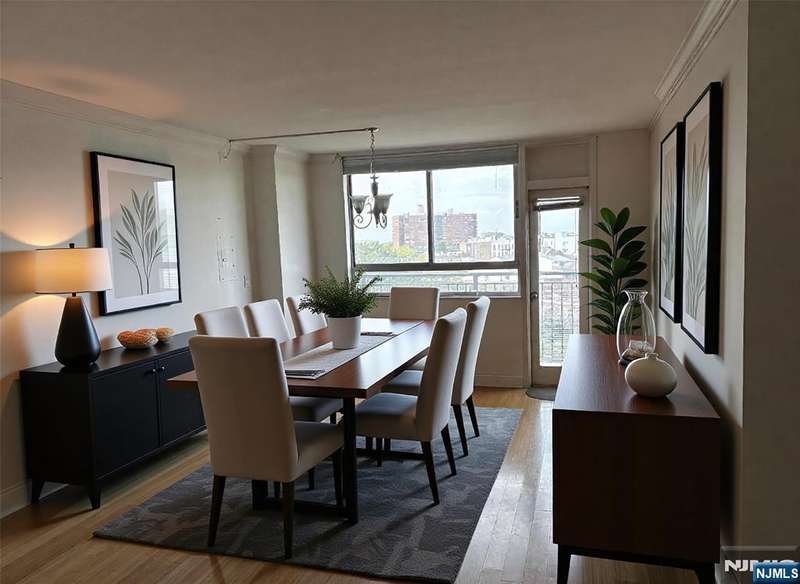 This charming 695 sq. ft., one-bedroom, one-bath condo offers a spacious living/dining room combo, a functional galley kitchen, and laminate flooring throughout. High ceilings with crown molding, large closets, and a private balcony with stunning views complete the space. Enjoy 24/7 building staff and fantastic amenities, including a heated pool, sundeck, courtyard, co-working space, resident's lounge, table tennis, gym, deli, storage, dry cleaner, laundry, and on-site daycare. Located near Washington Park and bordering Hoboken/Jersey City Heights, you'll have easy access to NYC via Express Bus, Light Rail, or the free shuttle to Hoboken PATH. Hoboken's top spots like Trader Joe's and ShopRite are just an elevator ride away. A low monthly fee covers taxes and utilities (electric, AC, heat, hot and cold water). This is the perfect blend of convenience and comfort! Vacant available immediately