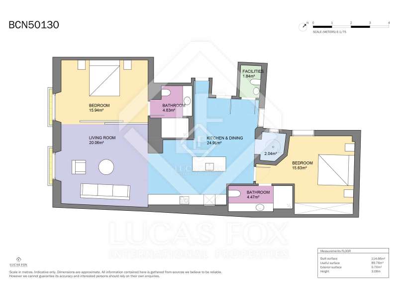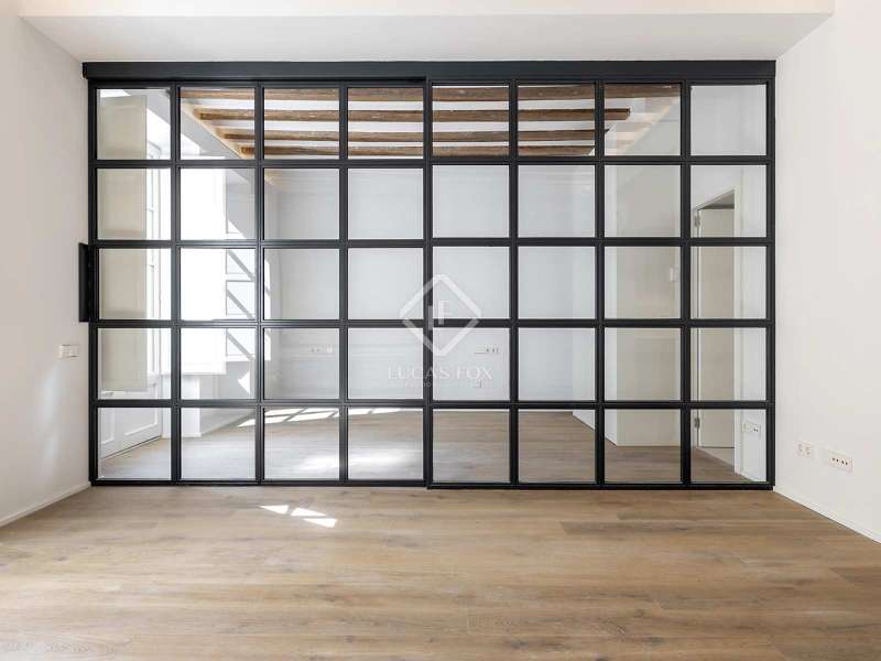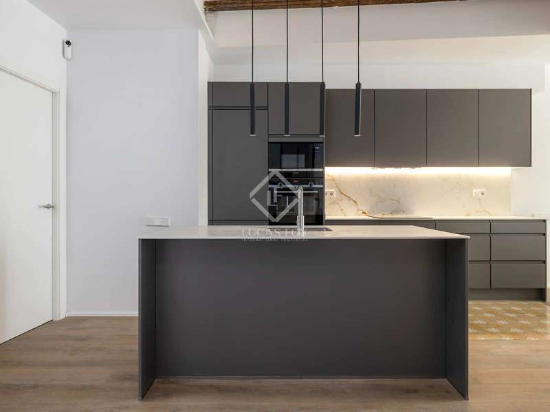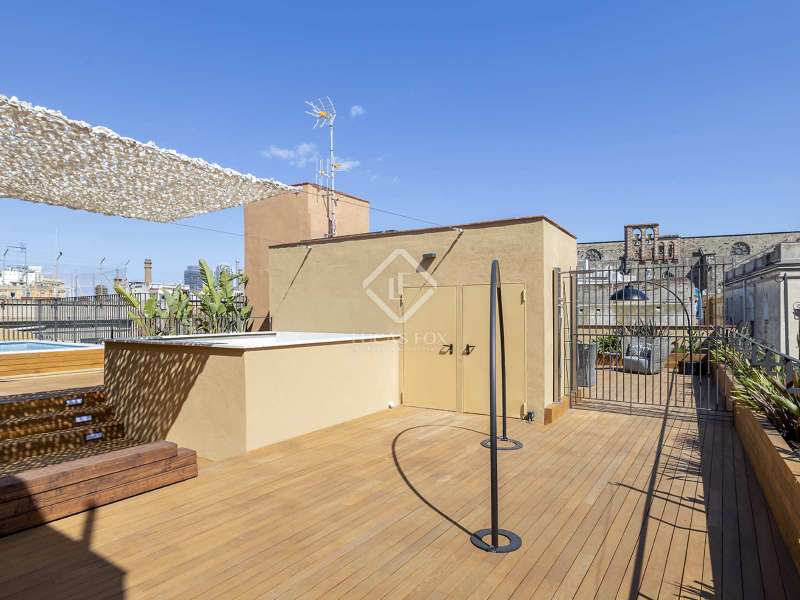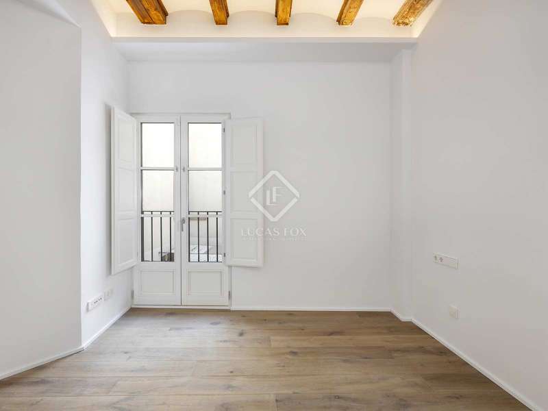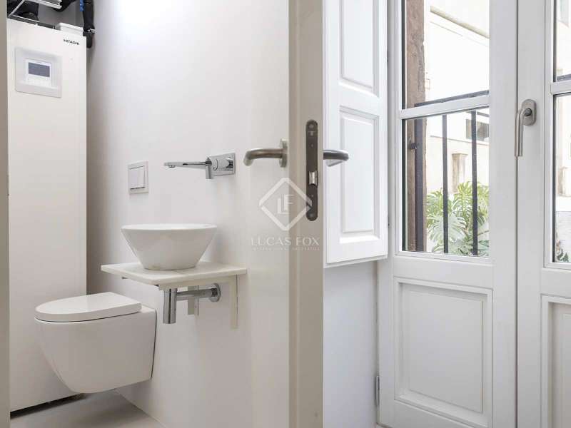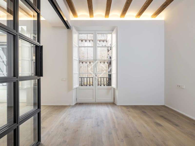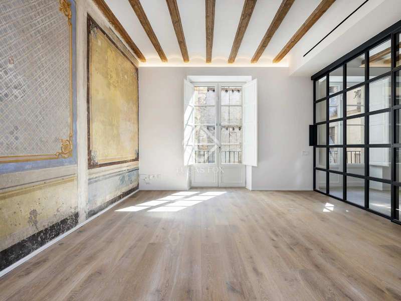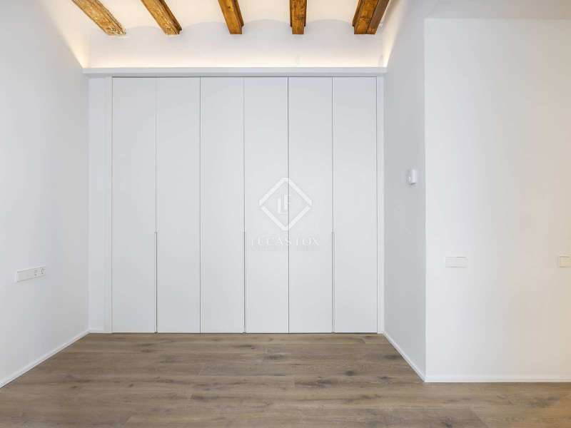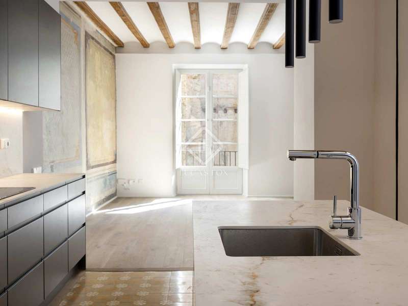 Lucas Fox presents the new build development Banys Vells, in a remodeled listed building located in the Born neighbourhood of Barcelona. The building is located in the walls of the old medieval baths, which is where it gets its name. The development has only five elegant apartments, as well as two commercial premises, so it enjoys great privacy. This 114 m² apartment is very spacious. The day area is presented in an open-plan living-dining room room with an open-plan kitchen, with a total of about 52 m². The kitchen has a central island and comes equipped with appliances. The night area includes two bedrooms: a double bedroom and the main bedroom with a private bathroom with shower and built-in wardrobe . The property is completed with a second bathroom with a shower. During the remodeling, the most representative period elements have been maintained or restored, such as exposed wooden beam ceilings, hydraulic tiles, brick walls and frescoes. All this gives an atmosphere of nobility to the property. However, these period elements have been combined, for total comfort, with modern equipment, such as a kitchen from the German brand Nolte with Siemens appliances , white Neolith Abu Dhabi countertops; and seamless bathrooms in matte light gray microcement, matte black ceramics, furniture and taps from Duravit. On the other hand, the property includes wooden windows and balconies with double glazing and shutters and underfloor heating powered by aerothermics. The development offers its residents a magnificent roof terrace for communal use, which comes equipped with a swimming pool, exterior kitchen, chill-out space, exterior shower with hot and cold water and a bathroom. From here, you can see the views of the old town of Barcelona, more specifically, some of the most beautiful churches in the area, such as Santa María del Mar. Finally, the development offers a lift that connects all floors and a lobby spacious with bicycle parking. Get in touch for more information.