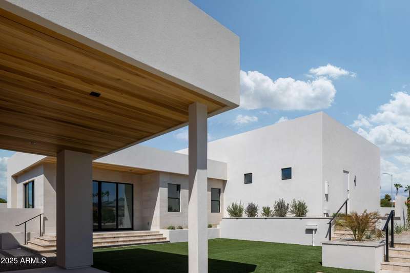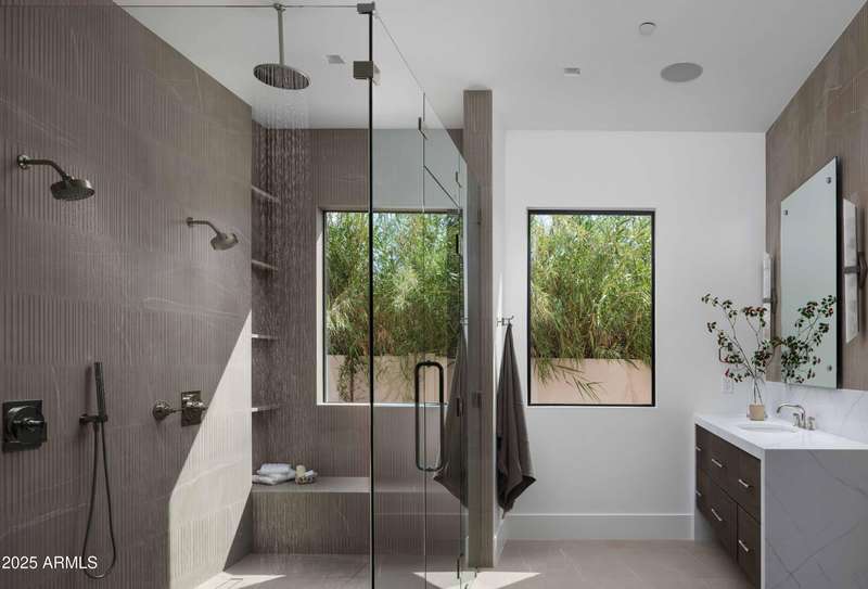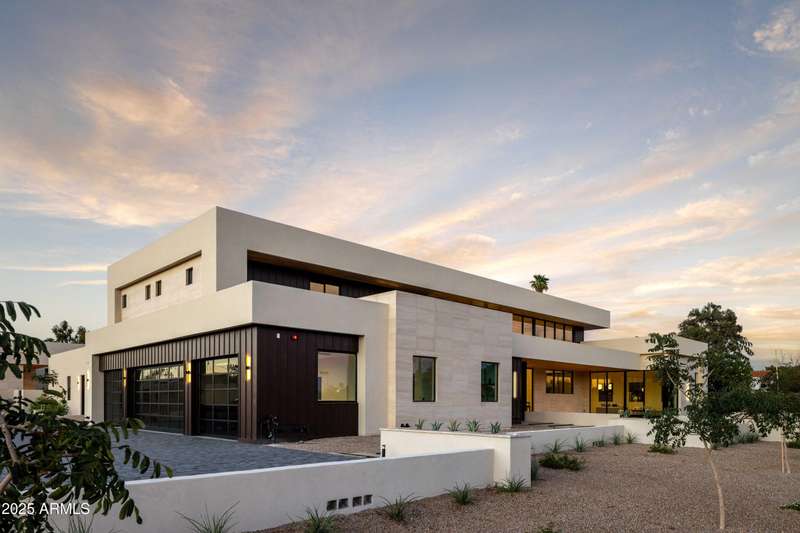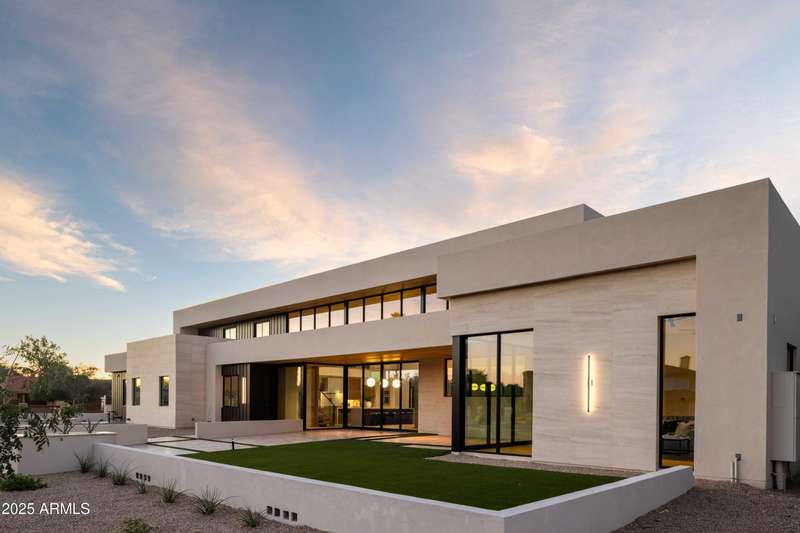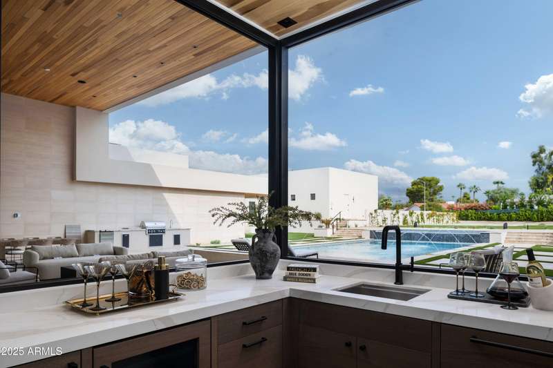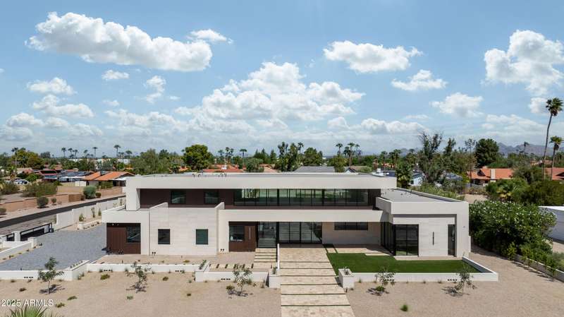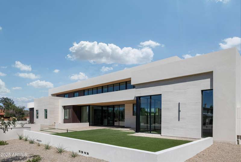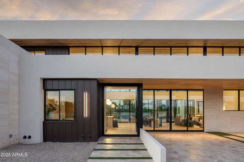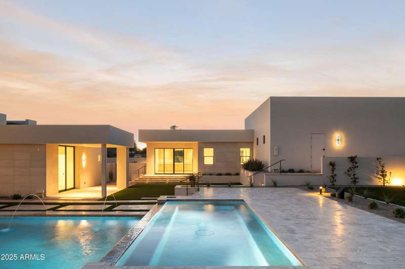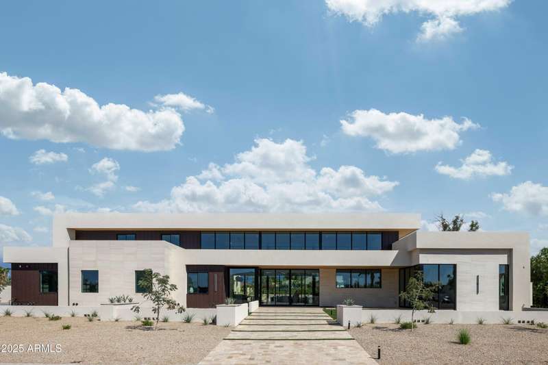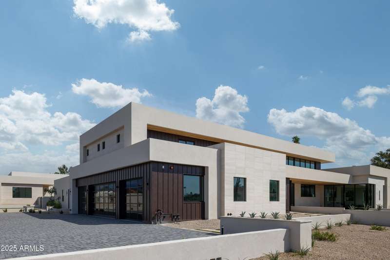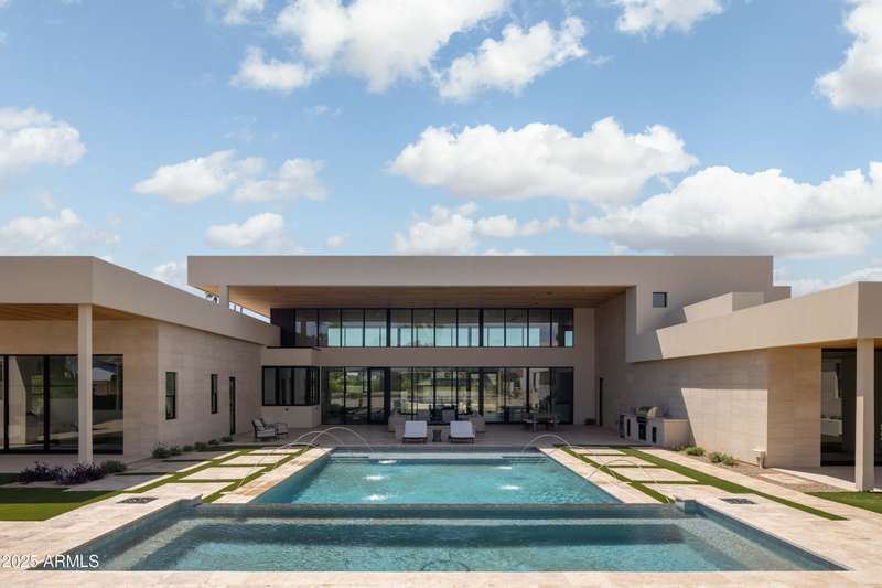 Brand-new 9,000 SF modern estate on 1.1 acres offering 8 bedrooms, 10 baths, and 7 garage spaces. Thoughtful split floor plan features an expansive great room, chef's kitchen + hidden prep kitchen, and walls of glass opening to the resort-style backyard. Primary suite occupies its own wing for privacy, while a nearby flex space with French doors and full bath—separated by a wine wall—is ideal for lounge, office, or gym. Detached guest house serves as a complete secondary residence with kitchen, living room, laundry, 3-car garage, and private gated entry. Outdoor amenities include pool, kitchen/bar, and sports court. This estate blends comfort and entertainment with a seamless indoor-outdoor design. Each bedroom offers its own en-suite bath, providing privacy for family and guests. The detached guest house makes multi-generational living or hosting long-term visitors effortless. Resort amenities include a sparkling pool, outdoor bar and kitchen, and full sports court. With modern architecture, high-end finishes, and move-in ready completion, this is one of Scottsdale's rare new-build luxury offerings.