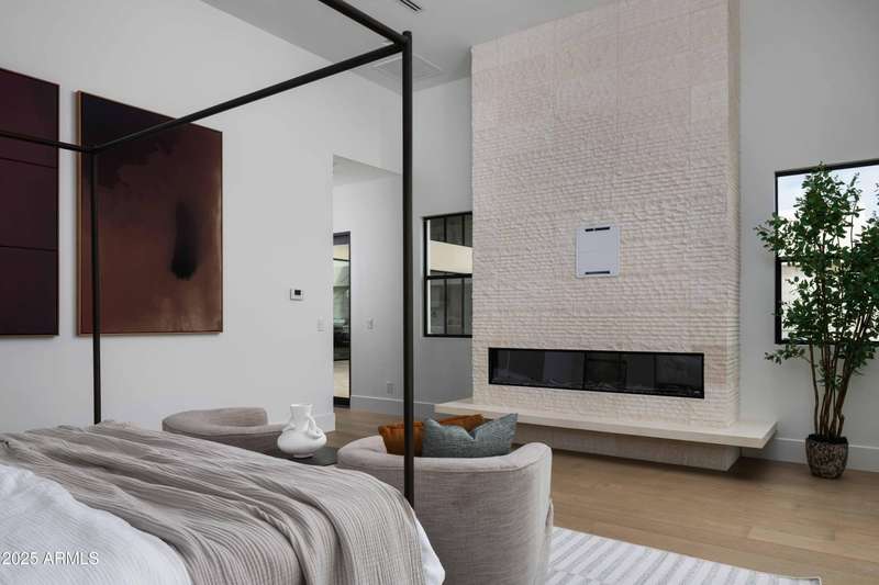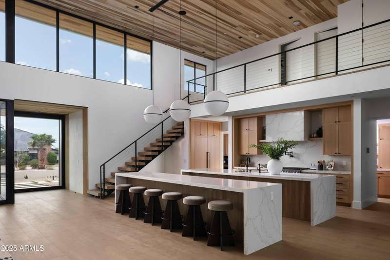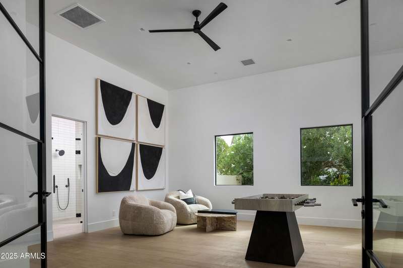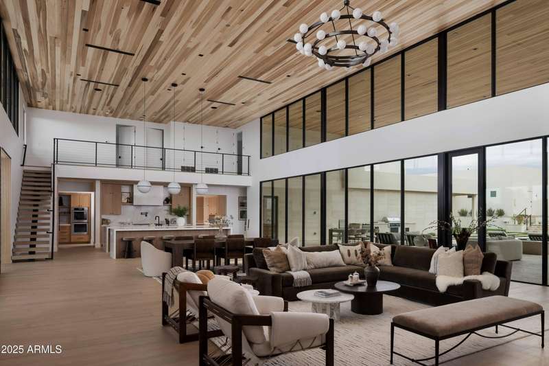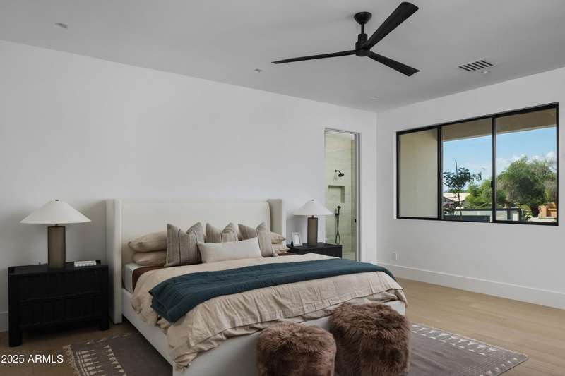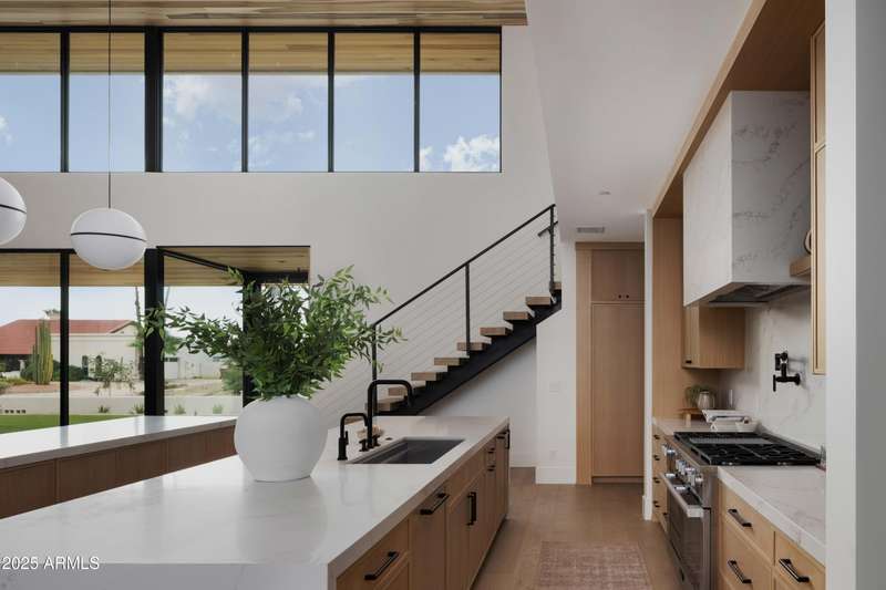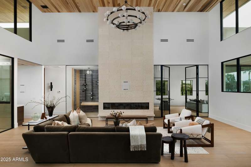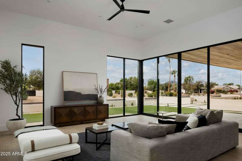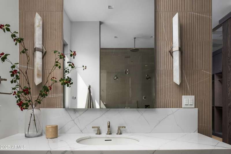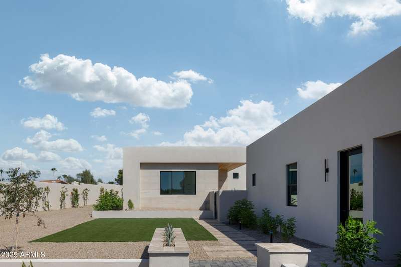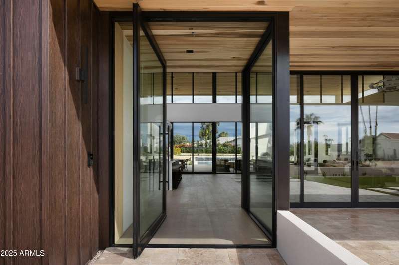Brand-new 9,000 SF modern estate on 1.1 acres offering 8 bedrooms, 10 baths, and 7 garage spaces. Thoughtful split floor plan features an expansive great room, chef's kitchen + hidden prep kitchen, and walls of glass opening to the resort-style backyard. Primary suite occupies its own wing for privacy, while a nearby flex space with French doors and full bath—separated by a wine wall—is ideal for lounge, office, or gym. Detached guest house serves as a complete secondary residence with kitchen, living room, laundry, 3-car garage, and private gated entry. Outdoor amenities include pool, kitchen/bar, and sports court. This estate blends comfort and entertainment with a seamless indoor-outdoor design. Each bedroom offers its own en-suite bath, providing privacy for family and guests. The detached guest house makes multi-generational living or hosting long-term visitors effortless. Resort amenities include a sparkling pool, outdoor bar and kitchen, and full sports court. With modern architecture, high-end finishes, and move-in ready completion, this is one of Scottsdale's rare new-build luxury offerings.