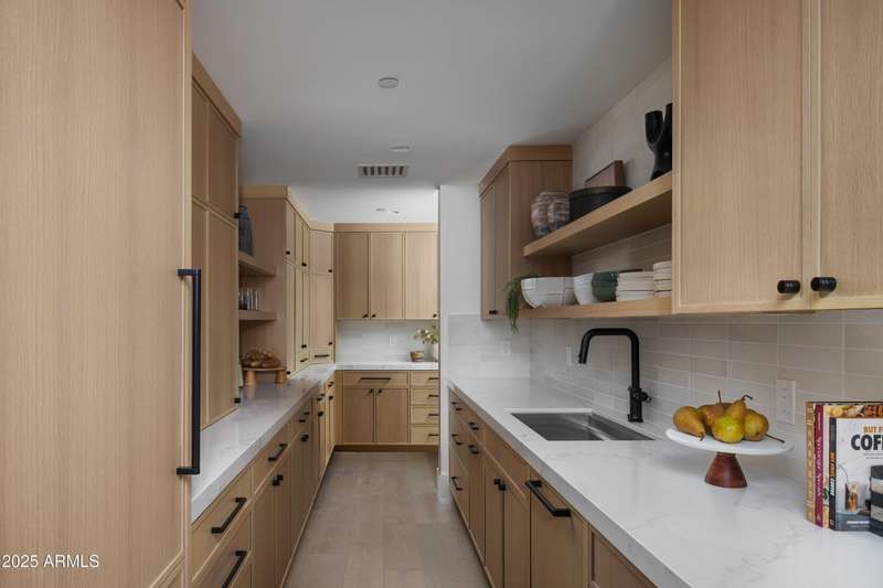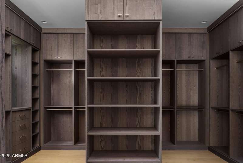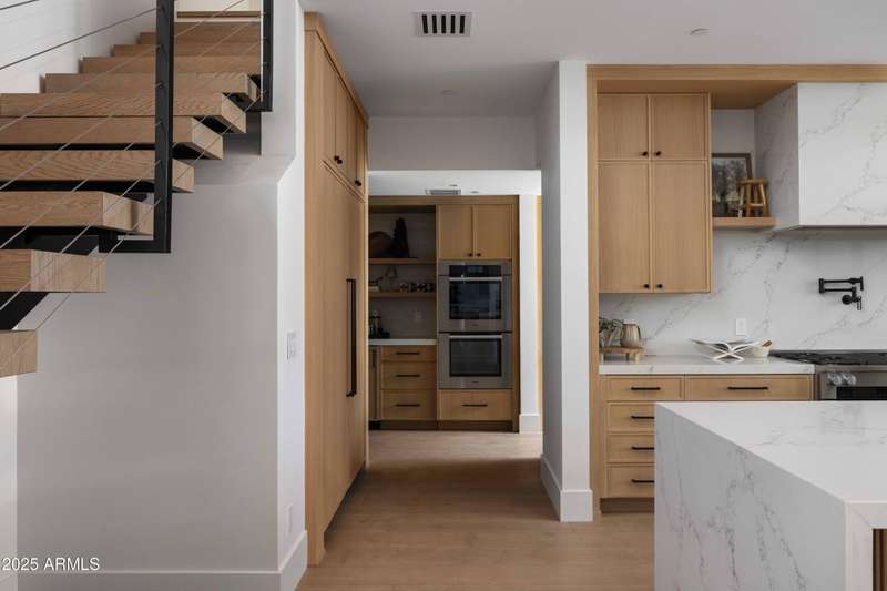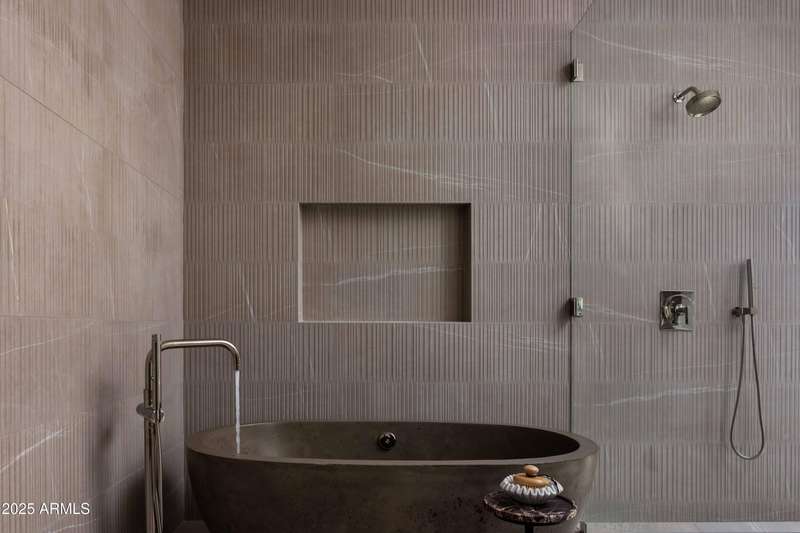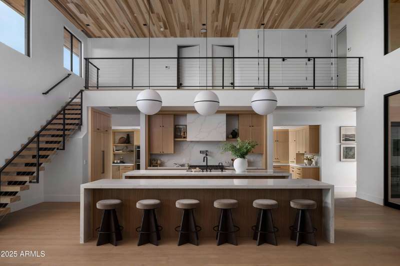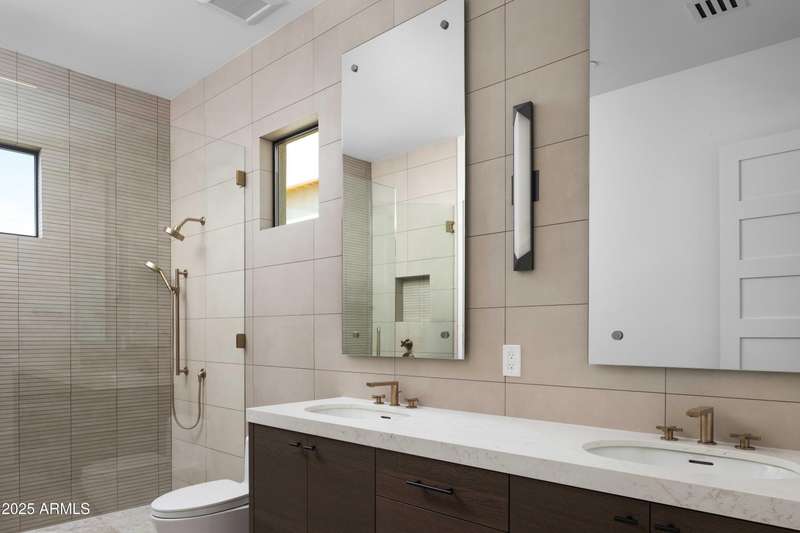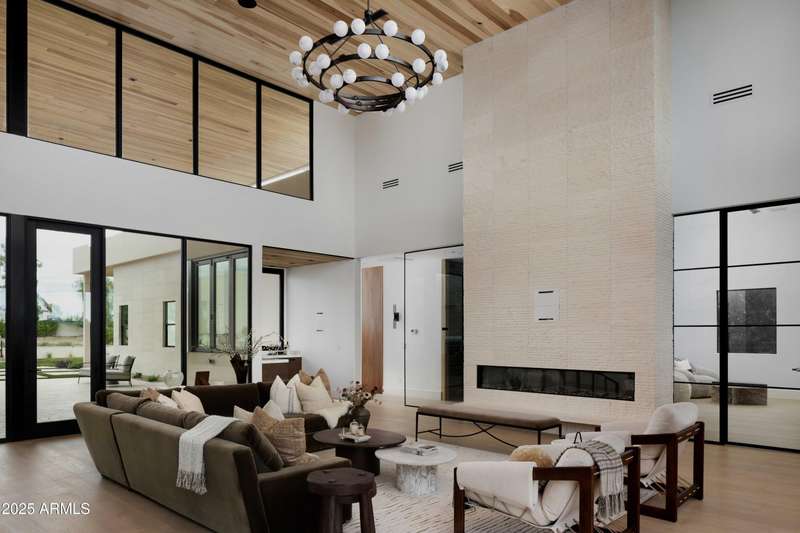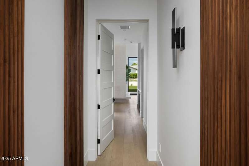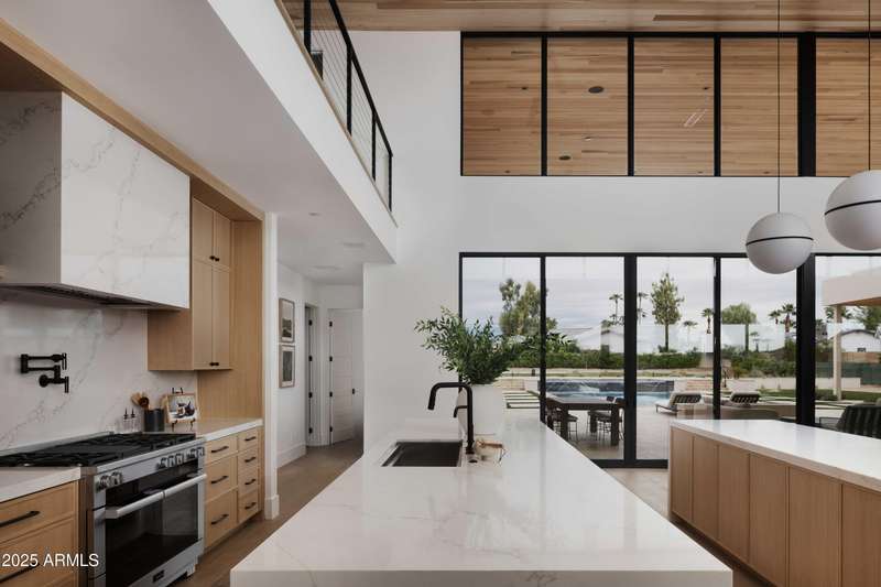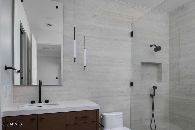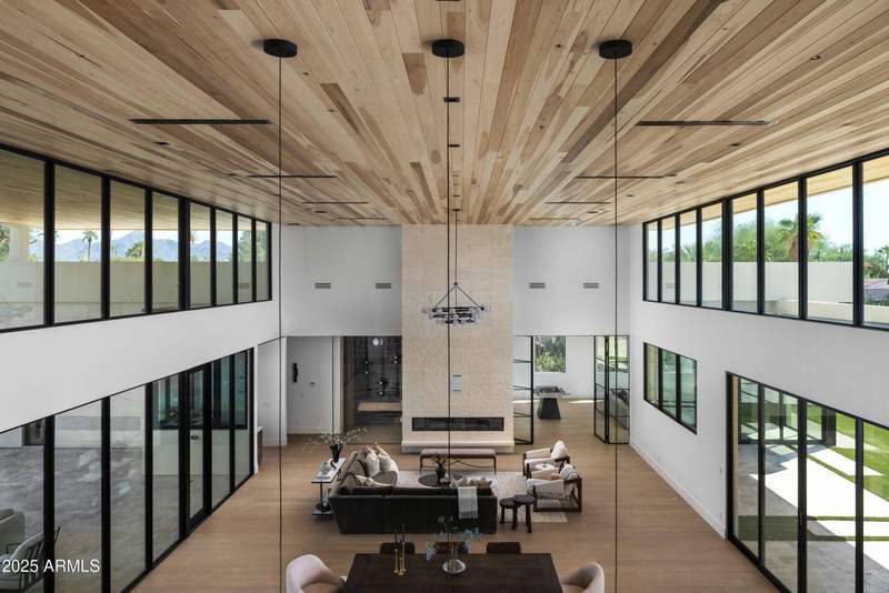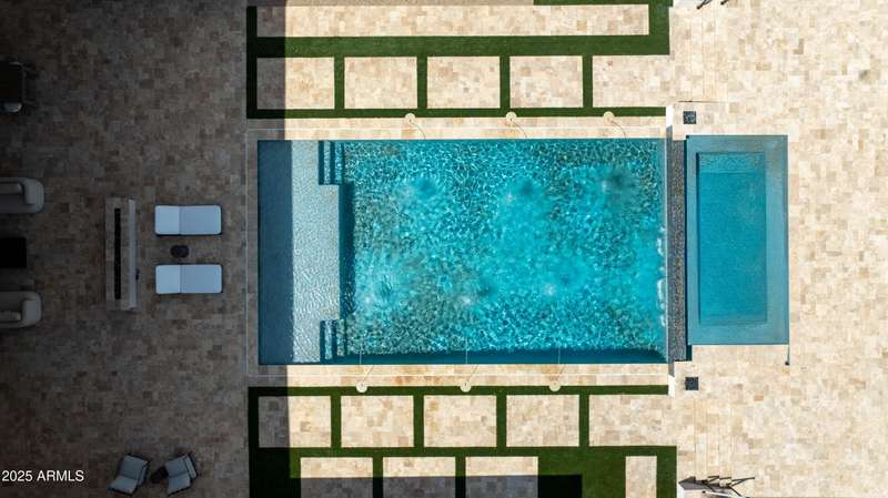 Brand-new 9,000 SF modern estate on 1.1 acres offering 8 bedrooms, 10 baths, and 7 garage spaces. Thoughtful split floor plan features an expansive great room, chef's kitchen + hidden prep kitchen, and walls of glass opening to the resort-style backyard. Primary suite occupies its own wing for privacy, while a nearby flex space with French doors and full bath—separated by a wine wall—is ideal for lounge, office, or gym. Detached guest house serves as a complete secondary residence with kitchen, living room, laundry, 3-car garage, and private gated entry. Outdoor amenities include pool, kitchen/bar, and sports court. This estate blends comfort and entertainment with a seamless indoor-outdoor design. Each bedroom offers its own en-suite bath, providing privacy for family and guests. The detached guest house makes multi-generational living or hosting long-term visitors effortless. Resort amenities include a sparkling pool, outdoor bar and kitchen, and full sports court. With modern architecture, high-end finishes, and move-in ready completion, this is one of Scottsdale's rare new-build luxury offerings.