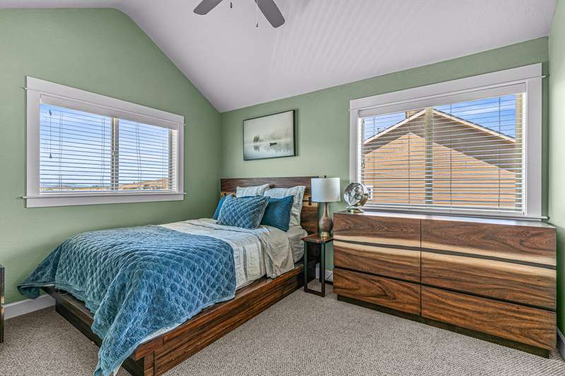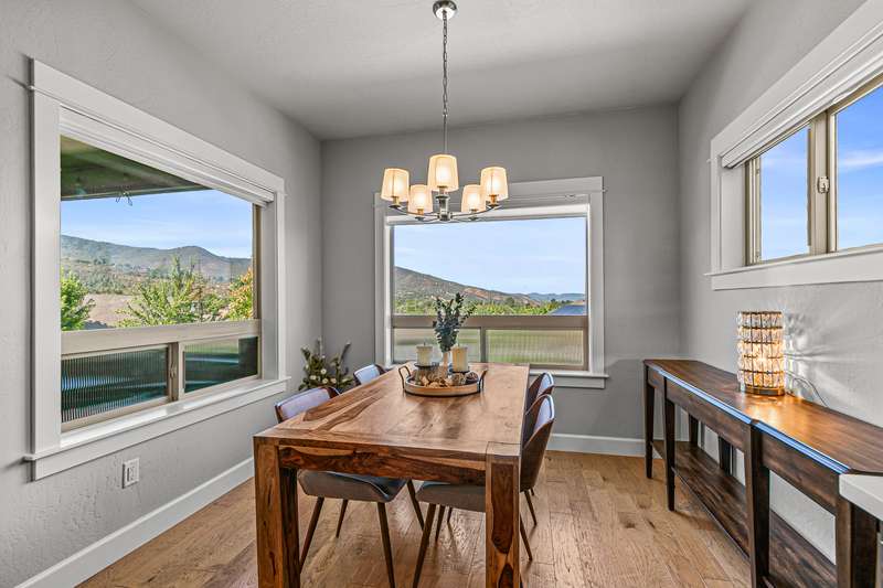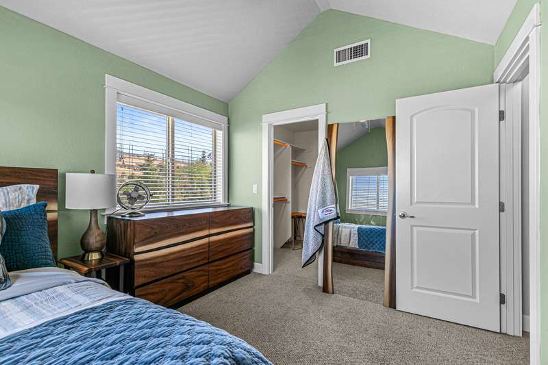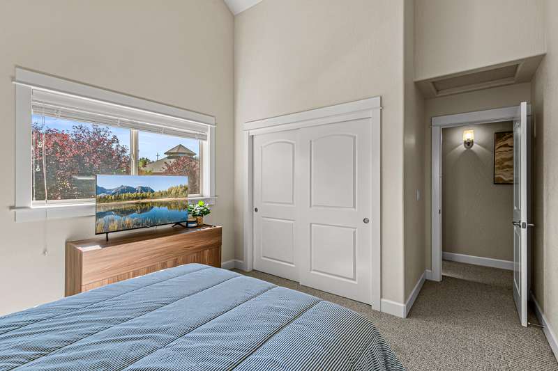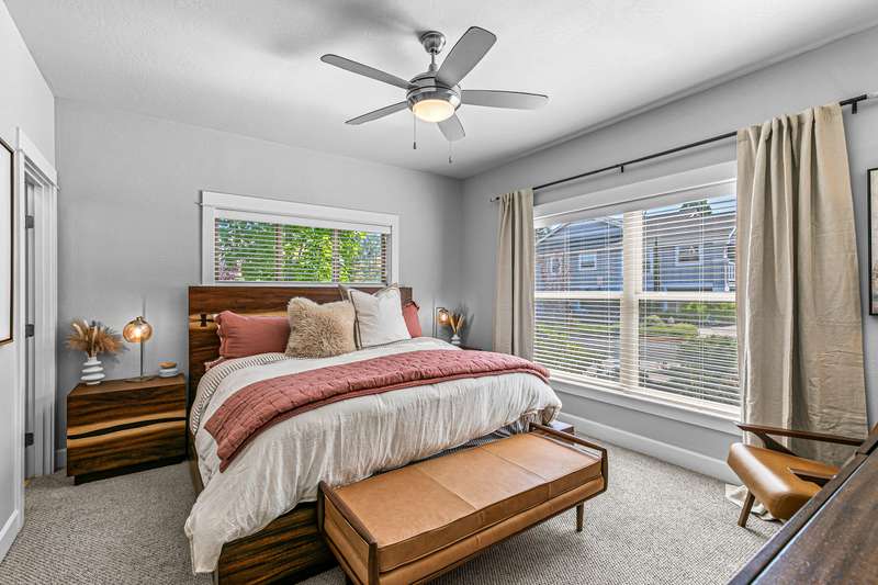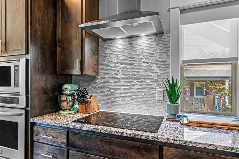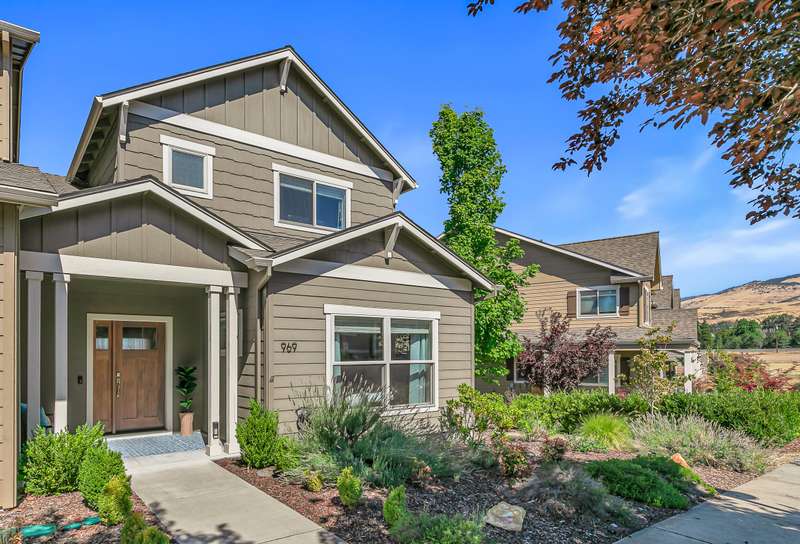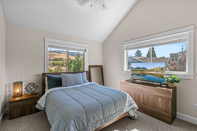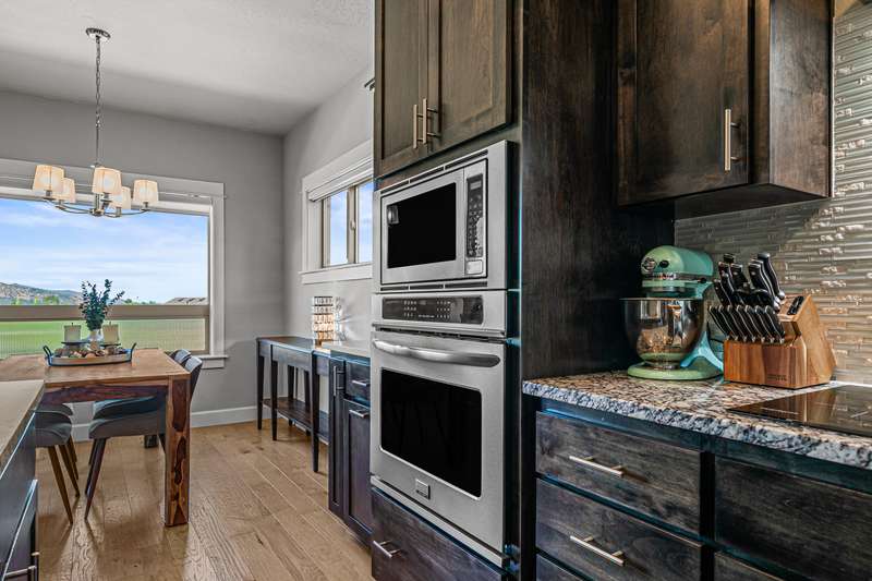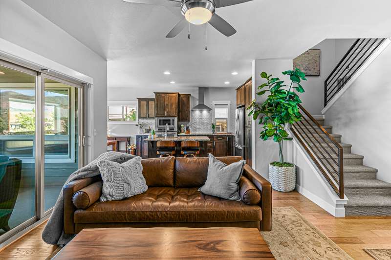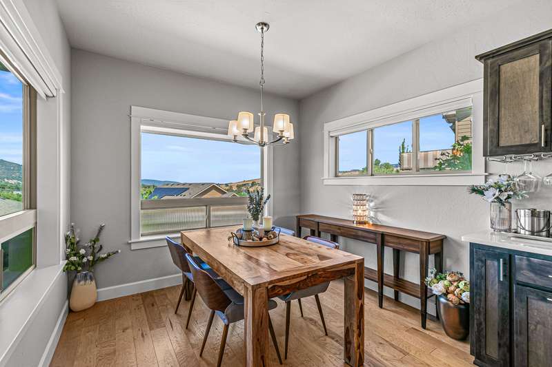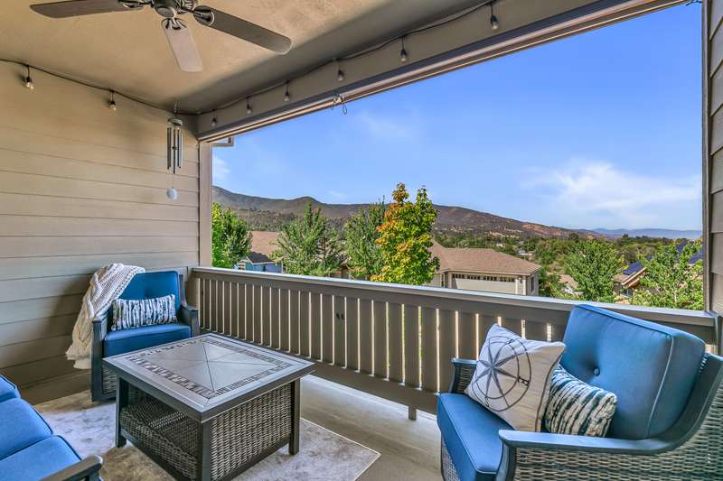 Turn-key end unit townhome with exceptional sunsets, valley, and mountain views within a four-minute walk to dog-friendly Kestrel Park! Kitchen with tiled backsplash, cabinets with custom pull-outs, granite dining island, stainless sink, and Frigidaire Gallery appliances including four-burner induction cooktop. Adjacent dining area surrounded by windows, living room with sliding glass door to covered view balcony with ceiling fan, powder room, coat and laundry closets. Main level primary suite with ceiling fan, walk-in closet, and full ensuite bathroom with granite vanity, double vessel sinks, and tiled shower. Two vaulted upper-level bedrooms - one with walk-in closet - and full bath with granite vanity, vessel sink, and tub shower with tiled surround. Lower level with oversized two-car garage and two large storage closets. Elevator-ready floor plan. Front yard and adjacent common area with mature trees and plantings maintained by minimal association dues. Inquire for details!