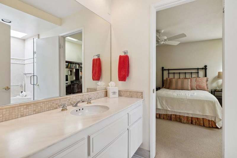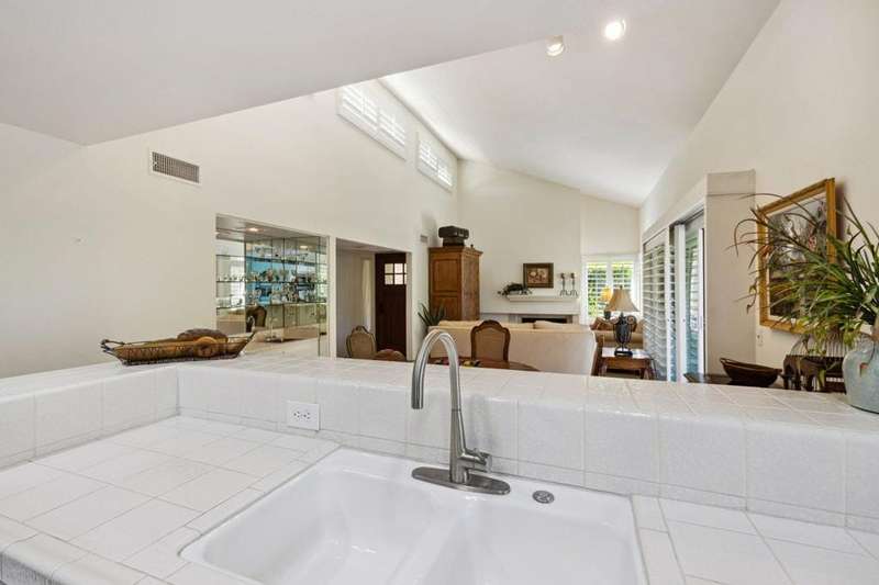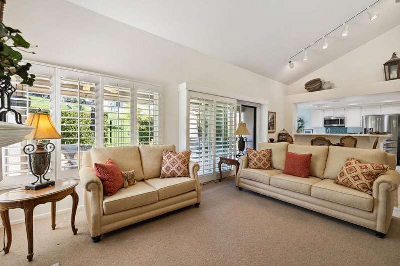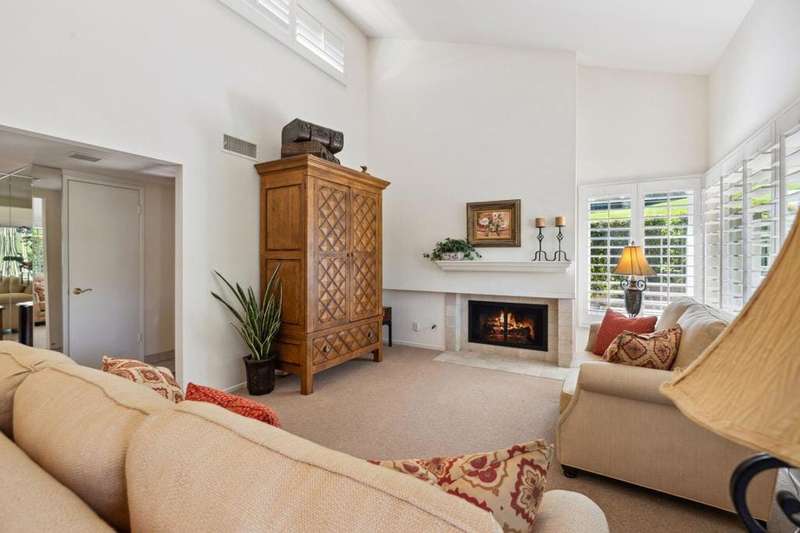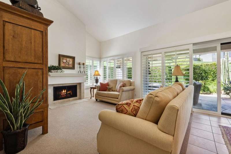 A RARE FIND, A FENCED YARD/PATIO. DOG-FRIENDLY. Currently the 2nd LOWEST PRICED ONE STORY WITH A 2 CAR GARAGE, Highly sought after Ironwood neighborhood. The larger condo across the street is sold, offered around $1.66M. This delightful, private 2 bdr. 2 bath is adjacent to open space on the left side. The guest bedroom was expanded to enclose an atrium and accommodates an office/desk area. All the comforts of home, here. Pantry, TV in the kitchen, newer refrigerator with water dispenser, a wine cooler, and there is a wet bar, NEWER shutters and NEWER sliding doors and windows. NEWER A/C. Offered fully furnished, turnkey. Everything stays. Classic floor plan with eating area off the kitchen plus a dining area. This well maintained home gives the opportunity to upgrade, if desired. The PRIVATE patio is exceptional with a fire pit and built-in BBQ.. Seller is an executer/trustee. Easy to show, vacant.