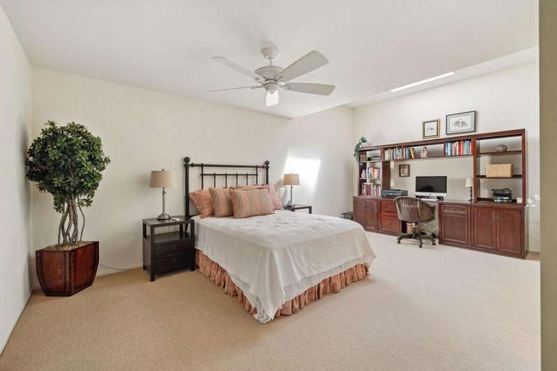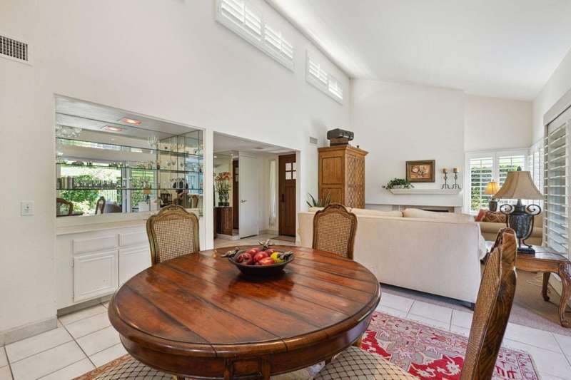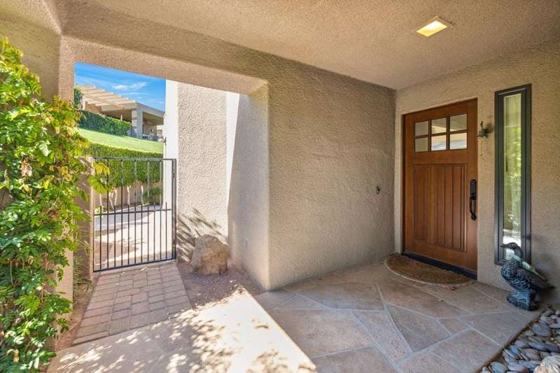 A RARE FIND, A FENCED YARD/PATIO. DOG-FRIENDLY. Currently the LOWEST PRICED ONE STORY WITH A 2 CAR GARAGE, Highly sought after Ironwood neighborhood. The larger condo across the street is sold, offered around $1.66M. This delightful, private 2 bdr. 2 bath is adjacent to open space on the left side. The guest bedroom was expanded to enclose an atrium and accommodates an office/desk area. All the comforts of home, here. Pantry, TV in the kitchen, newer refrigerator with water dispenser, a wine cooler, and there is a wet bar, NEWER shutters and NEWER sliding doors and windows. NEWER A/C. Offered fully furnished, turnkey. Everything stays. Classic floor plan with eating area off the kitchen plus a dining area. This well maintained home gives the opportunity to upgrade, if desired. The PRIVATE patio is exceptional with a fire pit and built-in BBQ.. Seller is an executer/trustee. Easy to show, vacant.