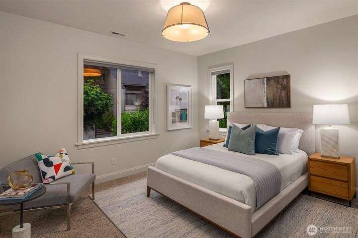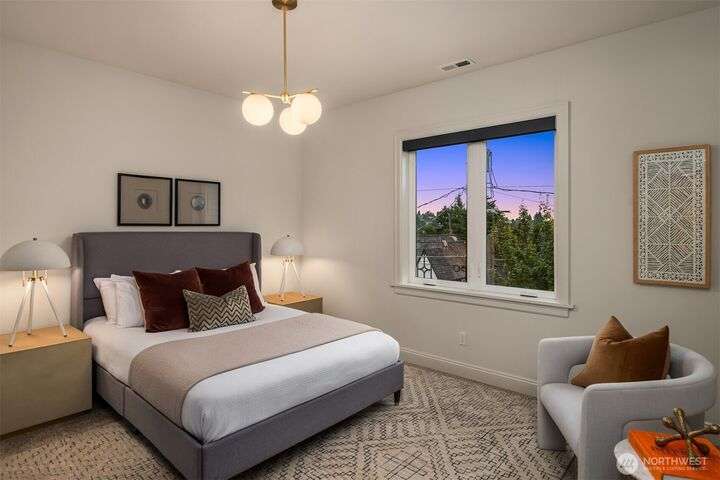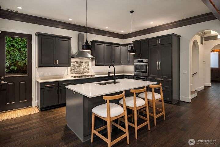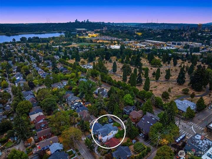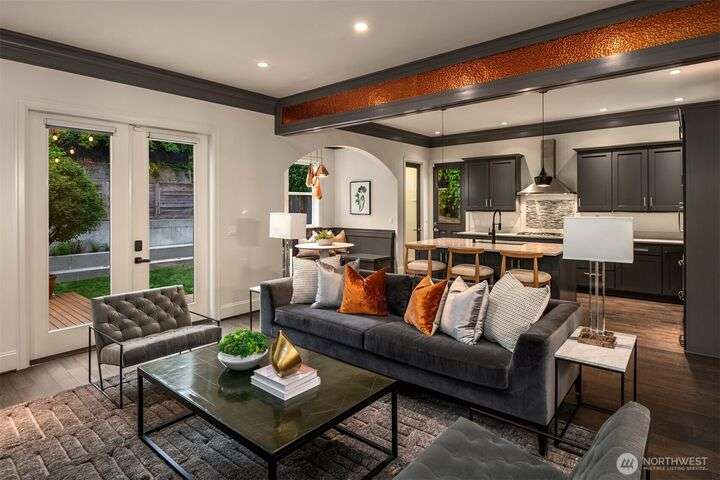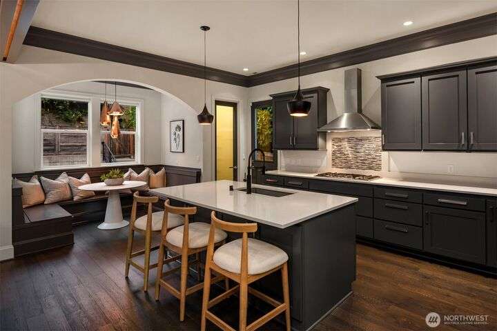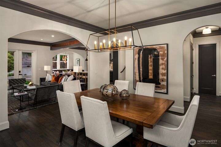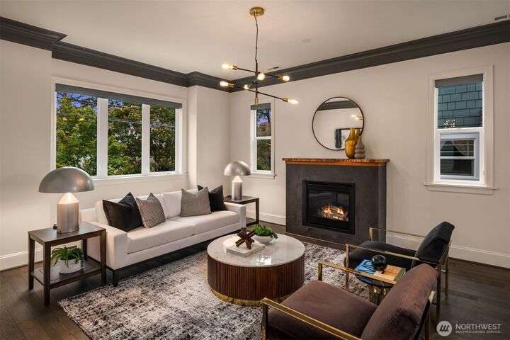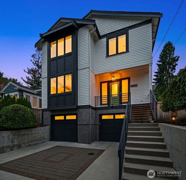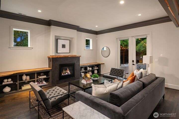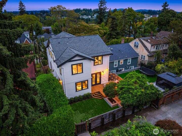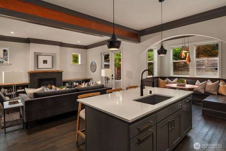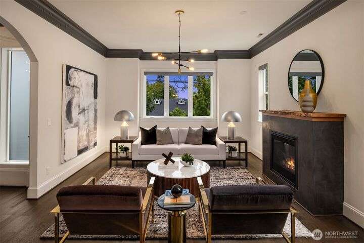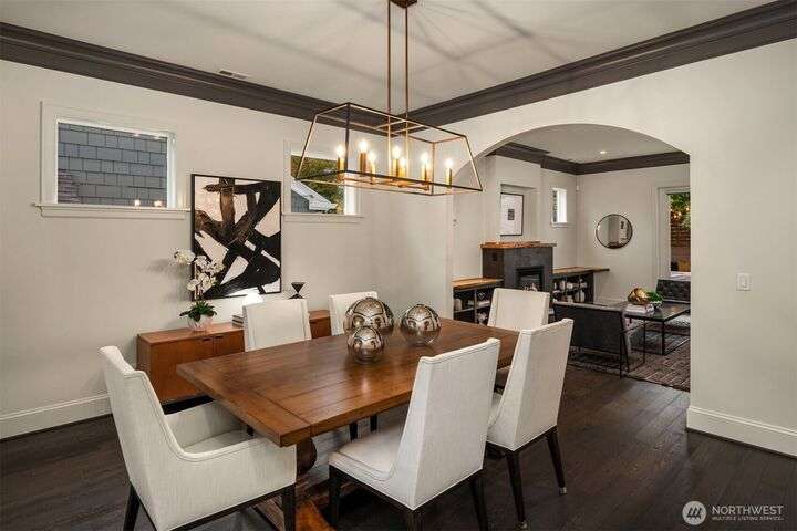 Beautifully crafted modern home in desirable Bryant. Spacious elegance found throughout thoughtfully designed interior. Soaring 10-ft ceilings, fireplaces + abundant natural light highlight open main living level. Impeccable design features natural elements + classic touches, such as arched doorways + custom wood millwork. Kitchen is chef’s dream with premier stainless appliances, 5-burner range, quartz surfaces, built-in breakfast nook. Primary suite offers serene retreat, luxe bath + walk-in closet with built-ins. Finished lower level with media room, kitchenette + guest bedroom. Relax in fenced yard with deck. Attached 2-car garage includes EV charger, plus 2 additional driveway parking spaces. Close to U Village, UW + light rail.