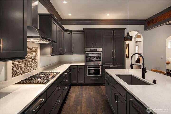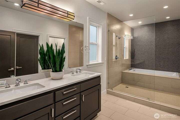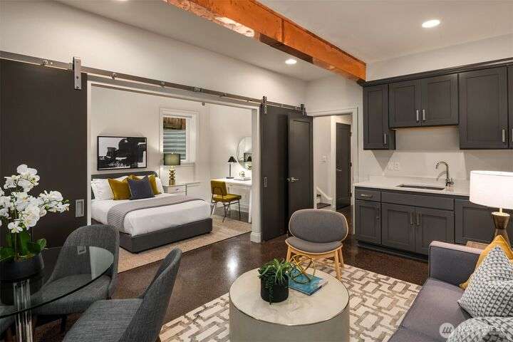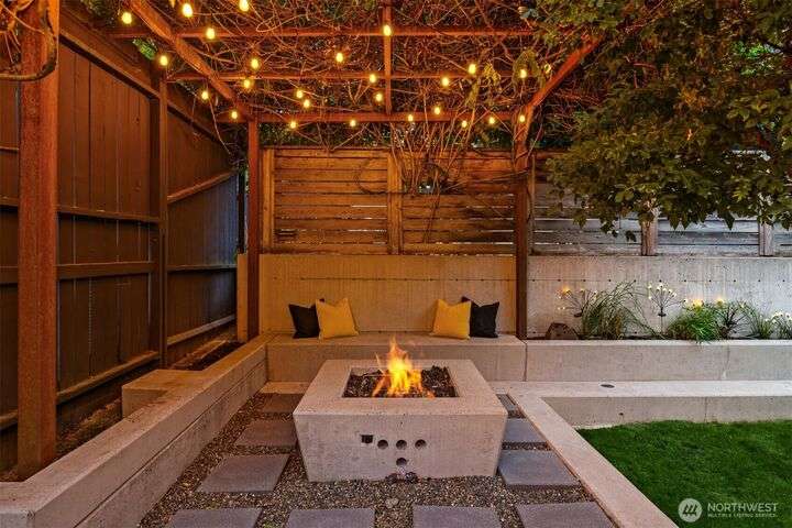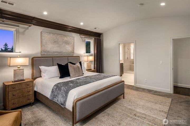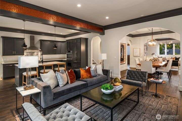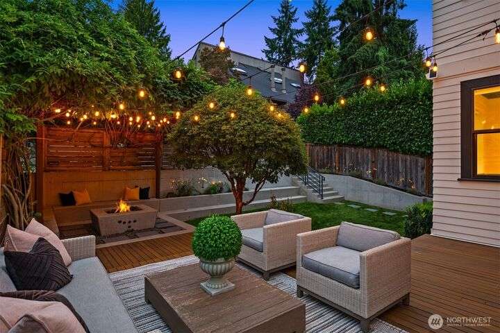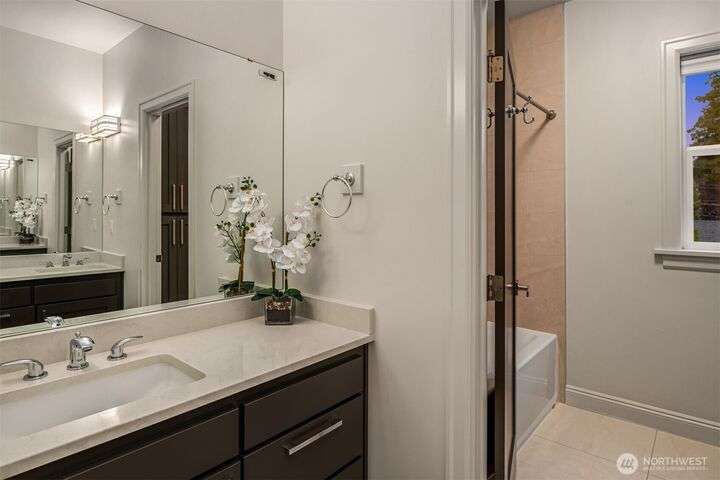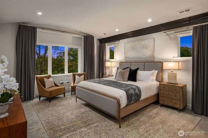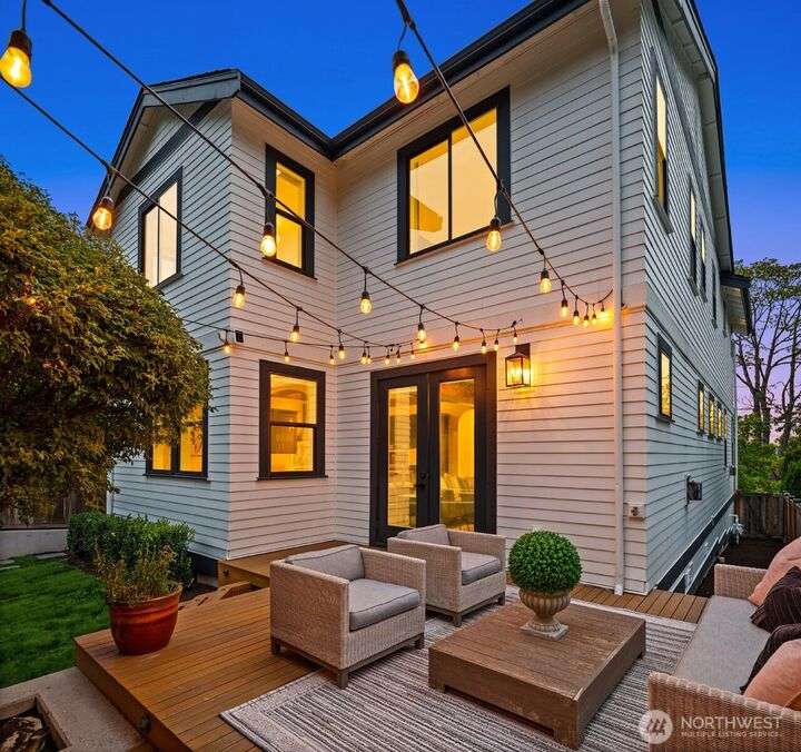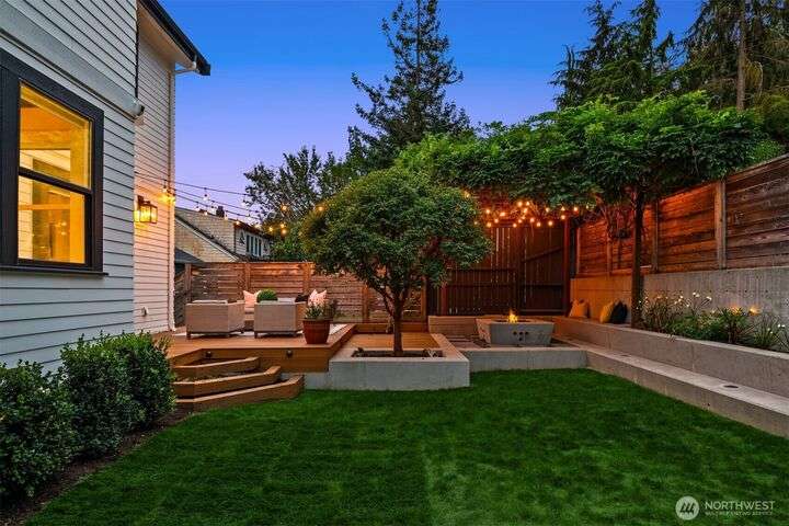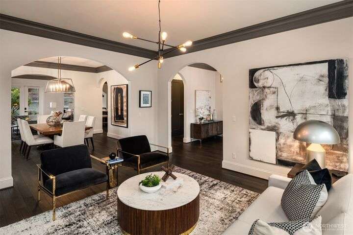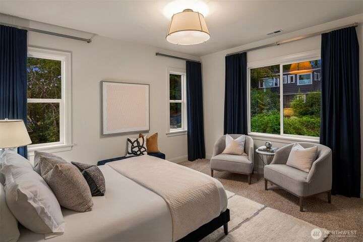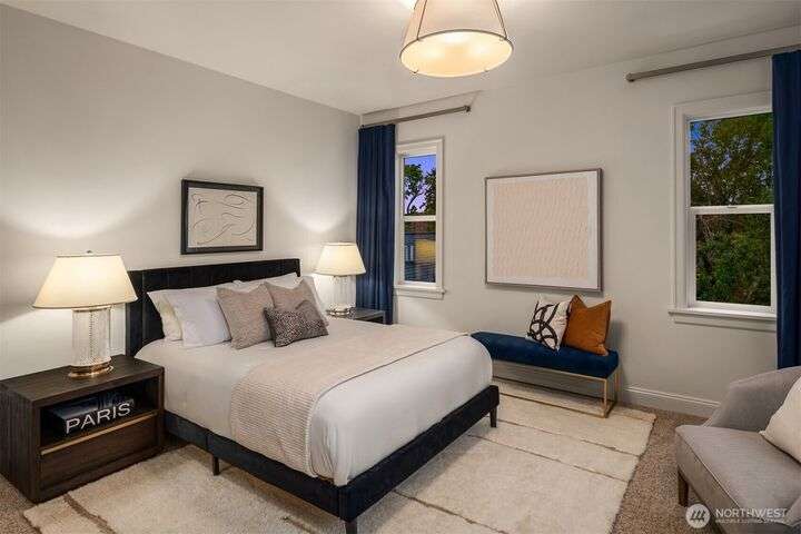 Beautifully crafted modern home in desirable Bryant. Spacious elegance found throughout thoughtfully designed interior. Soaring 10-ft ceilings, fireplaces + abundant natural light highlight open main living level. Impeccable design features natural elements + classic touches, such as arched doorways + custom wood millwork. Kitchen is chef’s dream with premier stainless appliances, 5-burner range, quartz surfaces, built-in breakfast nook. Primary suite offers serene retreat, luxe bath + walk-in closet with built-ins. Finished lower level with media room, kitchenette + guest bedroom. Relax in fenced yard with deck. Attached 2-car garage includes EV charger, plus 2 additional driveway parking spaces. Close to U Village, UW + light rail.