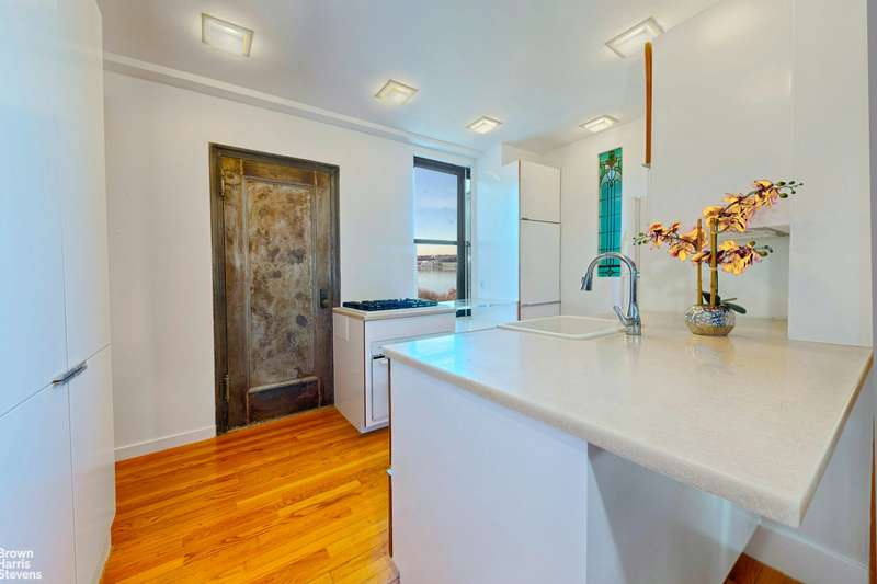 This uniquely designed home at 310 West 106th Street blends prewar elegance with a modern, open layout. Originally a two-bedroom, one bath residence, it has been converted into an expansive one-bedroom with an added half-bath a loft-like open-concept living and dining space when you enter this sun-drenched home featuring 9 plus foot ceilings. The kitchen, designed for both function and flair, features Viking stovetop and a combo electric Bosch oven and gas range, the following appliances will be upgraded: ; refrigerator, microwave and dishwasher, enjoy a breakfast bar, serene river views, stained glass built into the wall between the kitchen and bathroom to pull light through, and convenient access to a service entrance.