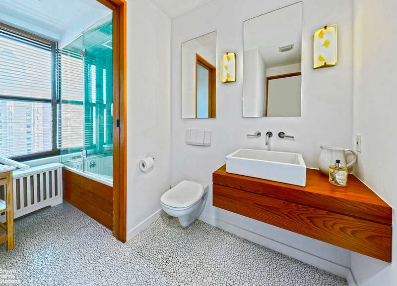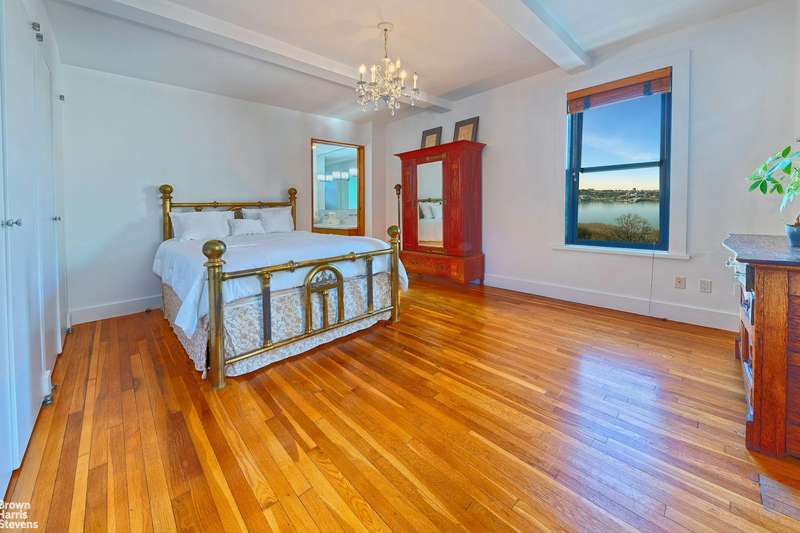 The spacious primary bedroom enjoys pocket door, double exposures to the north and west filling the space with natural light and offering unobstructed river views. Its windowed en-suite bathroom features double sinks, a wall of mirrored medicine cabinets, a Toto toilet, and seamless access to an adjoining half bath designed for shared entry to the steam shower room. Every element of the layout prioritizes convenience and style, including a dedicated work-from-home space with beautifully crafted built ins ; and a wide, double-door coat closet in the foyer, stained-glass in doors that separate the entry foyer from the living room, and equipped with window A/C units.
