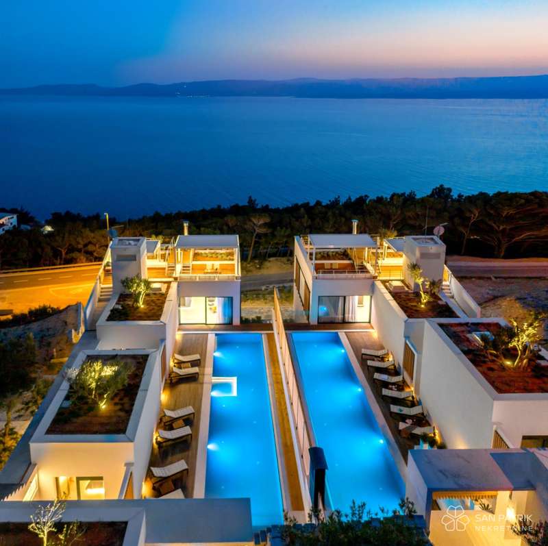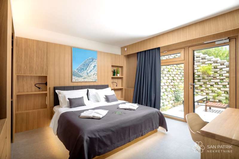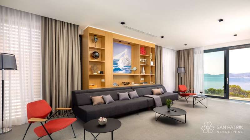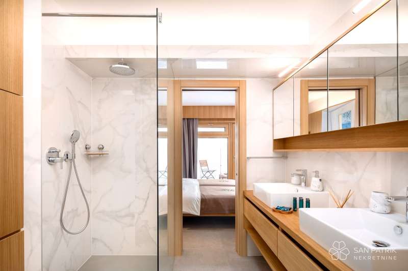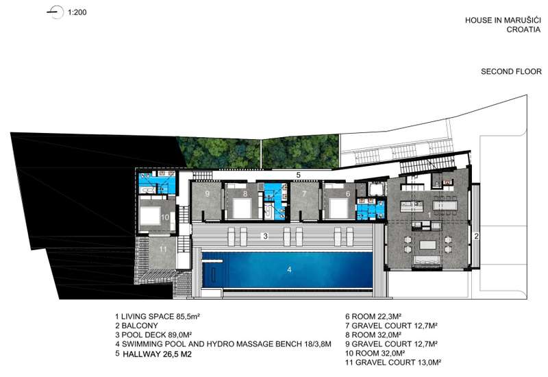 The second floor reveals the heart of the villa - a spacious living room with a fully equipped kitchen that opens up to a terrace with a 66 m2 pool. The pool, with a hydro-massage bench for three people and a spacious sunbathing area, offers the perfect spot to enjoy the warm Dalmatian days. Each of the three bedrooms on this floor has its own en-suite bathroom, offering privacy and comfort.