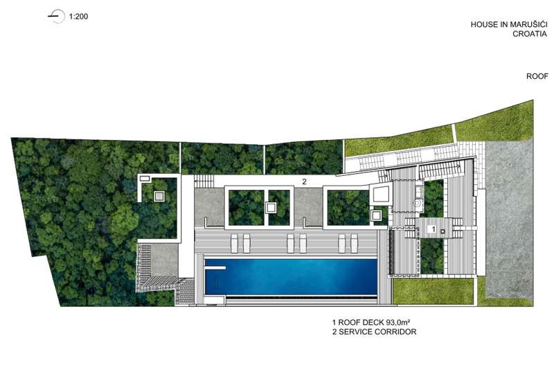 The green roofs of the villa not only provide aesthetic value but also contribute to sustainability, serving as additional insulation. All of this is part of a smart home where an elevator, underfloor heating, and access via coded cards reflect modern technology and security.