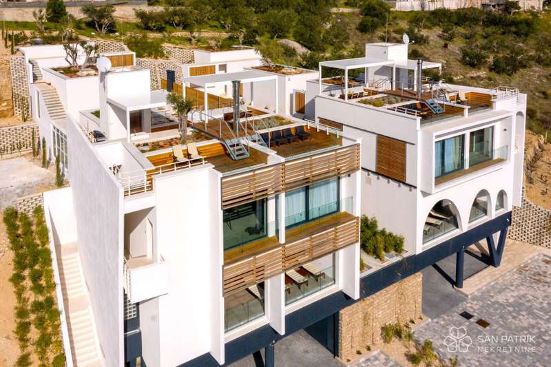 Two lavish twin villas with panoramic views are situated on a total plot area of 2,253 m2, just 200 meters from the sea. It is possible to purchase both villas together or each separately.