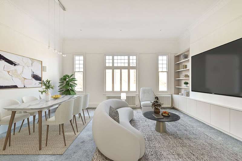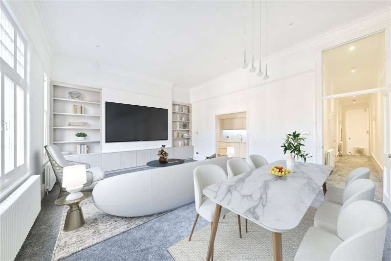 Impressive first-floor, two-bedroom apartment with high ceilings Recently refurbished and featuring 3.6m ceilings, the flat comprises 2 generously sized bedrooms (one ensuite), Miele appliances and very good entertainment space. Great location, close to South Kensington, Harrods, Imperial Collegue and world class museums.