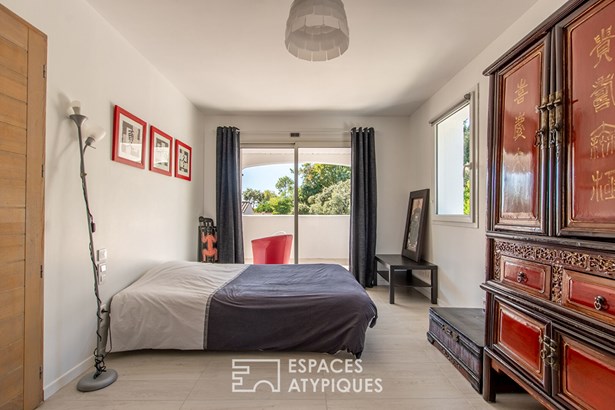 The entrance leads to a vast living room with a wood-burning stove and an open kitchen, designed for convivial moments. A master suite, an office, and storage space complete the ground floor. Upstairs, three bedrooms open onto beautiful private terraces, as well as a bathroom and separate toilets, offering a fluid and functional layout. A two-room outbuilding enhances the property's potential: a living room with an open kitchen, a mezzanine bedroom with a shower room and toilet. An ideal space for welcoming family and friends, or for seasonal rental use. Outside, two terraces, one of which is covered, invite you to enjoy the beautiful days, facing the swimming pool perfectly integrated into the garden.