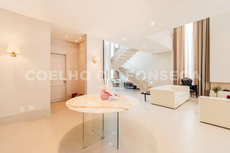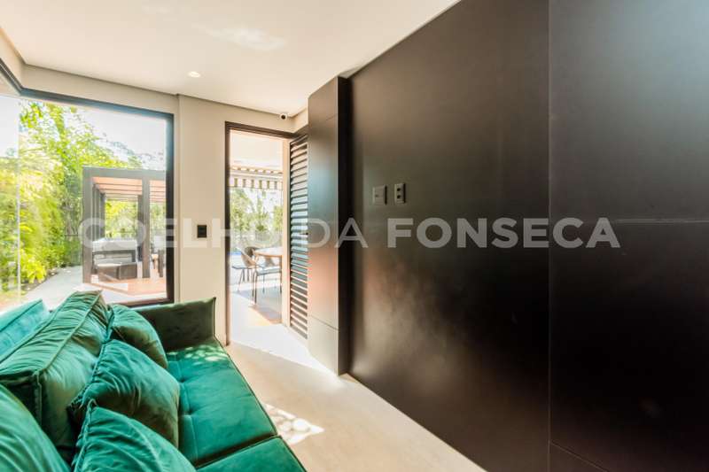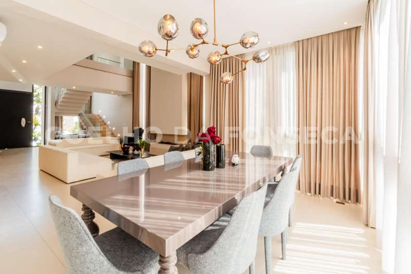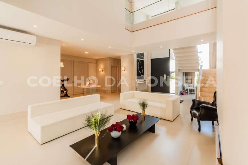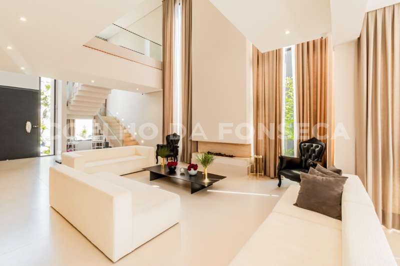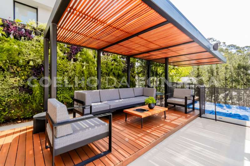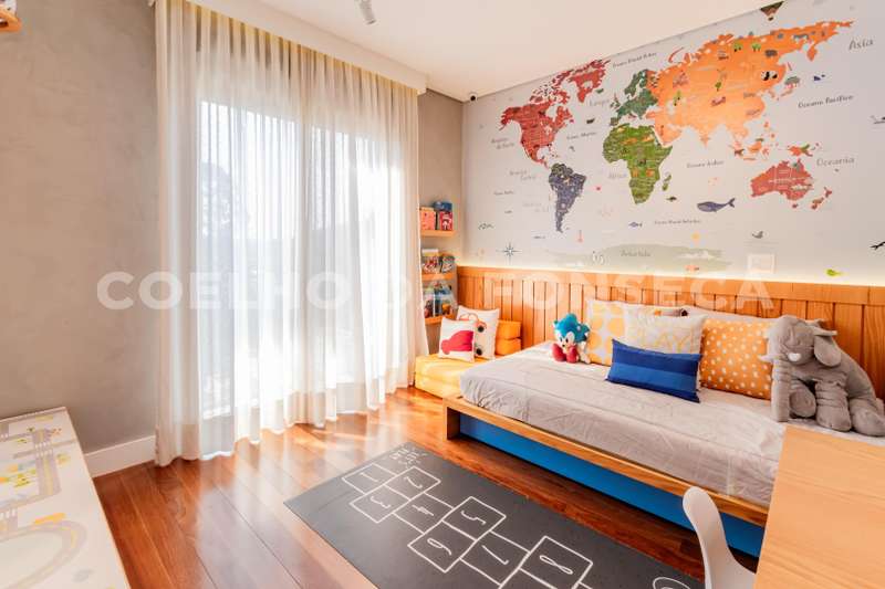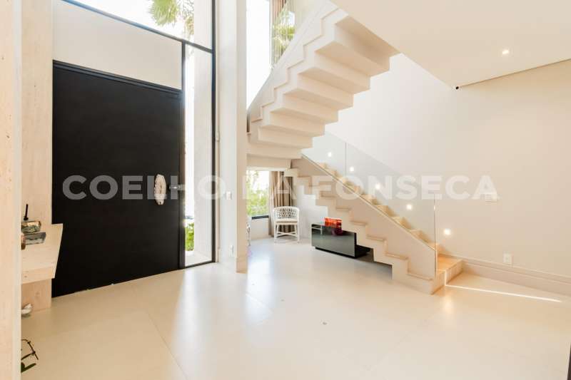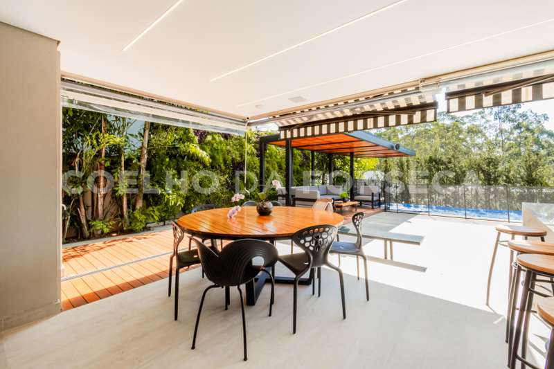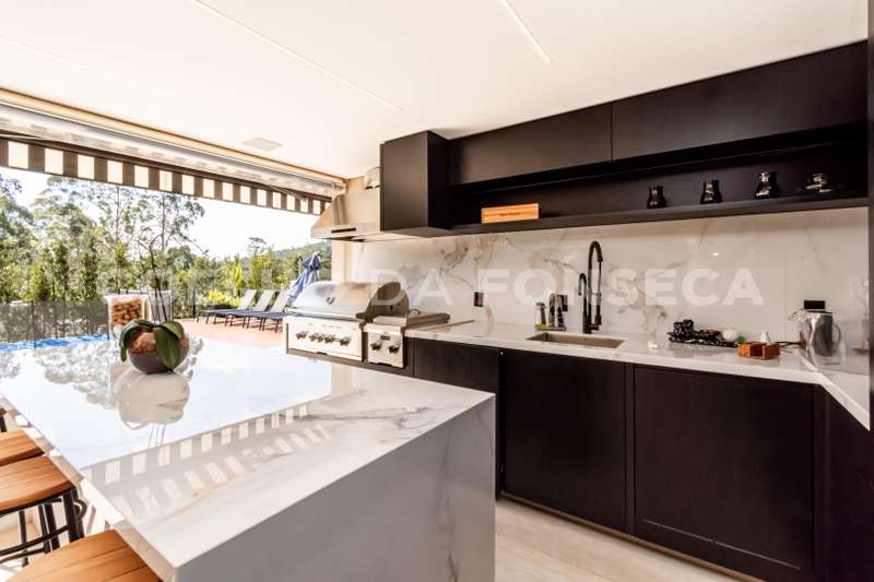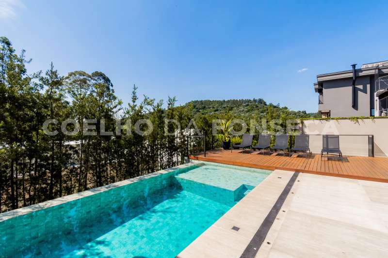 Casa imponente, com fachada ampla. Living social com pé-direito duplo, escritório e home theater. Espaço gourmet com vista para mata preservada. Área de lazer completa com piscina e hidro, além de pergolado para contemplar o pôr do sol. Garagem privativa para 4 ou 5 carros. Espaço gourmet com balcão frigorífico bem decorado. Piscina e sauna com jardim.\r