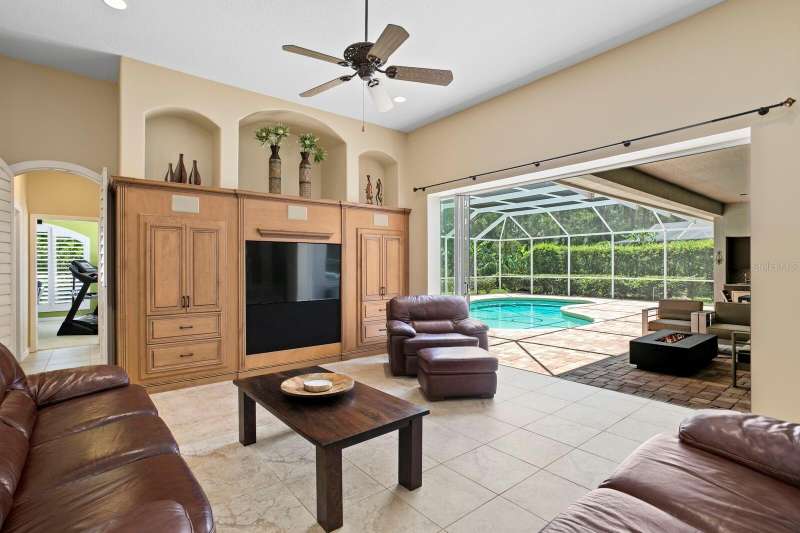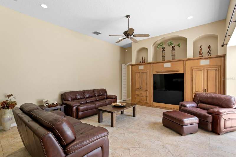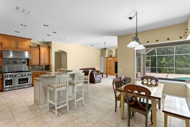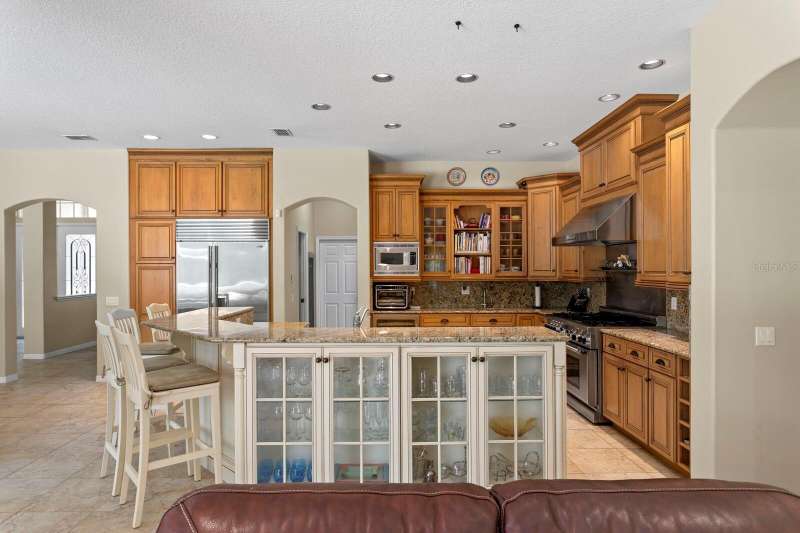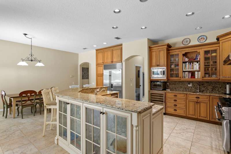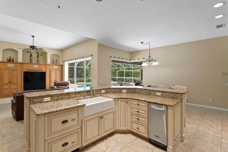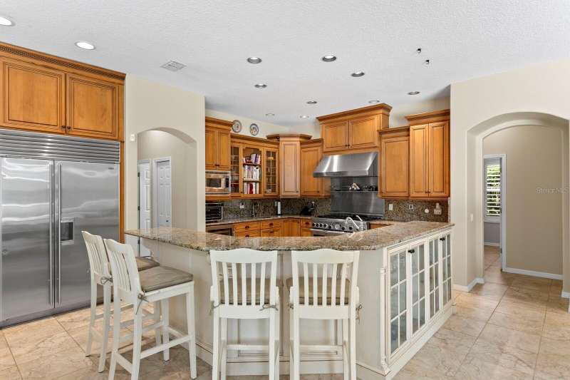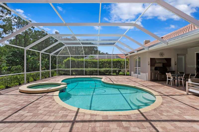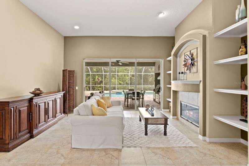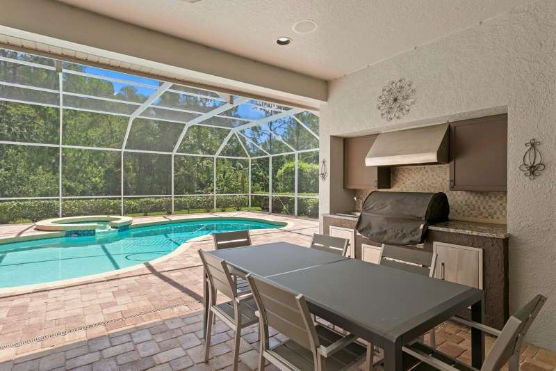 Welcome to refined living in Arbor Greene’s exclusive guard-gated community. Perfectly situated on a premium conservation lot, this beautifully maintained Hannah-Bartoletta home offers 5 bedrooms, 3.5 bathrooms, a private office, and a versatile bonus room that can easily serve as a fifth bedroom. As you enter, you're immediately welcomed by a formal living room that exudes warmth and tranquility, highlighted by a gas fireplace, custom built-in shelving, and serene views of the pool and lush conservation area. Just off the living room, the spacious formal dining room offers the perfect setting for entertaining and holiday gatherings. Flowing from the formal areas, you are greeted by the kitchen which is a chef’s dream. This high-end space features Omega staggered cabinetry with intricate crown molding, thick granite countertops and backsplash, a Thermador gas range with dual ovens, 6 burners and griddle, Fisher & Paykel dual “drawer” dishwasher with wood paneling, a 48" built-in Sub-Zero refrigerator, wine cooler, trash compactor, dual sinks, and a built-in microwave. The family room is anchored by a custom built-in entertainment center and is designed with entertaining in mind, featuring pocket sliding glass doors that open fully to the patio and pool area, creating an effortless indoor-outdoor living experience. The private office showcases rich hardwood flooring, and tile flows throughout the main living areas, enhancing the home’s clean and cohesive design. The home’s thoughtful split-bedroom floor plan ensures maximum privacy for the secondary bedrooms, while the primary suite enjoys its own quiet retreat. The bonus room, ideal as a fifth bedroom, playroom, or media space, adds value and flexibility to the layout. Step outside to your private backyard oasis featuring an extended pavered lanai, a heated pool with peaceful conservation views, and a built-in outdoor kitchen, perfect for cookouts, entertaining, and making the most of Florida’s year-round sunshine. Recent updates include a brand new HVAC system (2025), freshly landscaped grounds (2025), and a water heater replaced in 2023. Additional features include a whole-home water softener system for added comfort and care. As a resident of Arbor Greene, you’ll enjoy resort-style amenities including two community pools, a fitness center, Har-Tru tennis courts, playgrounds, and miles of scenic walking trails. Located near top-rated schools, I-75, Wiregrass Mall, and excellent medical and dining options, this home offers the very best in luxury, location, and lifestyle.