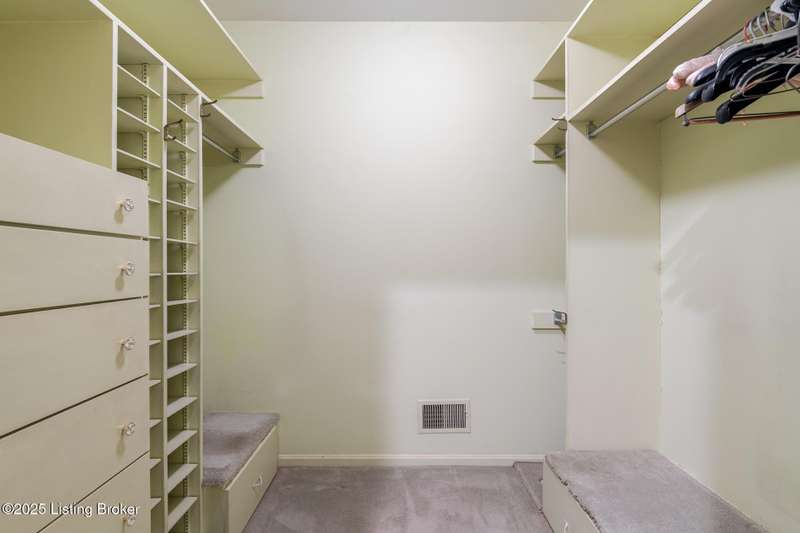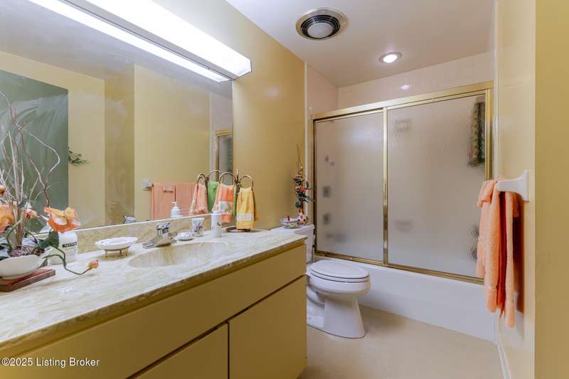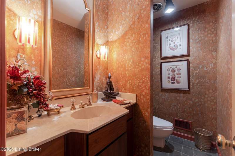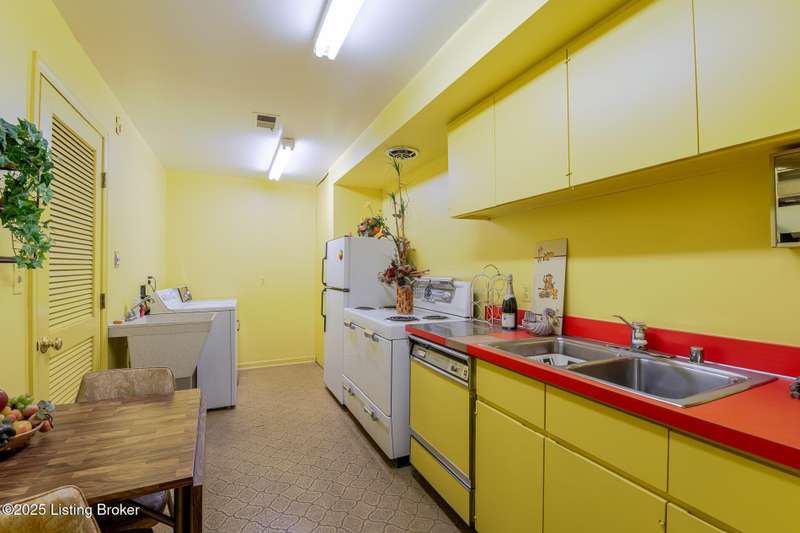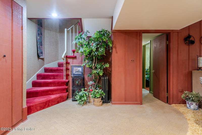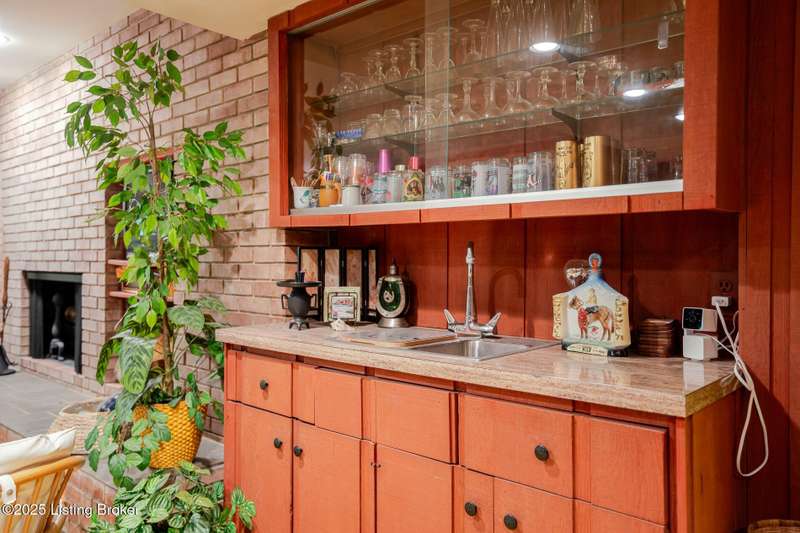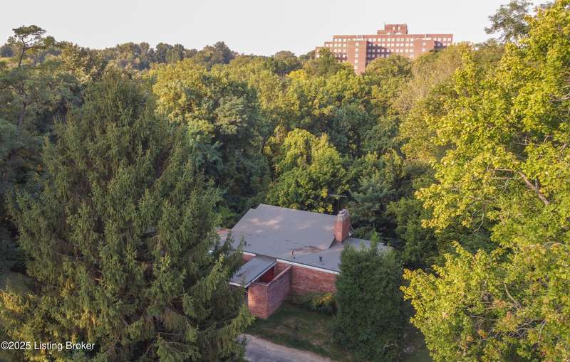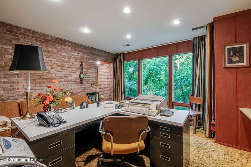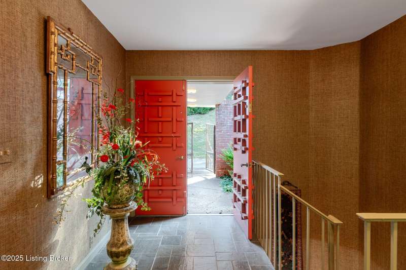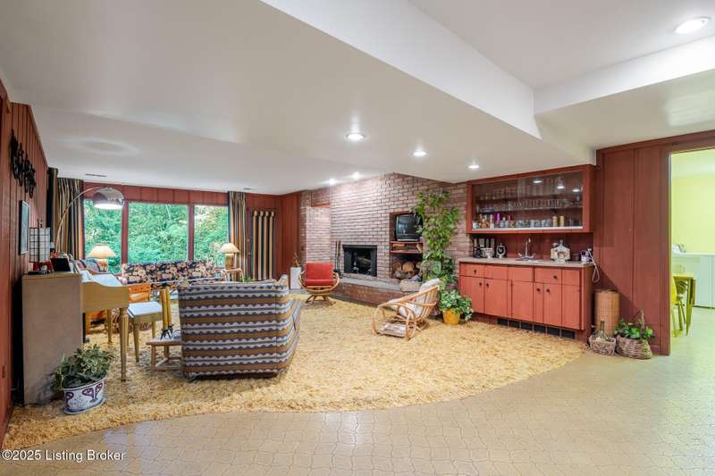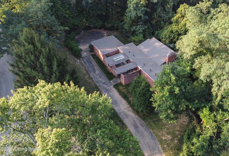 Discover this truly unique one-owner, custom-built, mid-century modern ranch in the desirable Greenleaves neighborhood, offering the perfect blend of privacy and convenience. Built in 1970 and meticulously maintained, including a new roof in 2025, this home is situated on 1.3 wooded acres in the city, just minutes from I-71 and Brownsboro Road. As you approach, a large gated courtyard welcomes you to the double-door entry. Inside, the spacious foyer opens to a vaulted living room featuring a dramatic floor-to-ceiling fireplace and expansive windows overlooking the wooded lot, bringing the outdoors in. The eat-in kitchen offers generous space, a large pantry, built-in desk, and ample cabinetry. The primary suite is a true retreat with floor-to-ceiling windows, a cozy fireplace, oversized layout, and spa-style bath complete with double vanity, sunken tub, and a huge custom walk-in closet with built-in drawers and cabinetry. A stylish powder room completes the first floor. The lower level provides outstanding space for living and entertaining. The family room features a fireplace, wet bar, backyard walkout, and custom built-ins. Additional rooms include an office/bedroom with large walk-in closet, two more bedrooms with ample storage, and a full bath with tub/shower combo. The laundry room doubles as a kitchenette with refrigerator, stove, dishwasher, utility sink, and plenty of cabinet space. Other highlights include an attached two-car garage, full home vacuum system and extensive storage throughout. With its retro charm, custom features, and spacious layout, this home is ready for a new owner to make it their own.