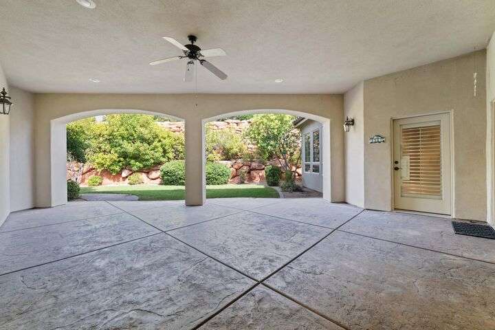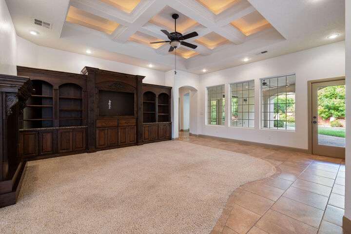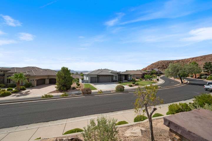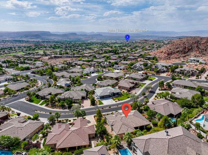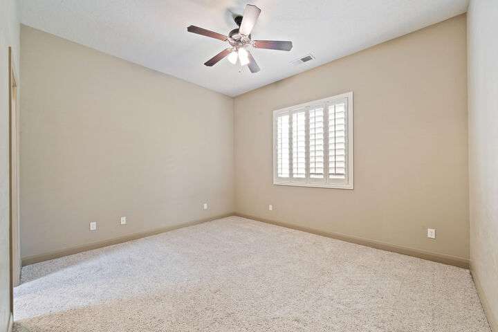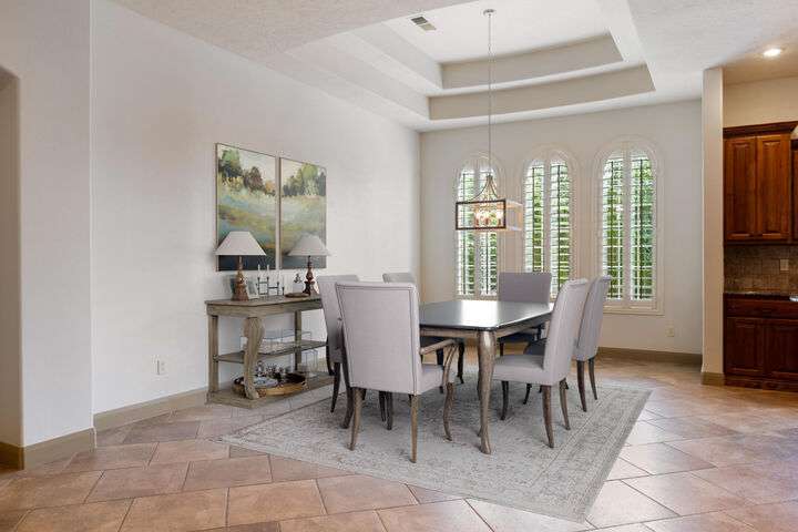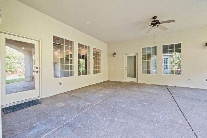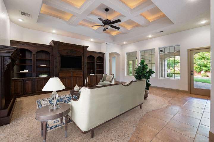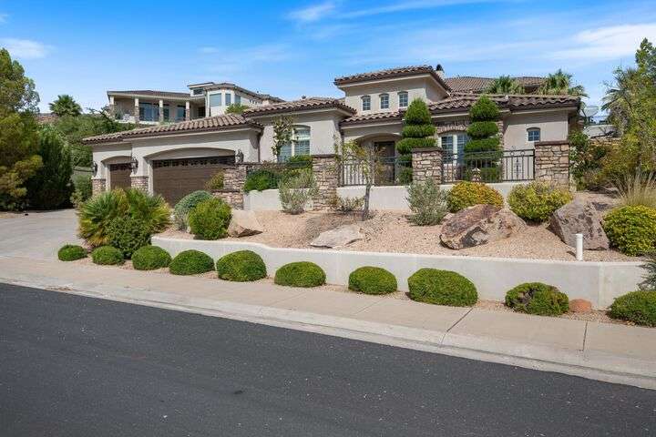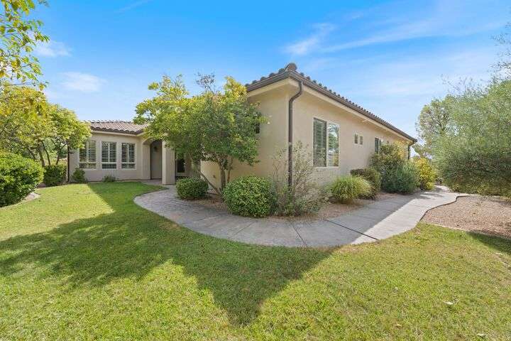 Welcome home to this custom house located in the desirable community of Northbridge at Green Springs. The home features an inviting layout with spacious rooms, coffered ceilings, an open dining and kitchen area, and easy access to outdoor living spaces. The entry and front courtyard offer beautiful views of the Desert Reserve and Pine Valley Mountains. The primary suite is privately situated with access to the outdoor living space, and the primary bathroom includes a soaking tub and a walk-in stone surround shower. There is a flex room that can serve as an office or guest suite, along with two additional guest suites with en suite bathrooms. The beautifully manicured backyard with mature trees provides a wonderful space for quiet mornings and for evening entertaining.