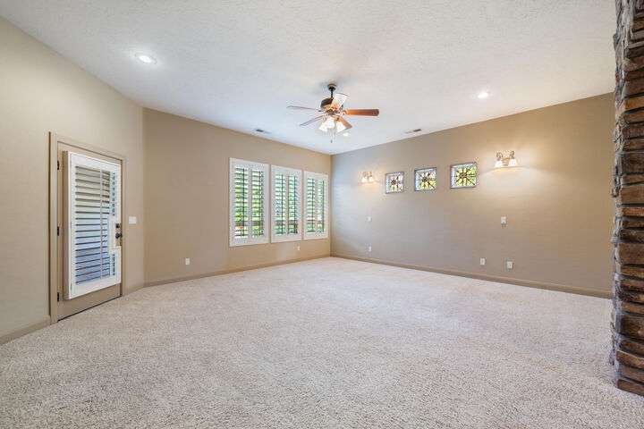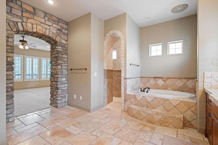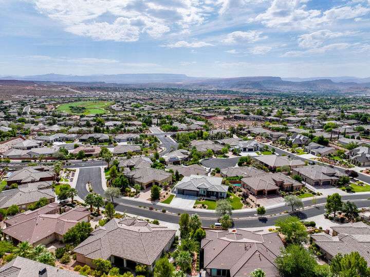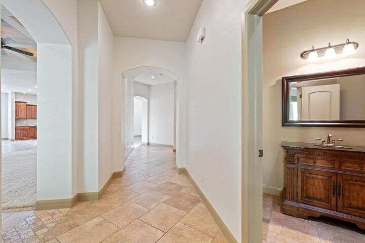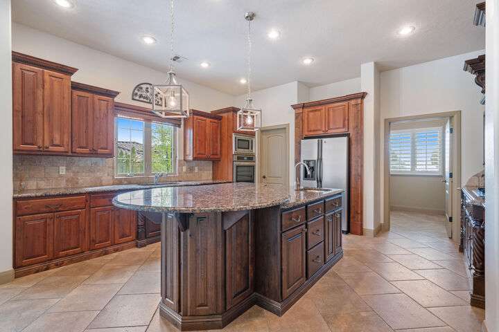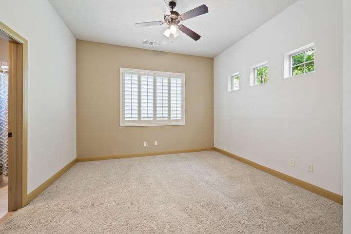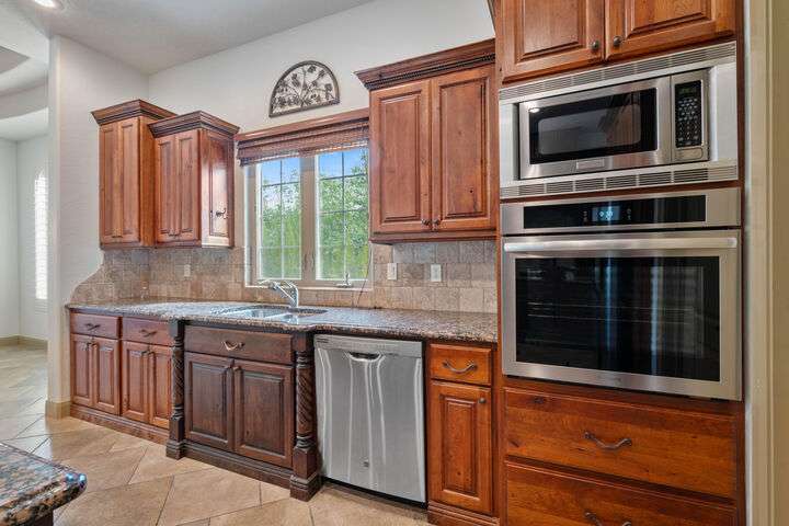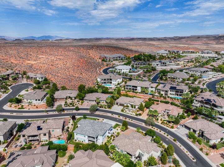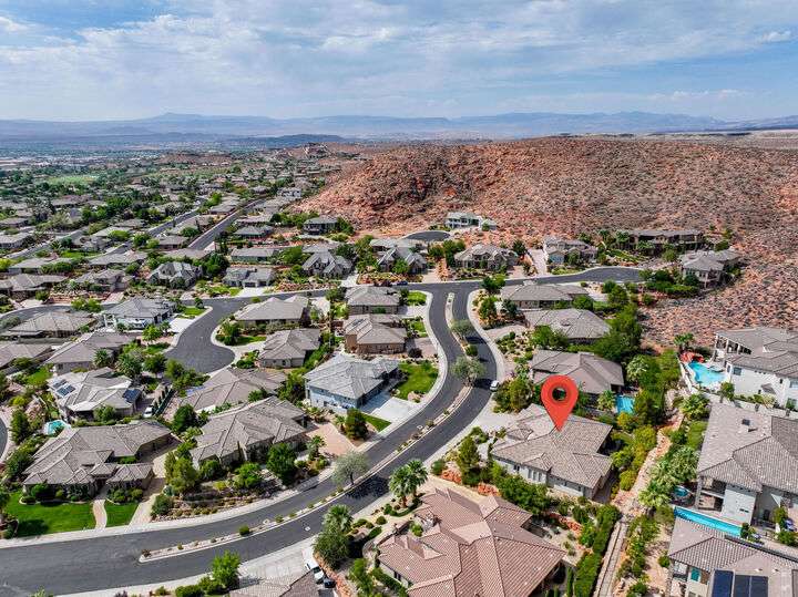 Welcome home to this custom house located in the desirable community of Northbridge at Green Springs. The home features an inviting layout with spacious rooms, coffered ceilings, an open dining and kitchen area, and easy access to outdoor living spaces. The entry and front courtyard offer beautiful views of the Desert Reserve and Pine Valley Mountains. The primary suite is privately situated with access to the outdoor living space, and the primary bathroom includes a soaking tub and a walk-in stone surround shower. There is a flex room that can serve as an office or guest suite, along with two additional guest suites with en suite bathrooms. The beautifully manicured backyard with mature trees provides a wonderful space for quiet mornings and for evening entertaining.