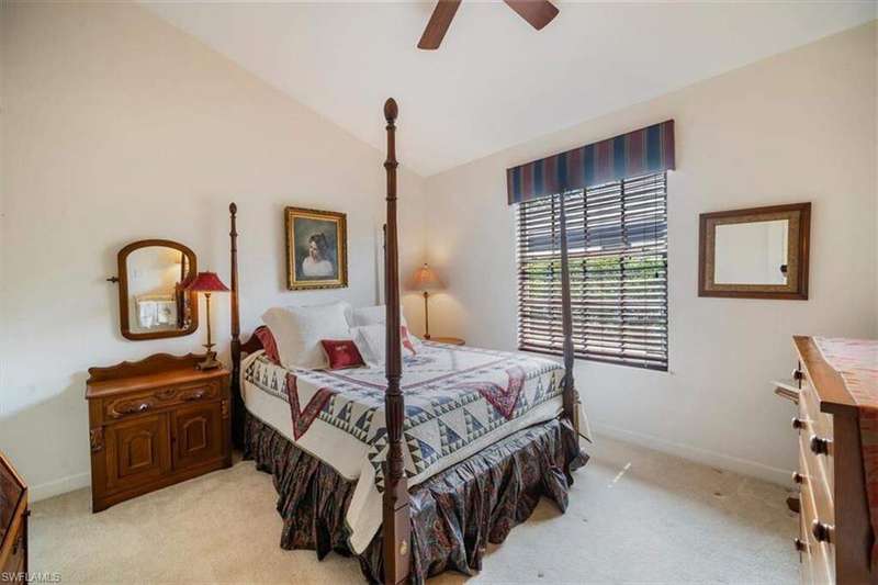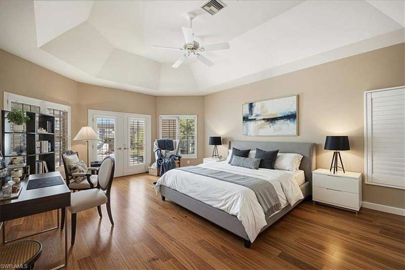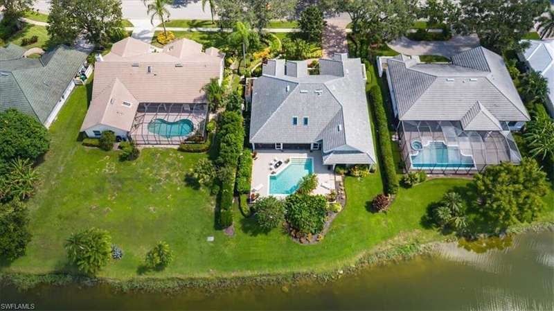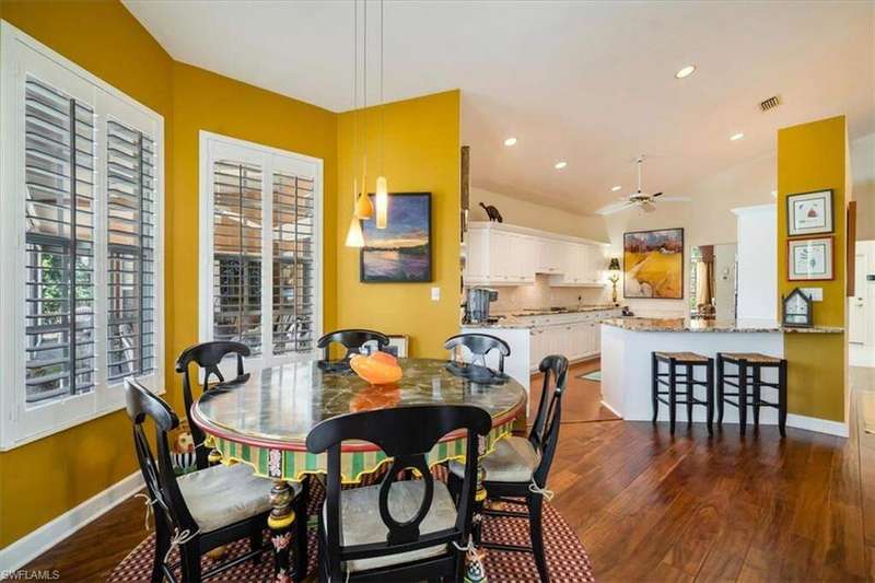 This beautifully maintained home in the Vineyards offers timeless style and easy Florida living on a southwest-facing lakefront lot with lush landscaping, great curb appeal, and a brand-new roof completed in 2023. A double-door entry with glass accents and a palladian window opens to soaring 12' ceilings, hardwood floors through the main living areas include: living room, dining room, family room, breakfast nook and hallways. Sunny and brightly lit home sparkles with natural light. The formal dining room shows off decorative millwork, a dramatic picture window with custom draperies, and tall ceilings, while the living room features hardwood floors, sliders that fully pocket to the lanai, and a welcoming flow. The kitchen blend's function and charm with white cabinetry, cork flooring, granite counters, stone backsplash, stainless appliances, and an oversized sink overlooking a pass-through window to the lanai. A bay-window breakfast nook with pendant lighting opens to the bright family room with plantation shutters, sliders to the lanai, and a wet bar perfect for entertaining. The owner's suite is a true retreat with its own vestibule, three closets, French door access to the pool, and a spa-inspired bath with oversized vanity, separate makeup space, floating soaking tub, walk-in seamless shower, and enclosed water closet. Two guest suites offer comfort and privacy, and a separate den with vaulted ceilings, built-ins, and a large picture window that works as a home office or optional fourth bedroom. Outdoor living is easy with an expansive covered and screened lanai featuring paver decking, recessed lighting, a ceiling fan, and electric shutters, all overlooking sparkling lake views. Additional highlights include an oversized paver driveway and walkways, a 2-car garage with attic access, and a laundry room with utility sink. With southwest exposure filling the home with light, you'll love the relaxed vibe, and while Vineyards doesn't require club membership, options are available to enjoy two 18-hole golf courses, a racquet center with 12 Har-Tru tennis courts (six lit for night play) and eight gel-cushioned pickleball courts with LED lighting, multiple dining venues, plus a world-class wellness center offering a gym, spa, barber shop, salt cave, and more.