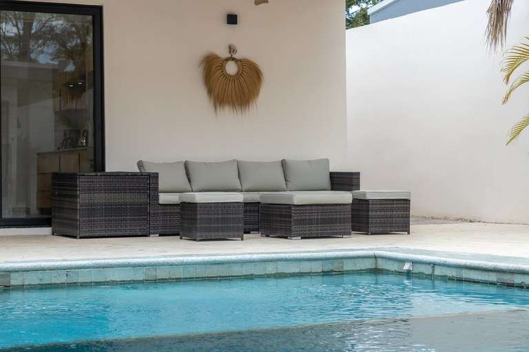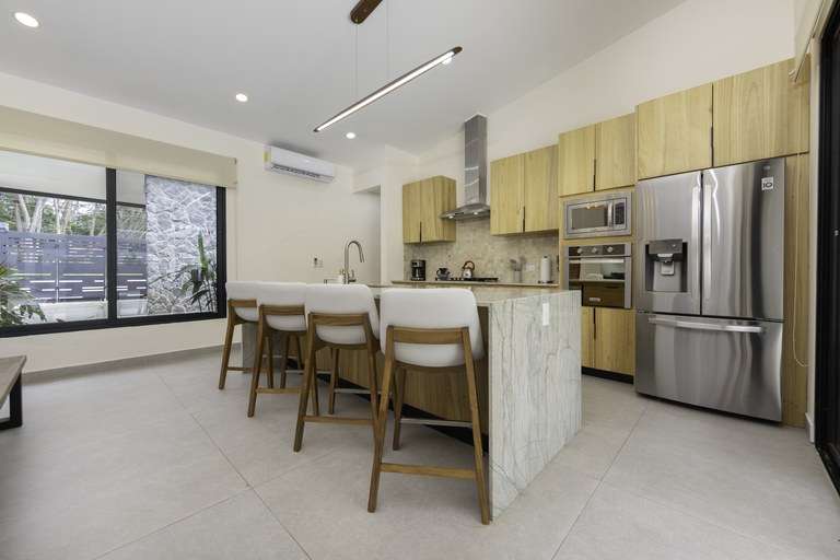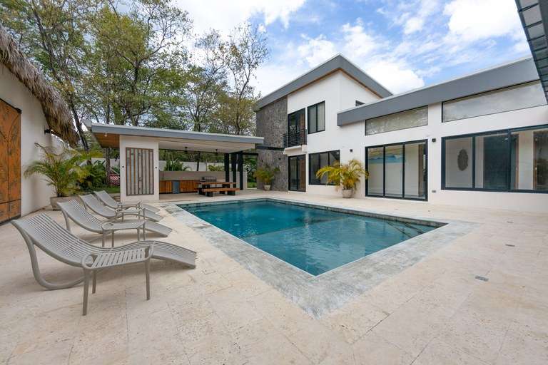 Outdoor living is the heart of Casa Guacamaya Roja. Step outside to a large, deep pool surrounded by lush landscaping, creating a serene private oasis. The outdoor kitchen and grill area, complete with a dining space, make al fresco entertaining effortless. A covered carport accommodates up to four vehicles, while the landscaped front yard provides a warm tropical welcome.